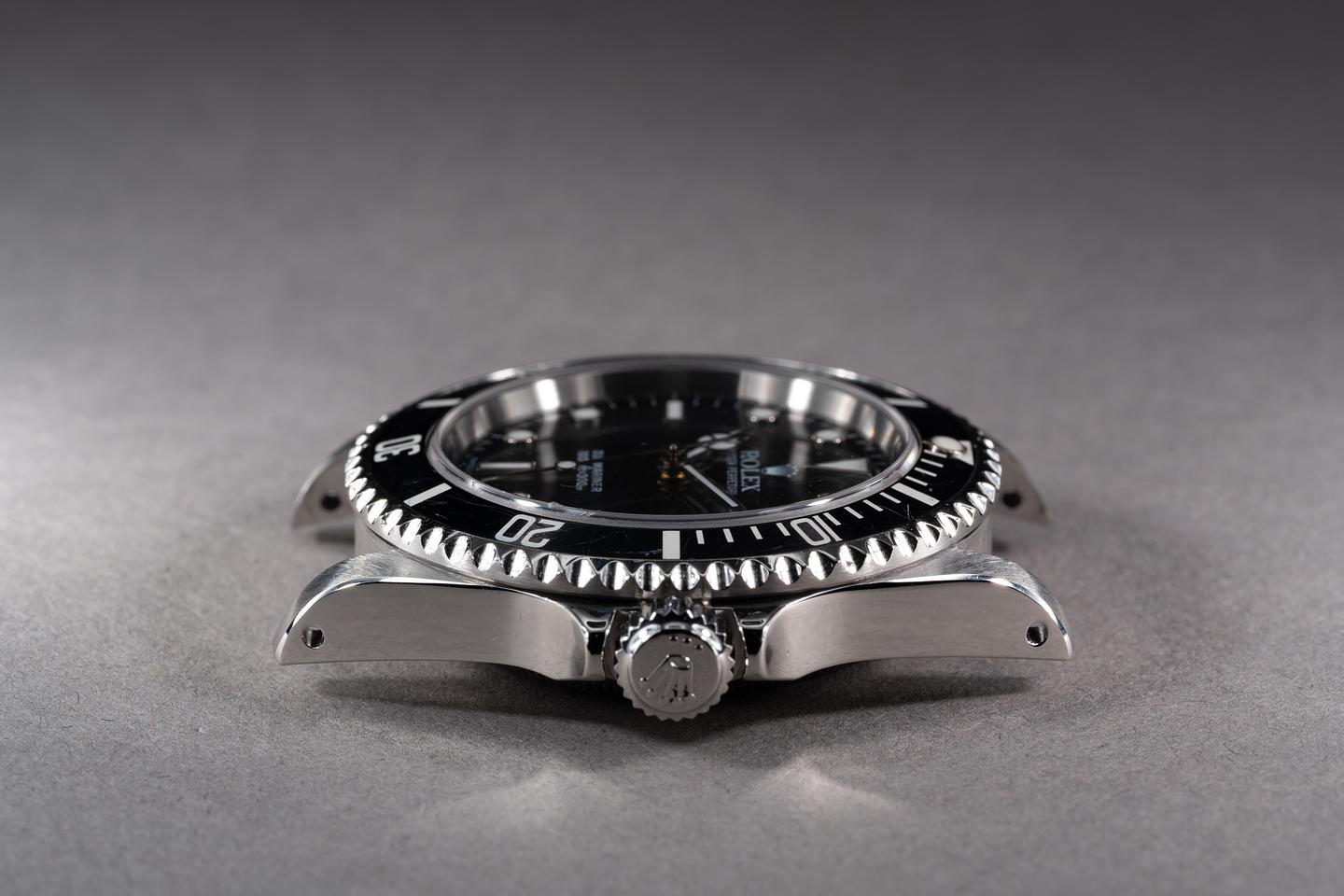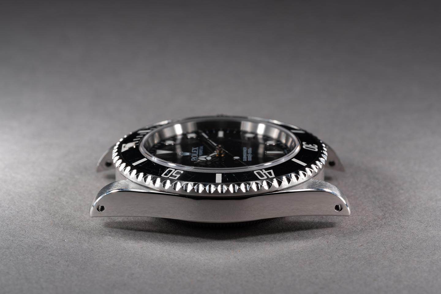 Case: The recently polished case is excellent showing only very light wear from use. The black bezel insert has some light wear from use and has aged to a dark blue navy hue.