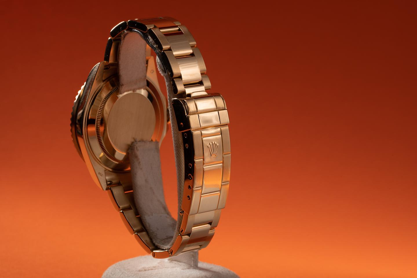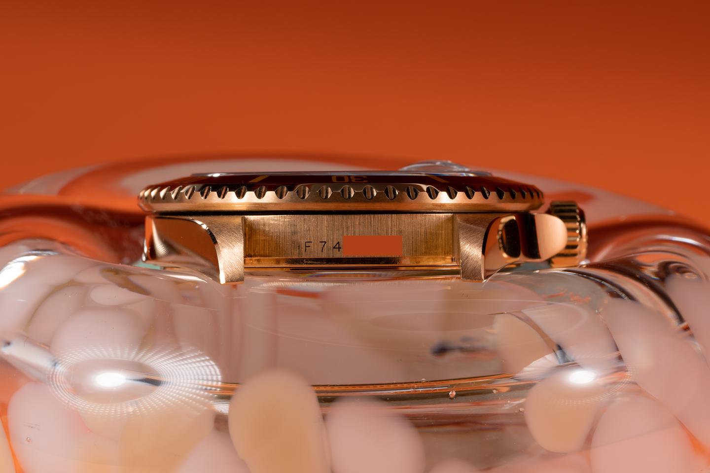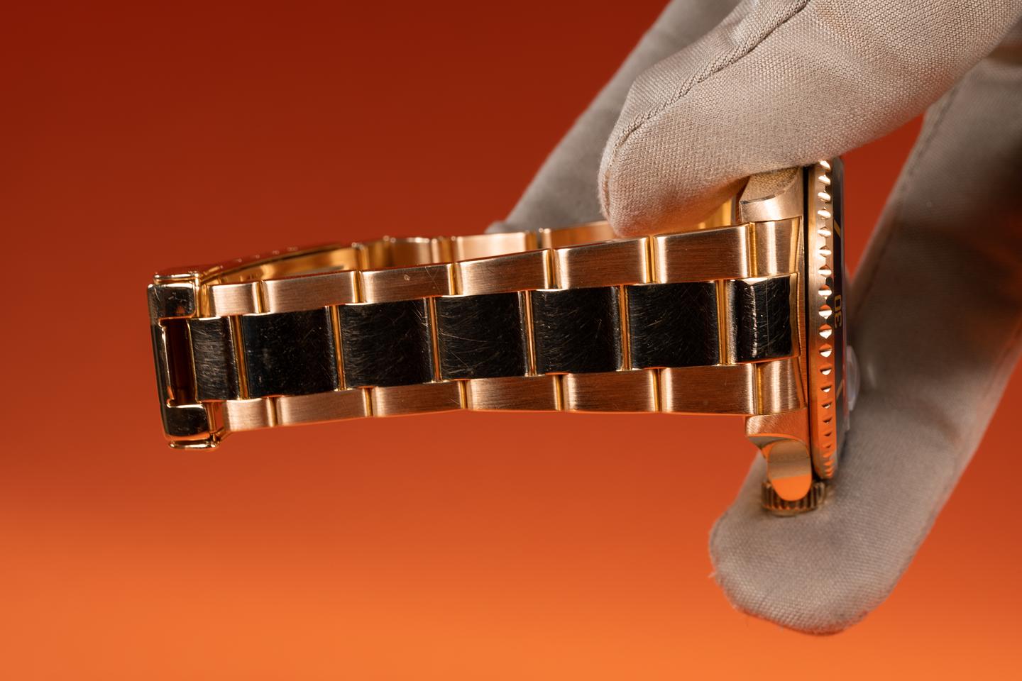 Case: The thick and even 18k yellow gold case has just returned from polishing showing sharp prominent bevels. The blue bezel insert is also in excellent condition showing only light wear from use.
