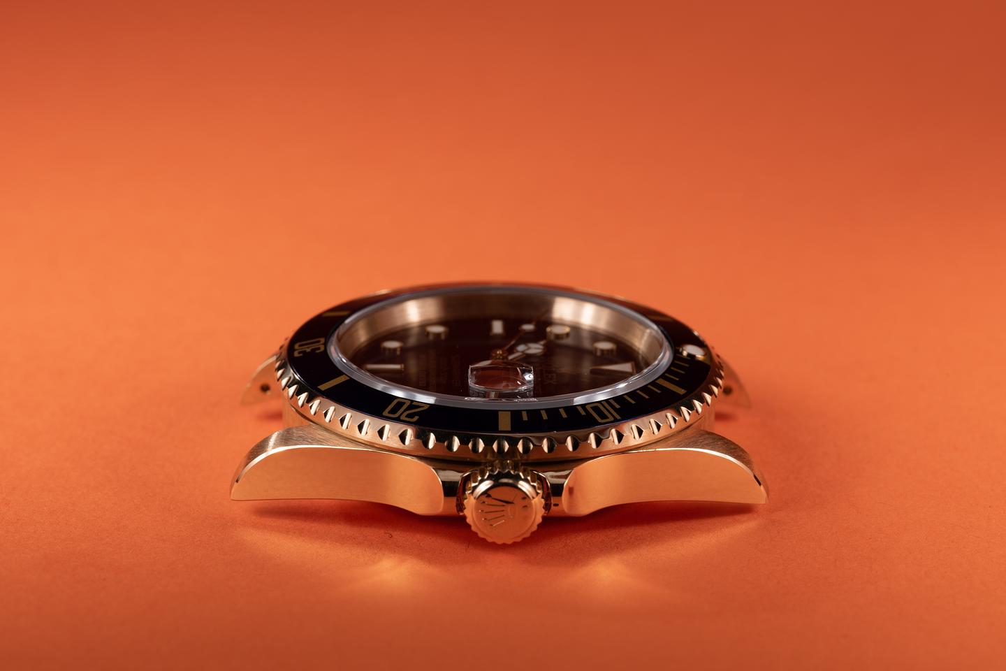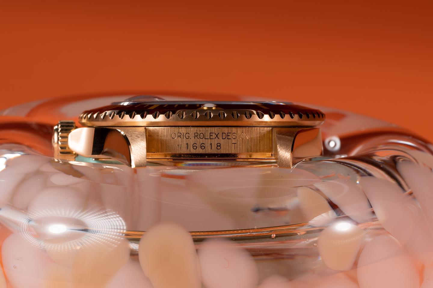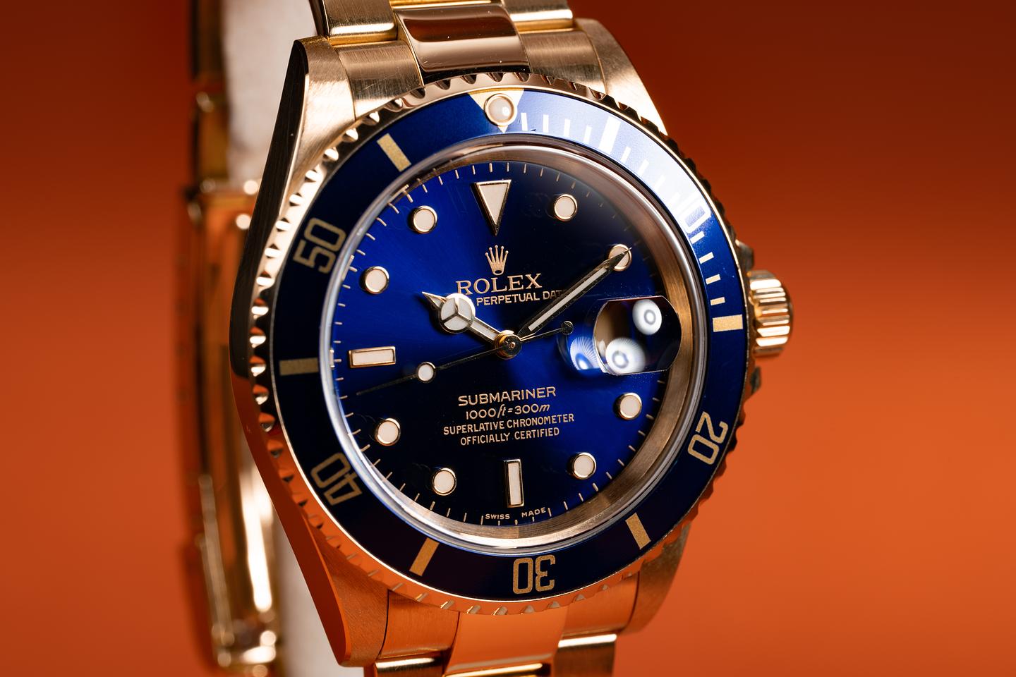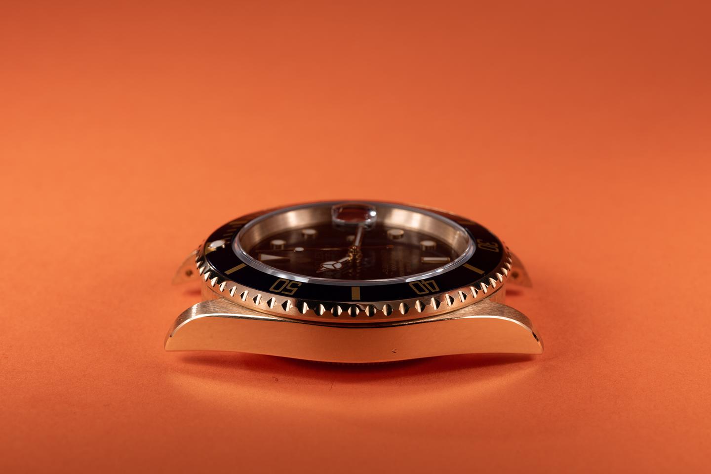 Case: The thick and even 18k yellow gold case has just returned from polishing showing sharp prominent bevels. The blue bezel insert is also in excellent condition showing only light wear from use.