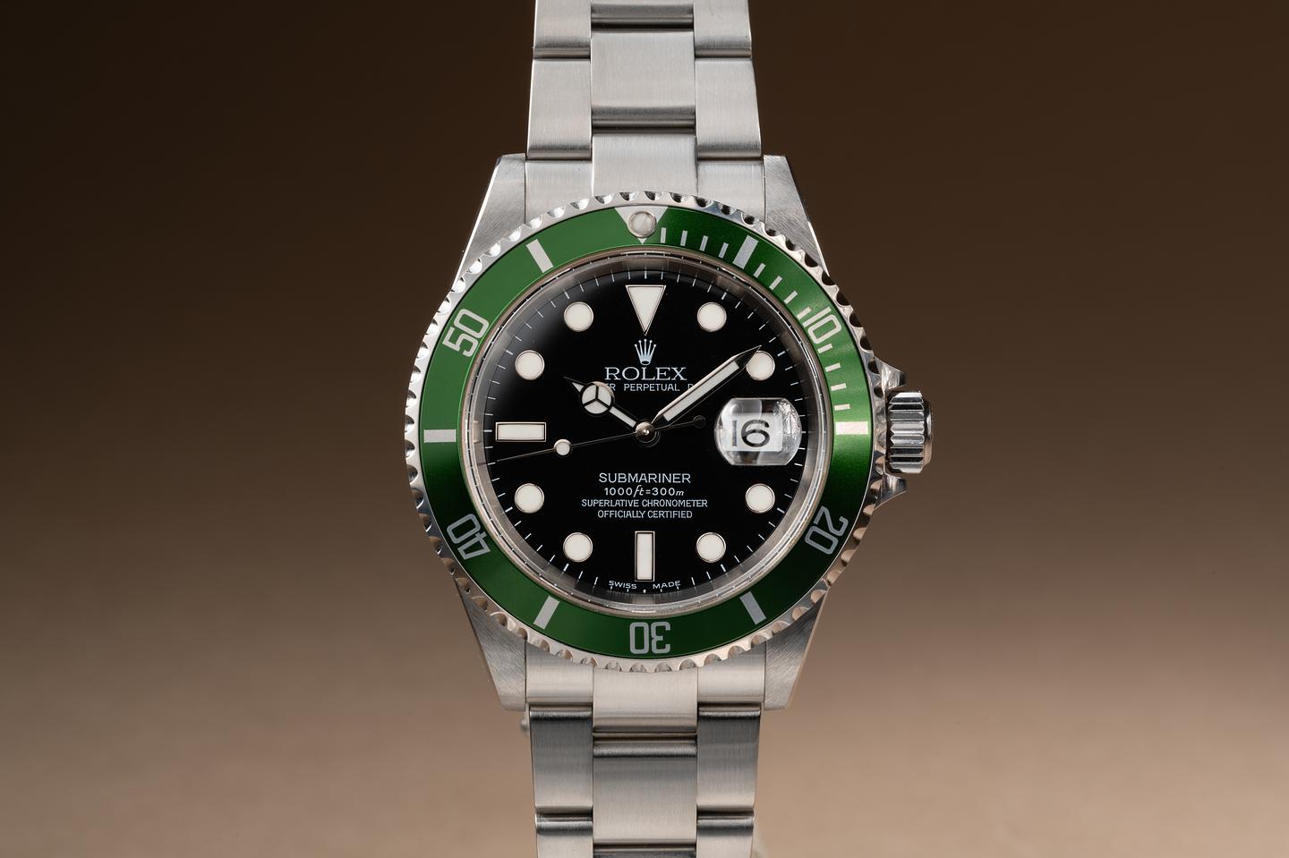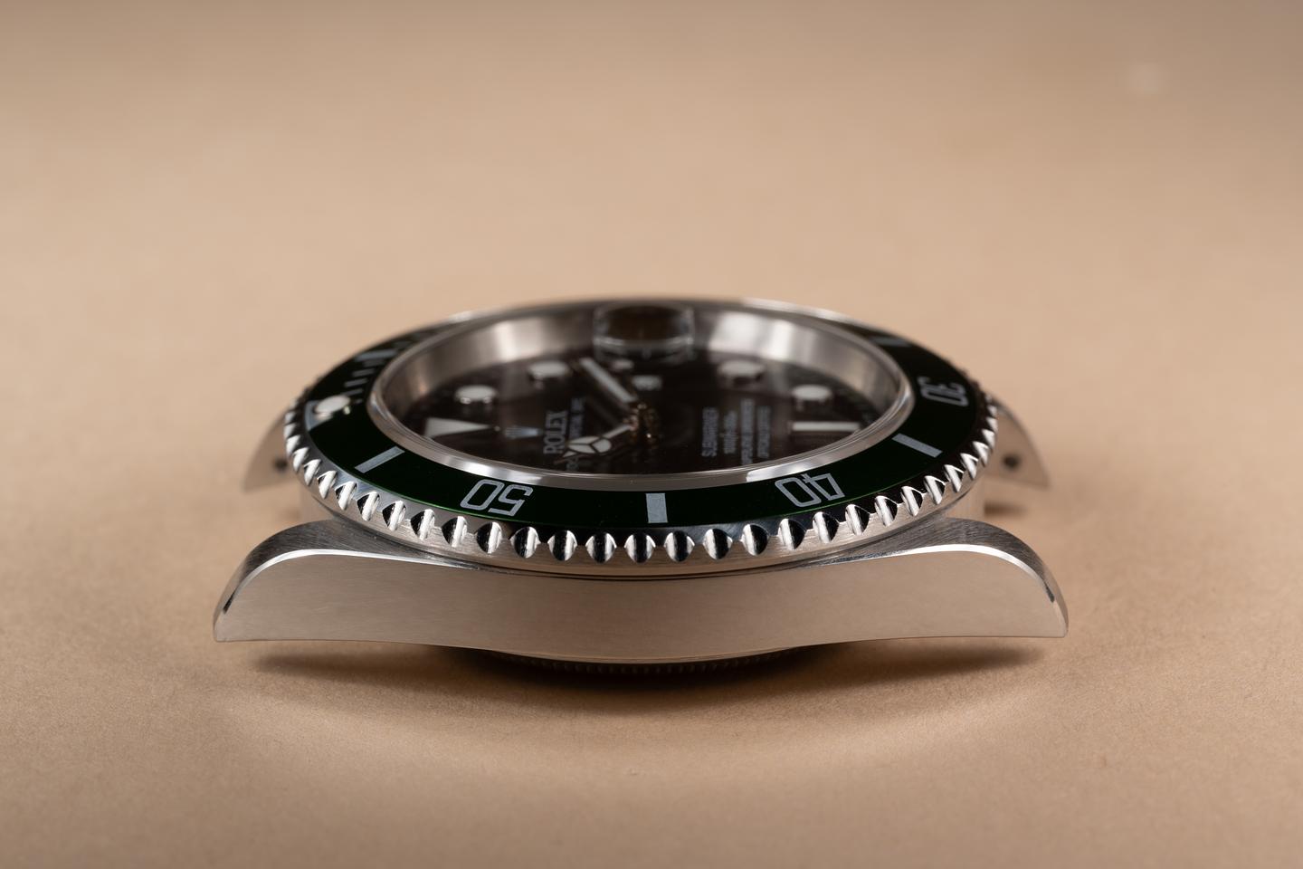 Case: The recently polished case is excellent showing sharp prominent bevels. The flat 4 green bezel insert is also in excellent condition showing only light wear from use.