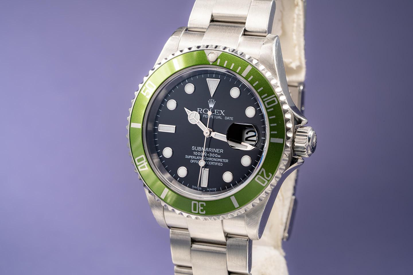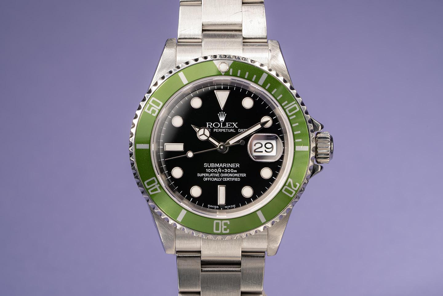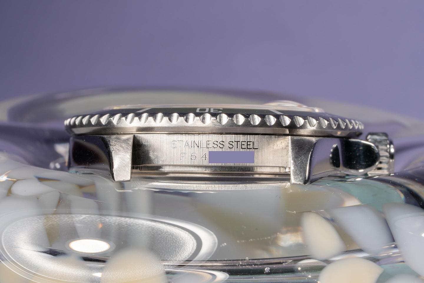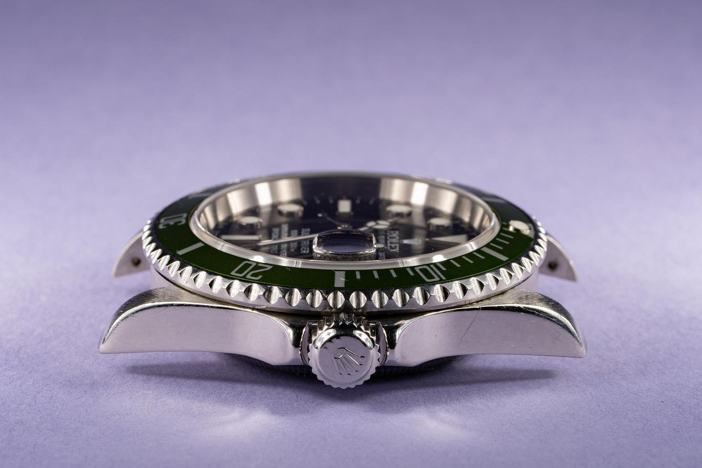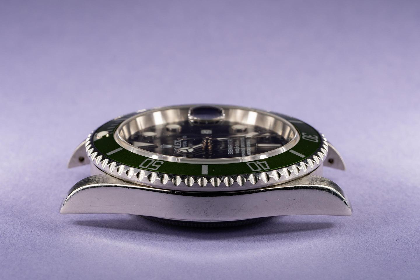 Case: Excellent case that has previosuly been polished and shows some wear from use. The green flat 4 bezel insert is excellent and shows very light wear overall.