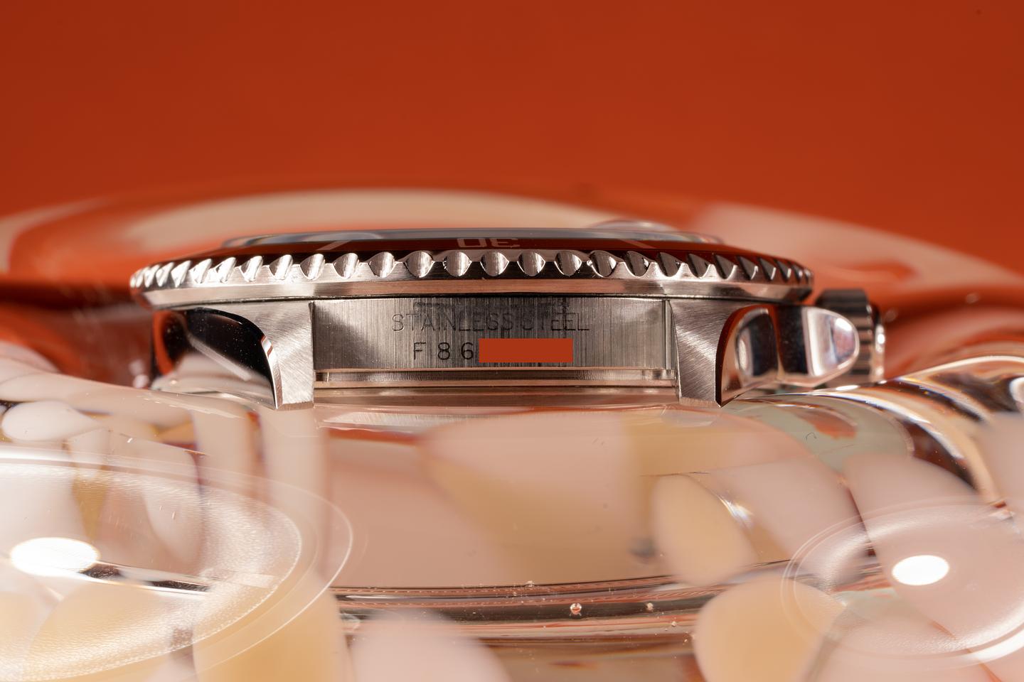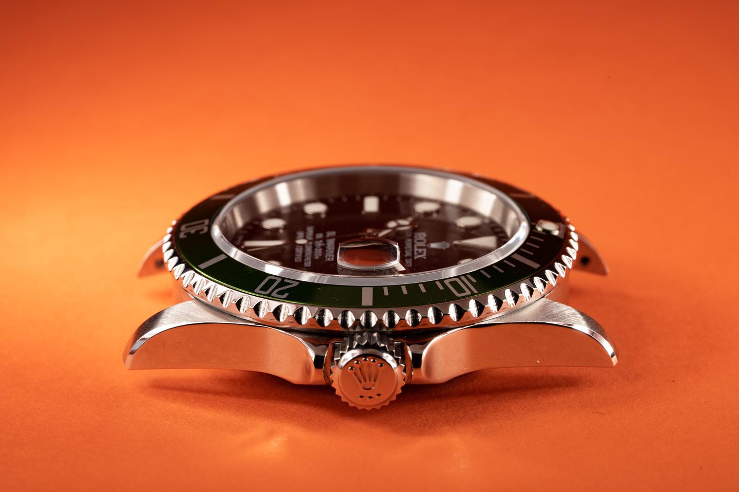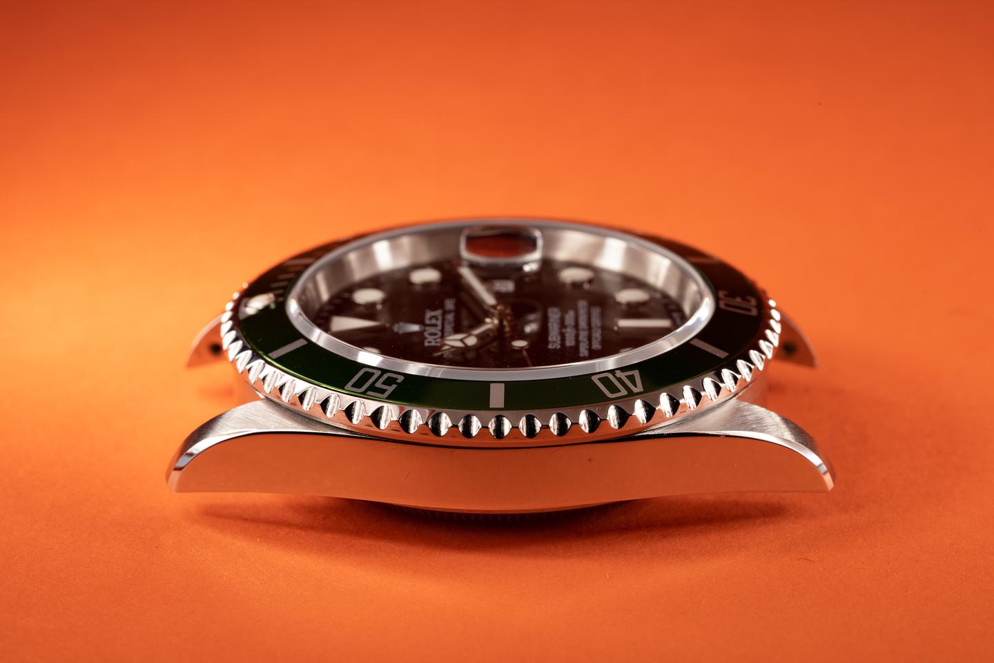 Case: The recently polished case shows only very light wear and features sharp and prominent bevels. The green bezel insert is excellent and has light fading present.