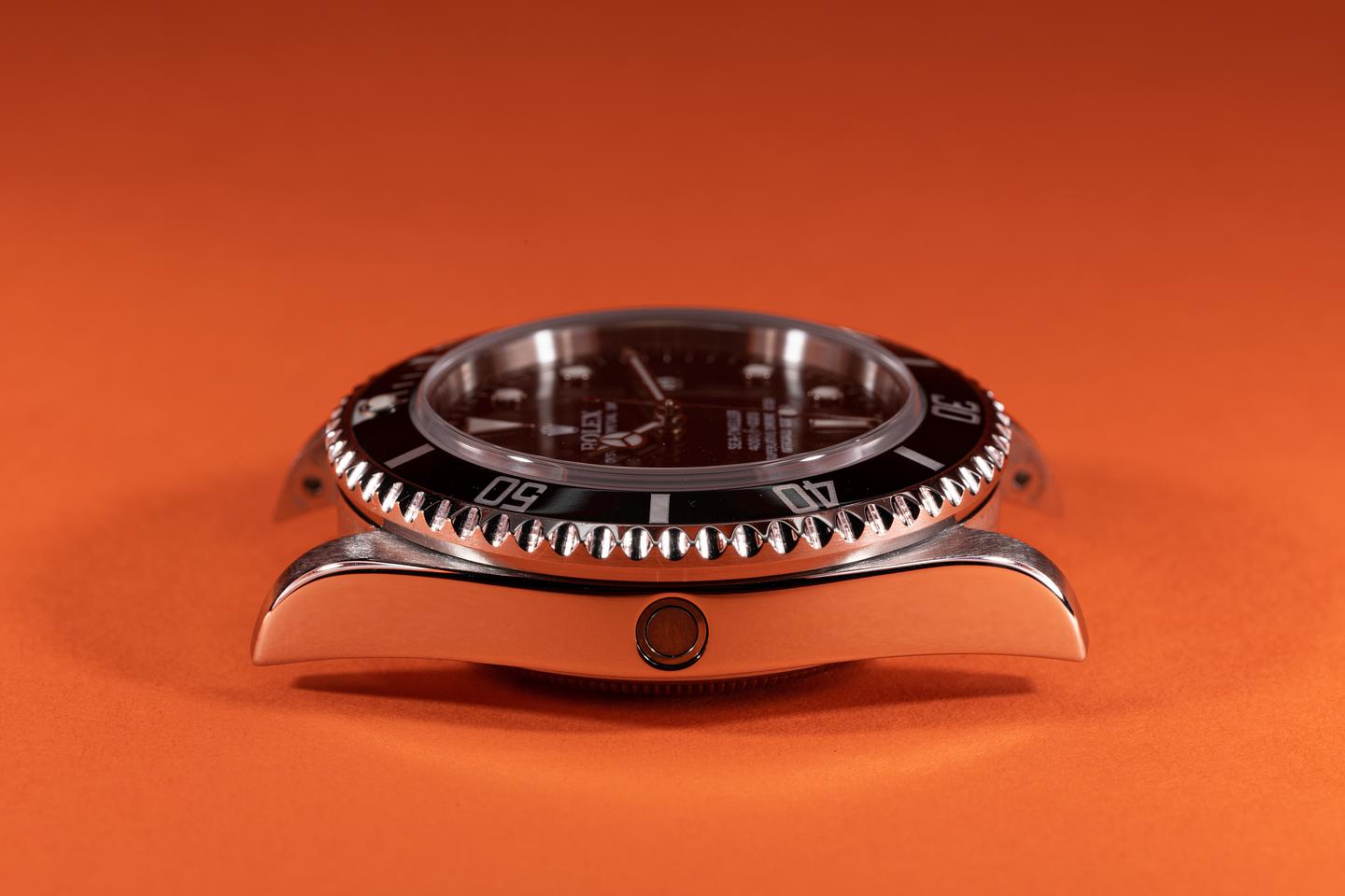 Case: The thick and even case is excellent showing only very light wear from use. The black bezel insert is also in excellent condition showing only very light wear.
