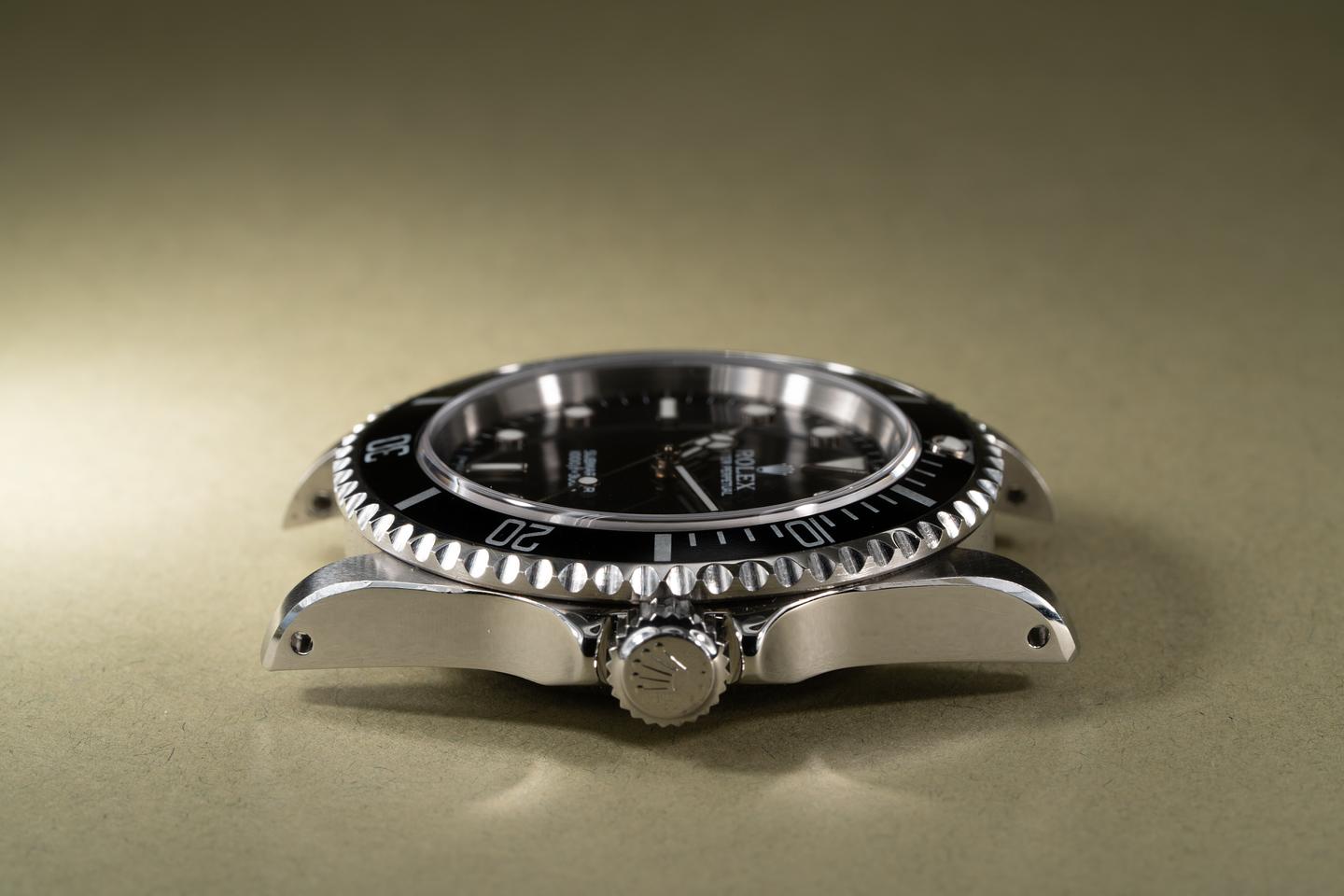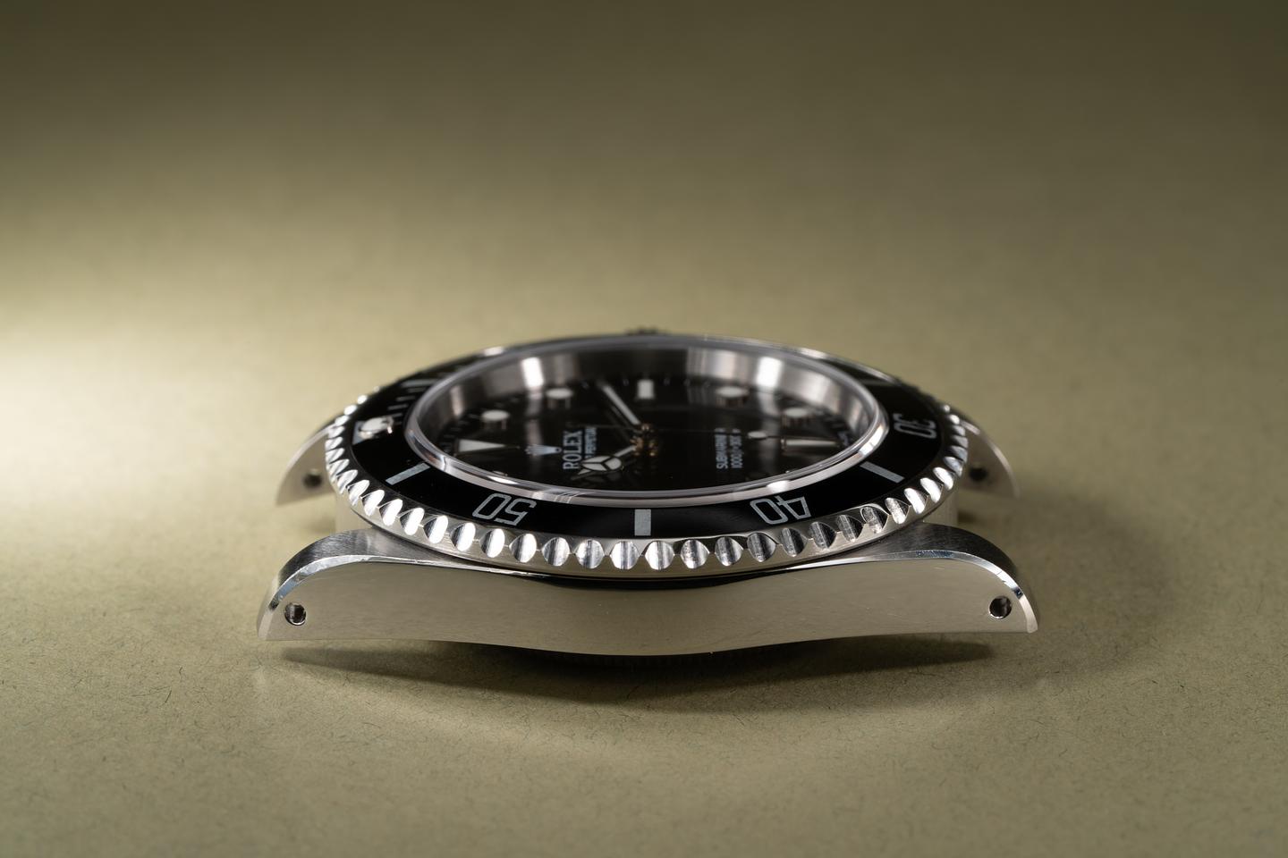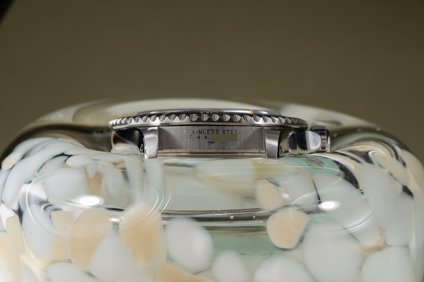 Case: The previously polished case is excellent showing sharp prominent bevels and only light wear from use. The black bezel insert is also in excellent condition showing only light wear from use.