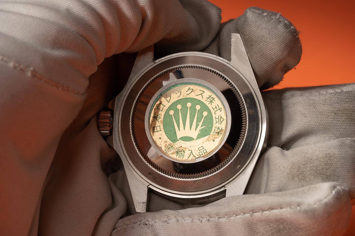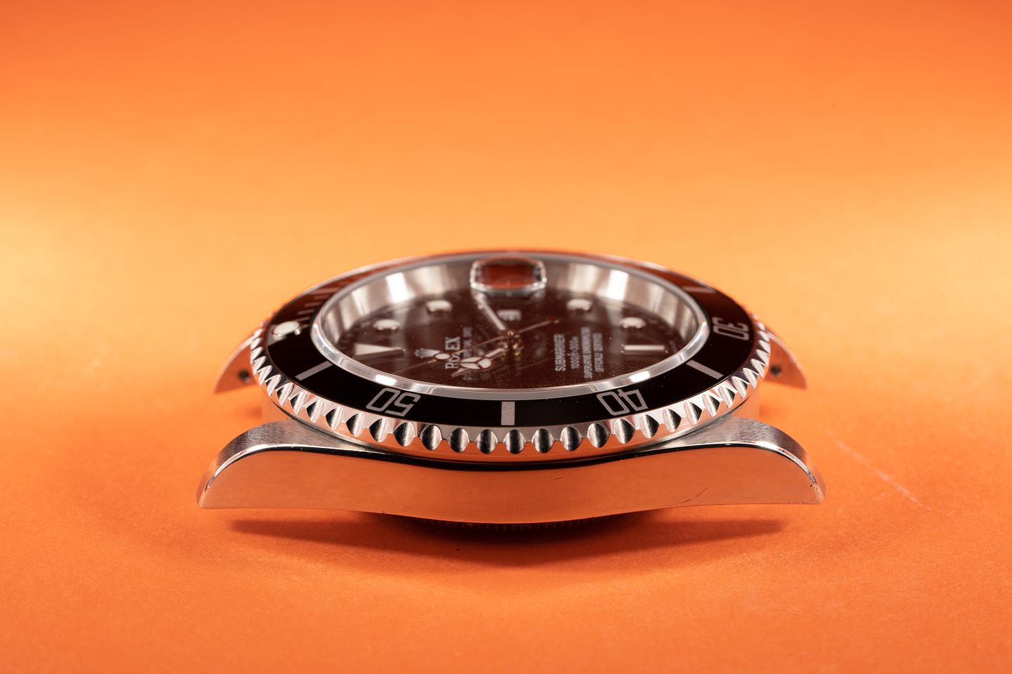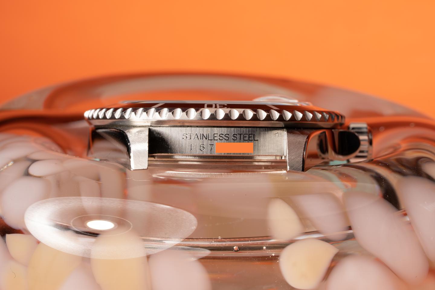 Case: Excellent thick case with sharp prominent bevels that show very light wear for its age. The original caseback sticker is still intact. The glossy black bezel insert is excellent showing little if any wear.