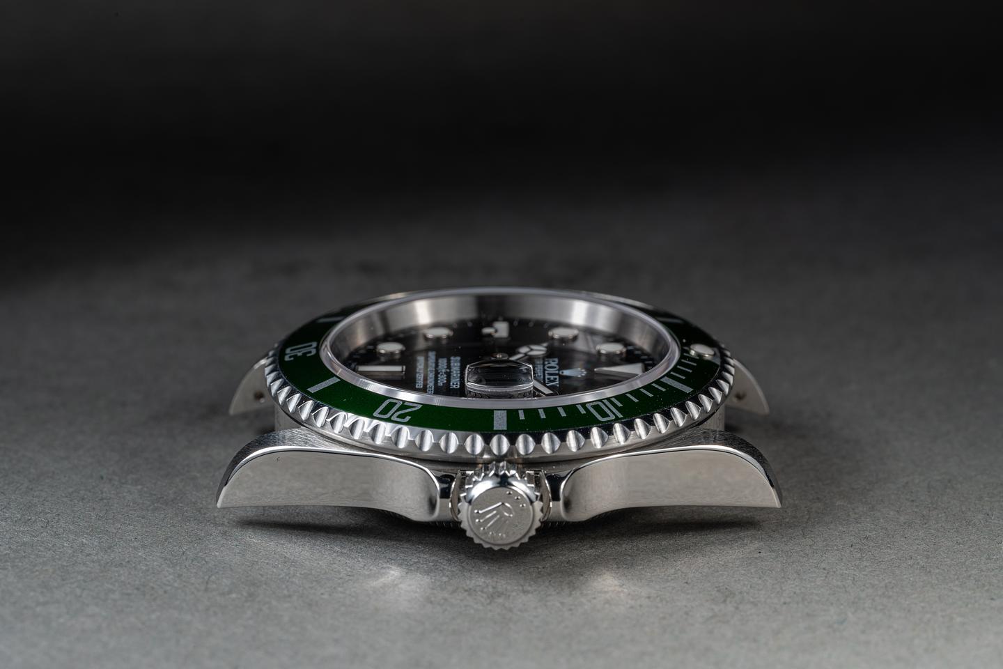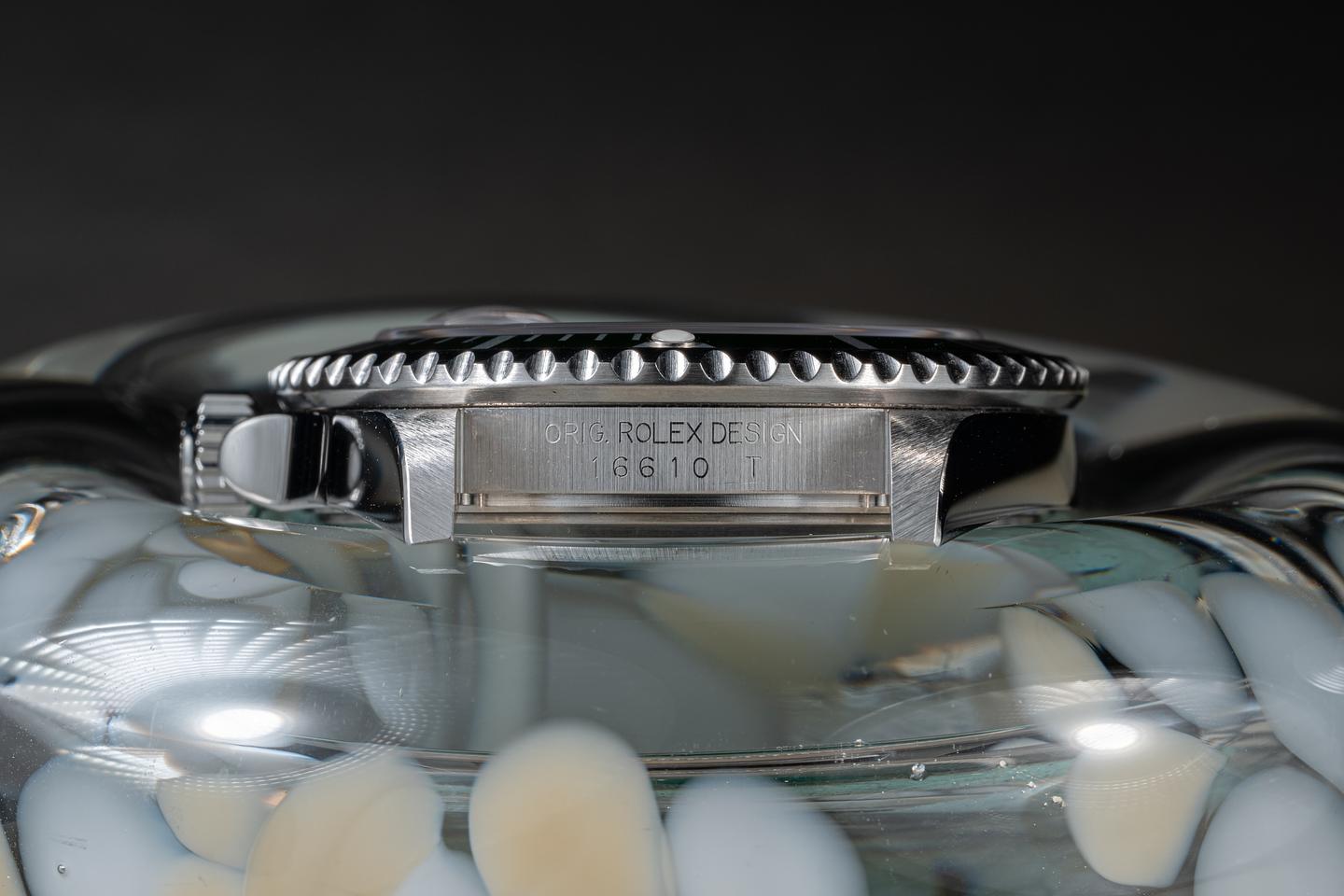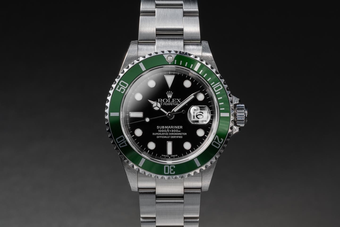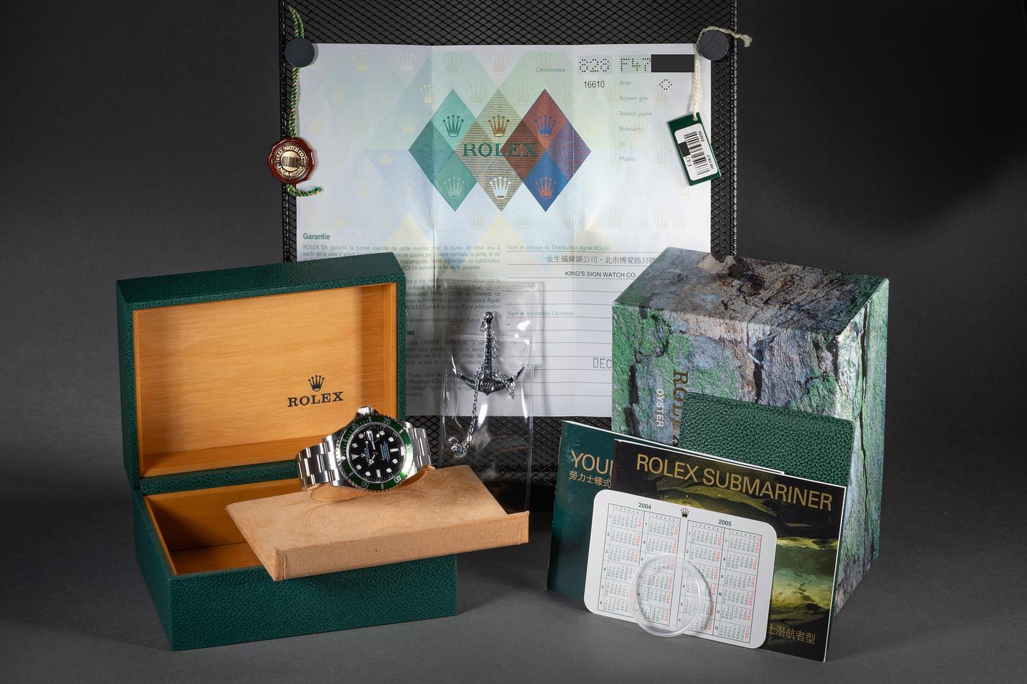 Accessories: Rolex Box, Papers, Submariner Pamphlet, 2004-2005 Calendar, Leather Card Holder, Anchor, Serialized Hang Tag & Bezel Protecter.