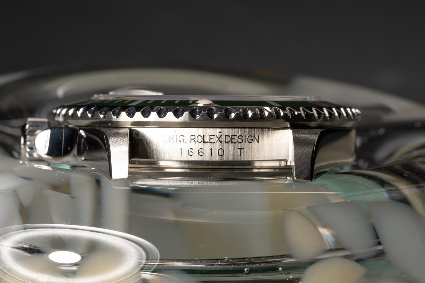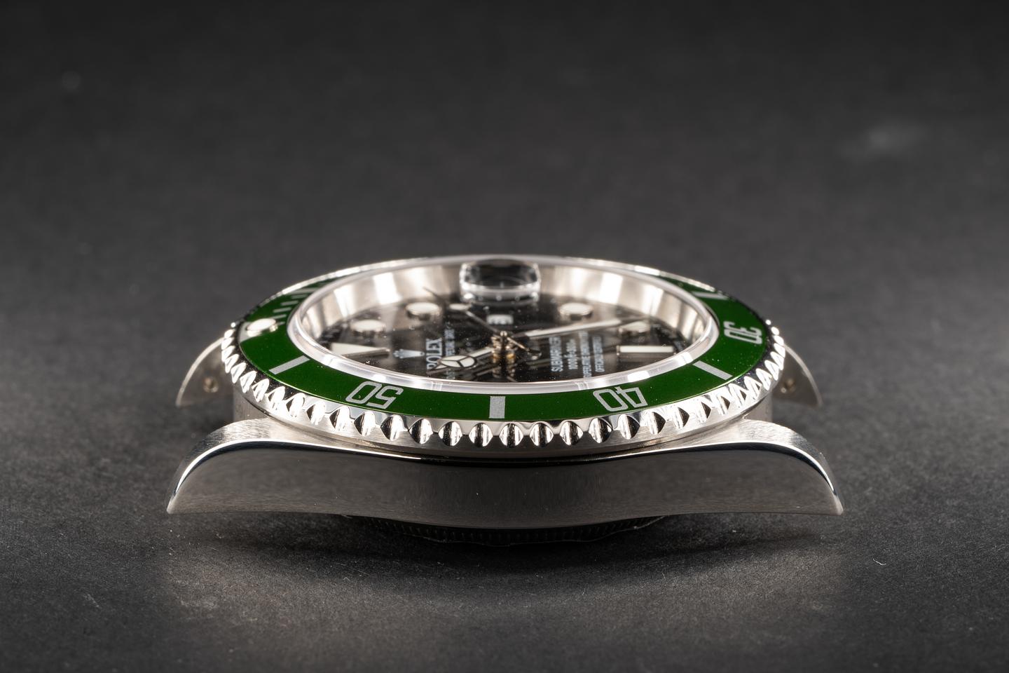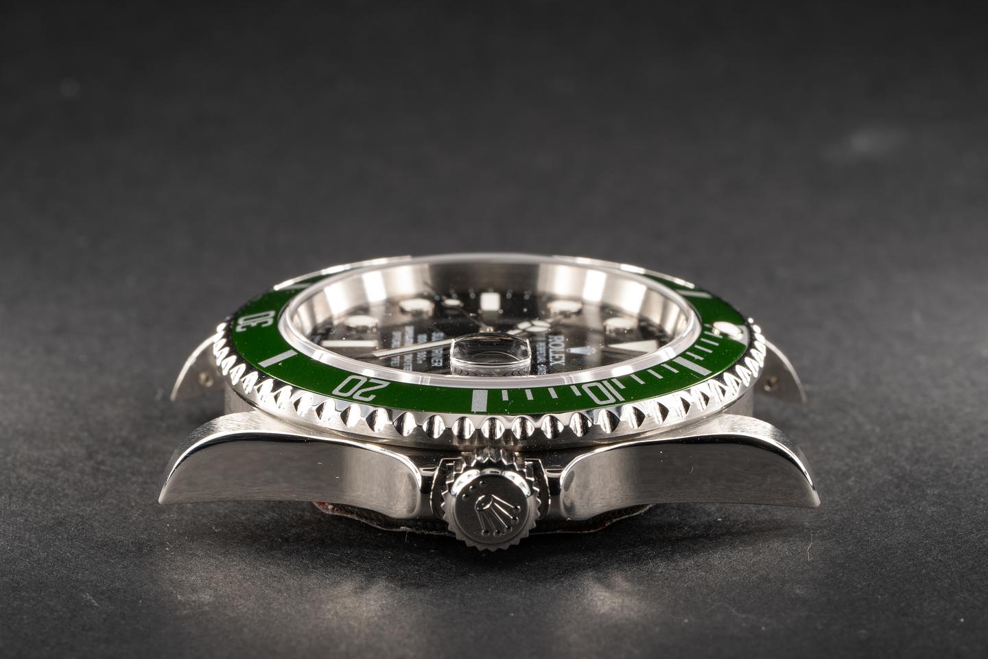 Case: The excellent case with sharp bevels that shows virtually no wear. The green flat 4 bezel insert has begun to lightly shift towards a lime green hue and the insert shows very little if any wear.