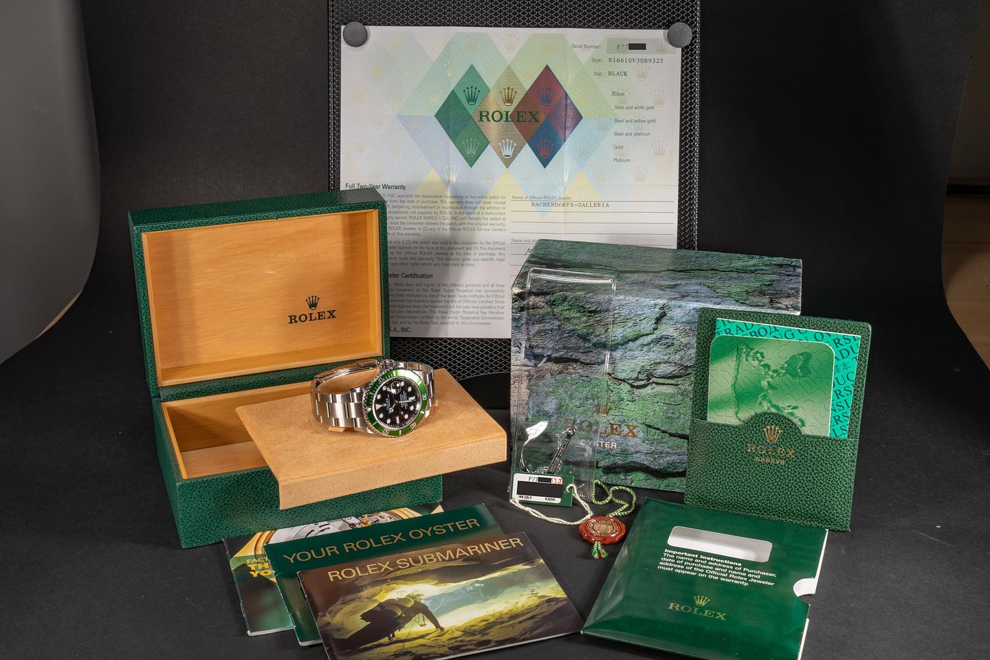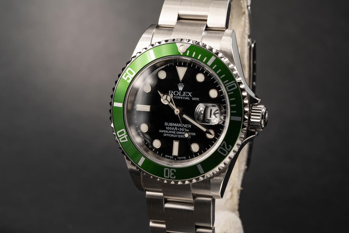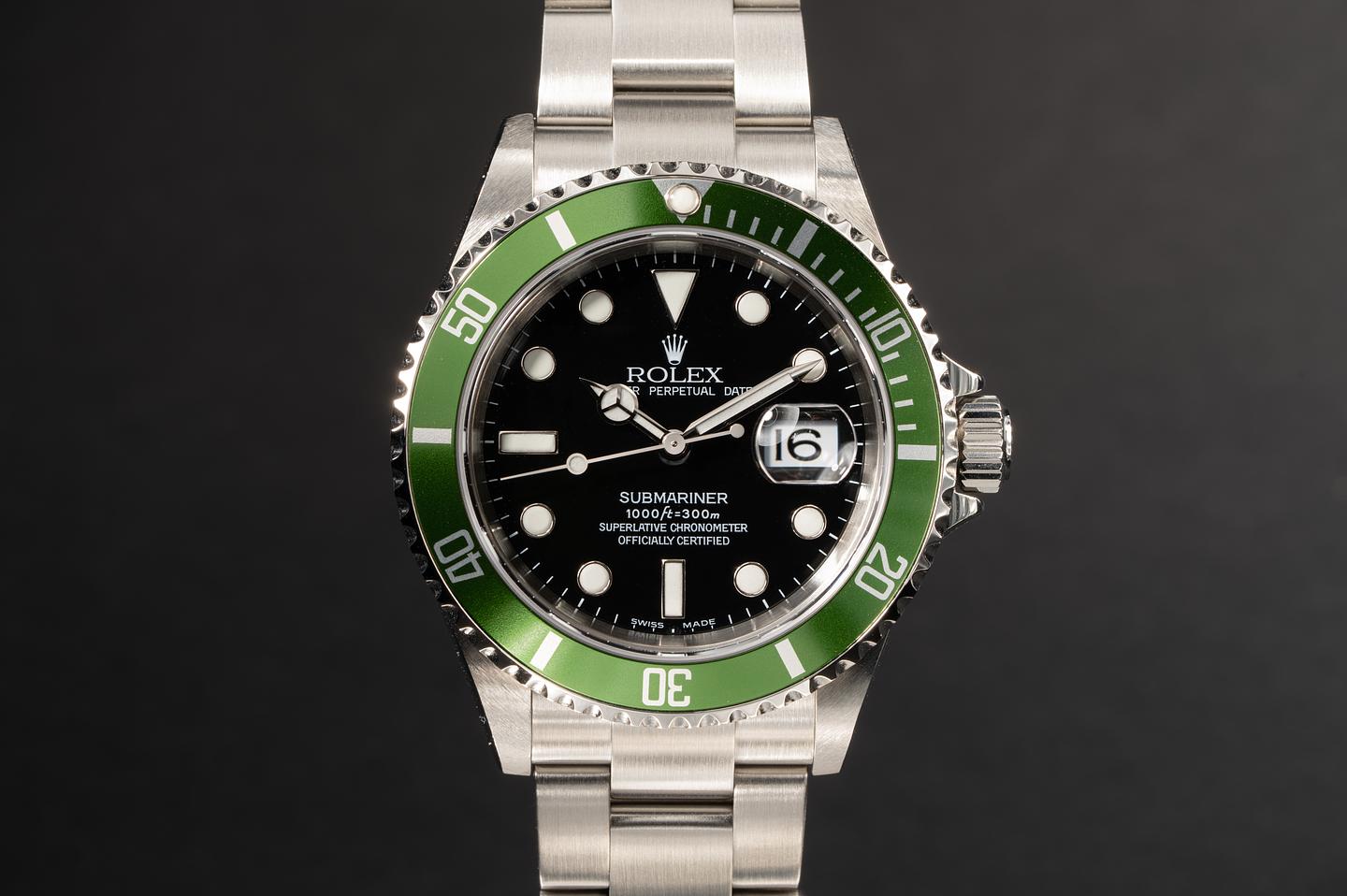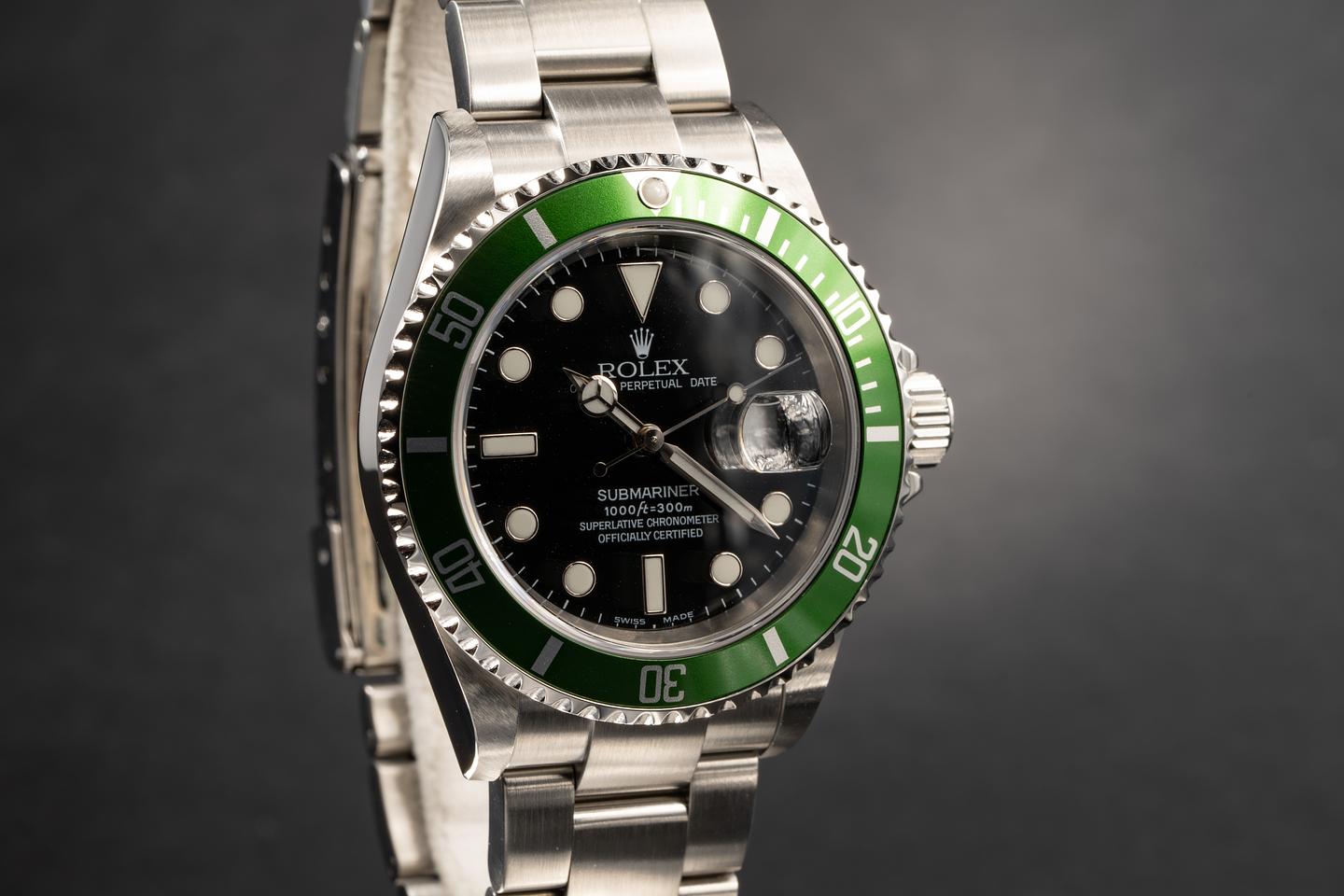 Case: The excellent case with sharp bevels that shows virtually no wear. The green flat 4 bezel insert has begun to lightly shift towards a lime green hue and the insert shows very little if any wear.