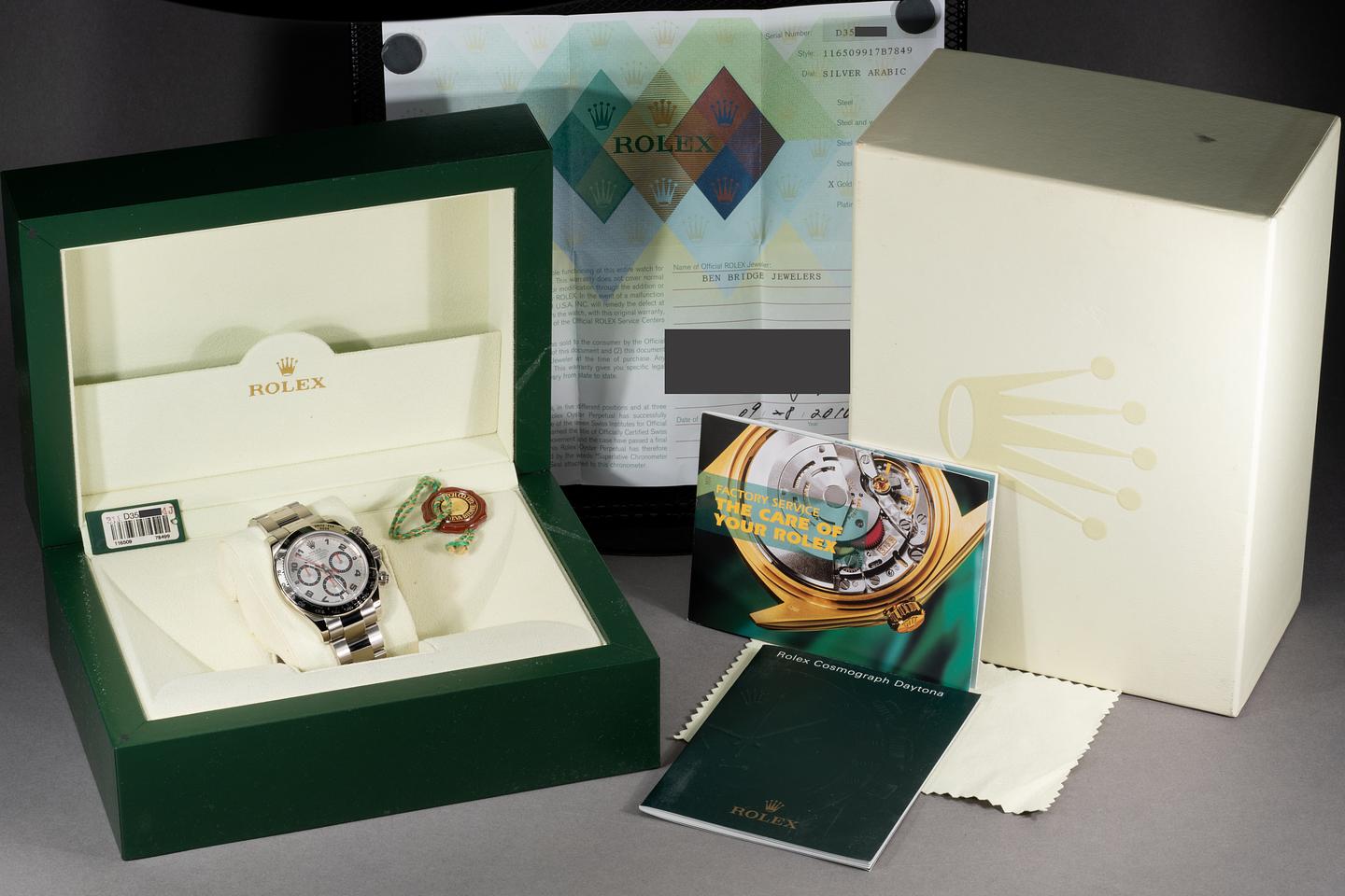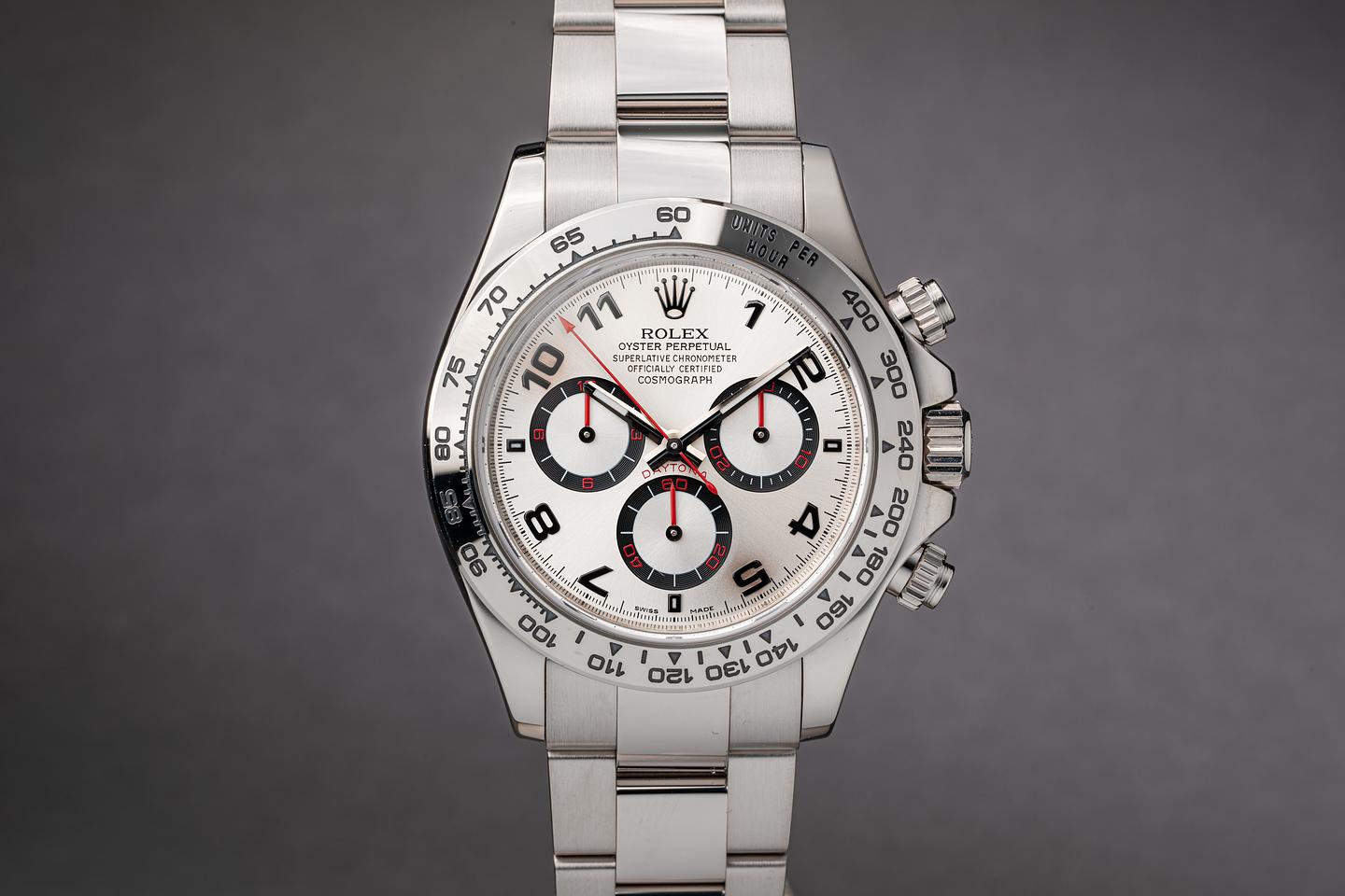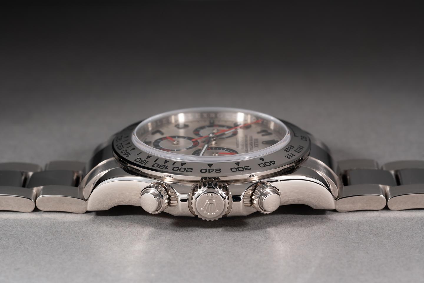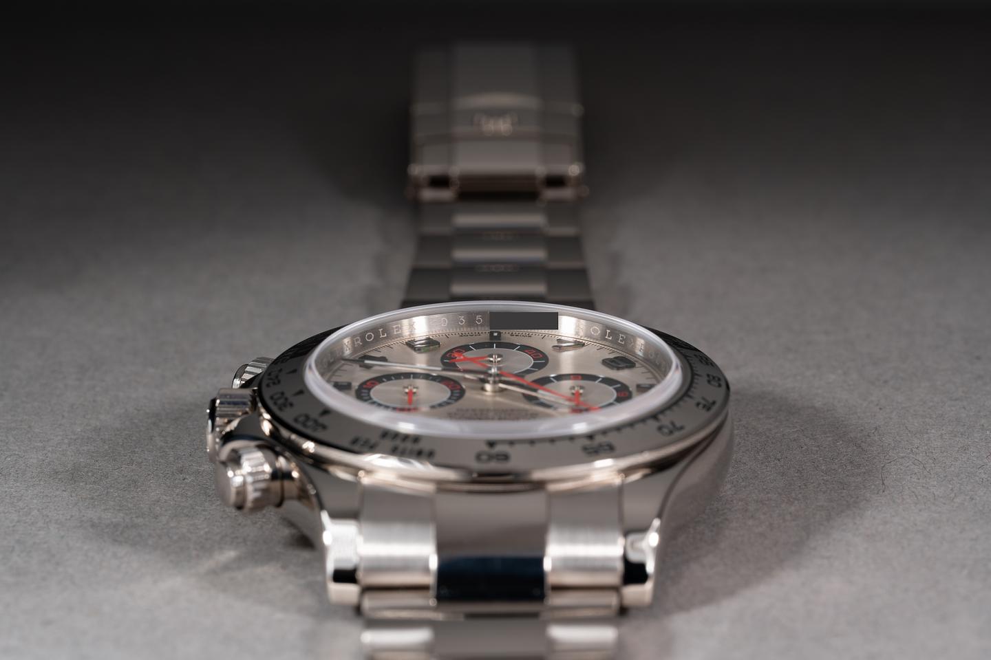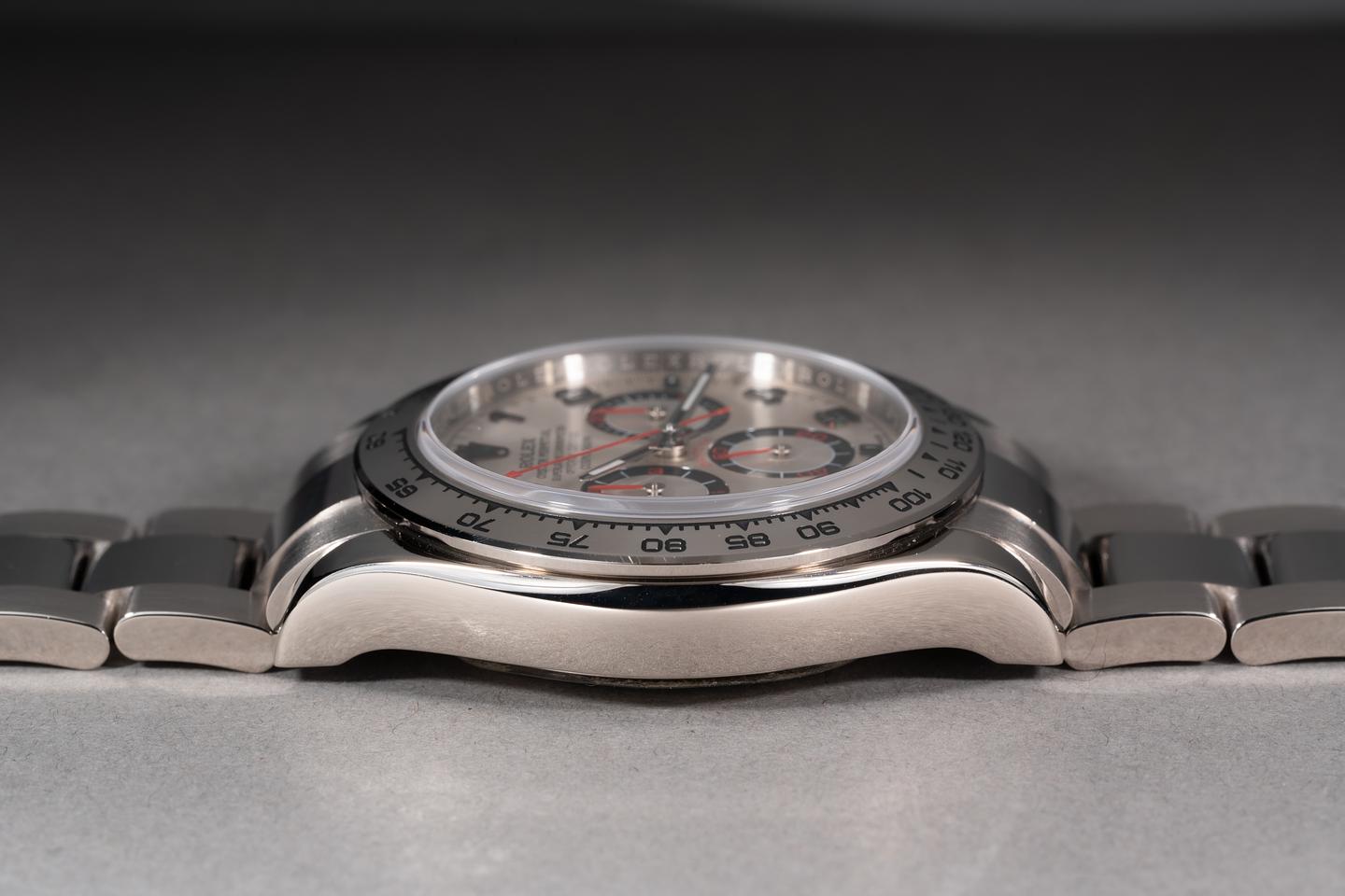 Case: The thick and even 18k white gold case is excellent showing only very light wear from use. The 18k white gold bezel is also in excellent condition showing only very light wear from use.