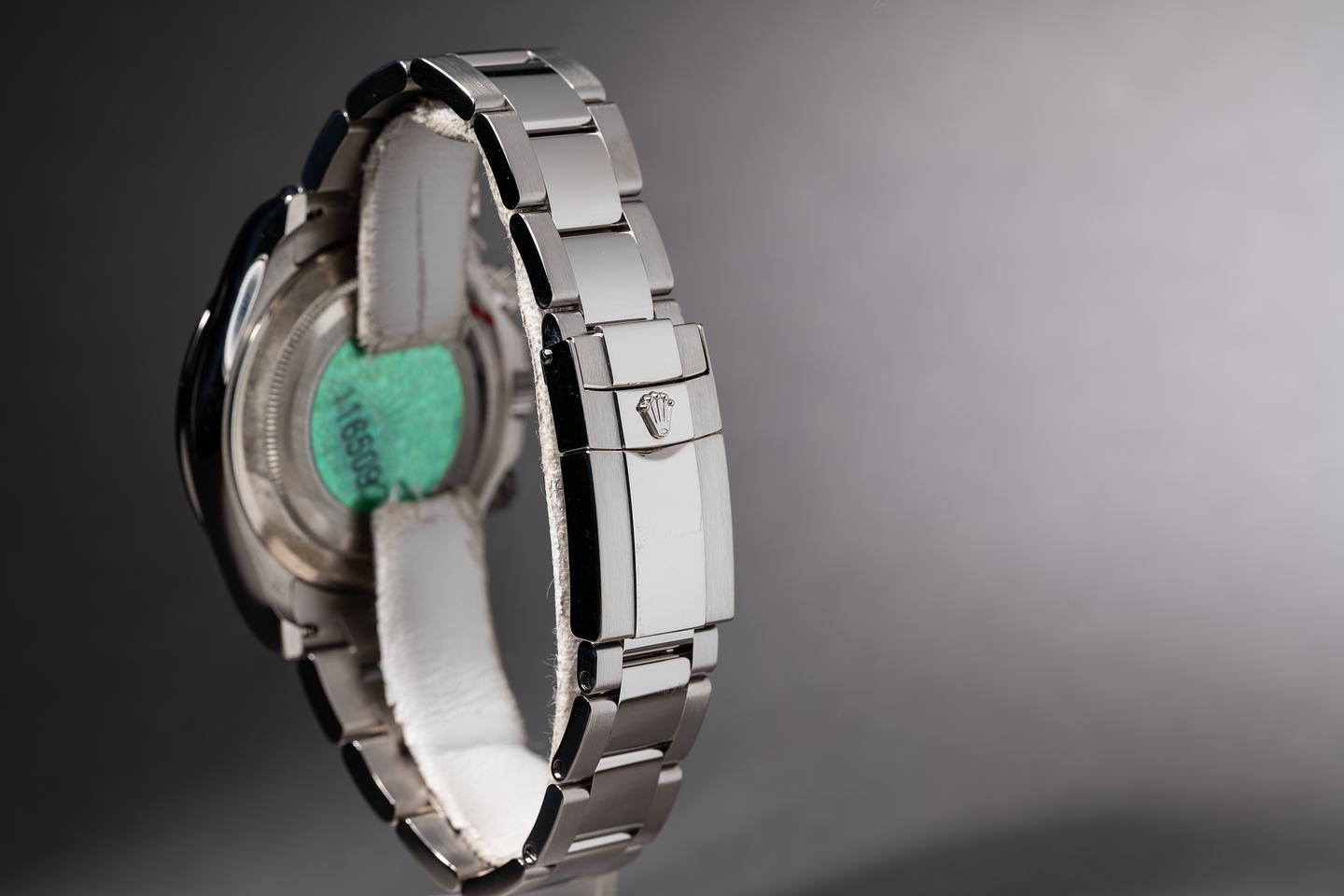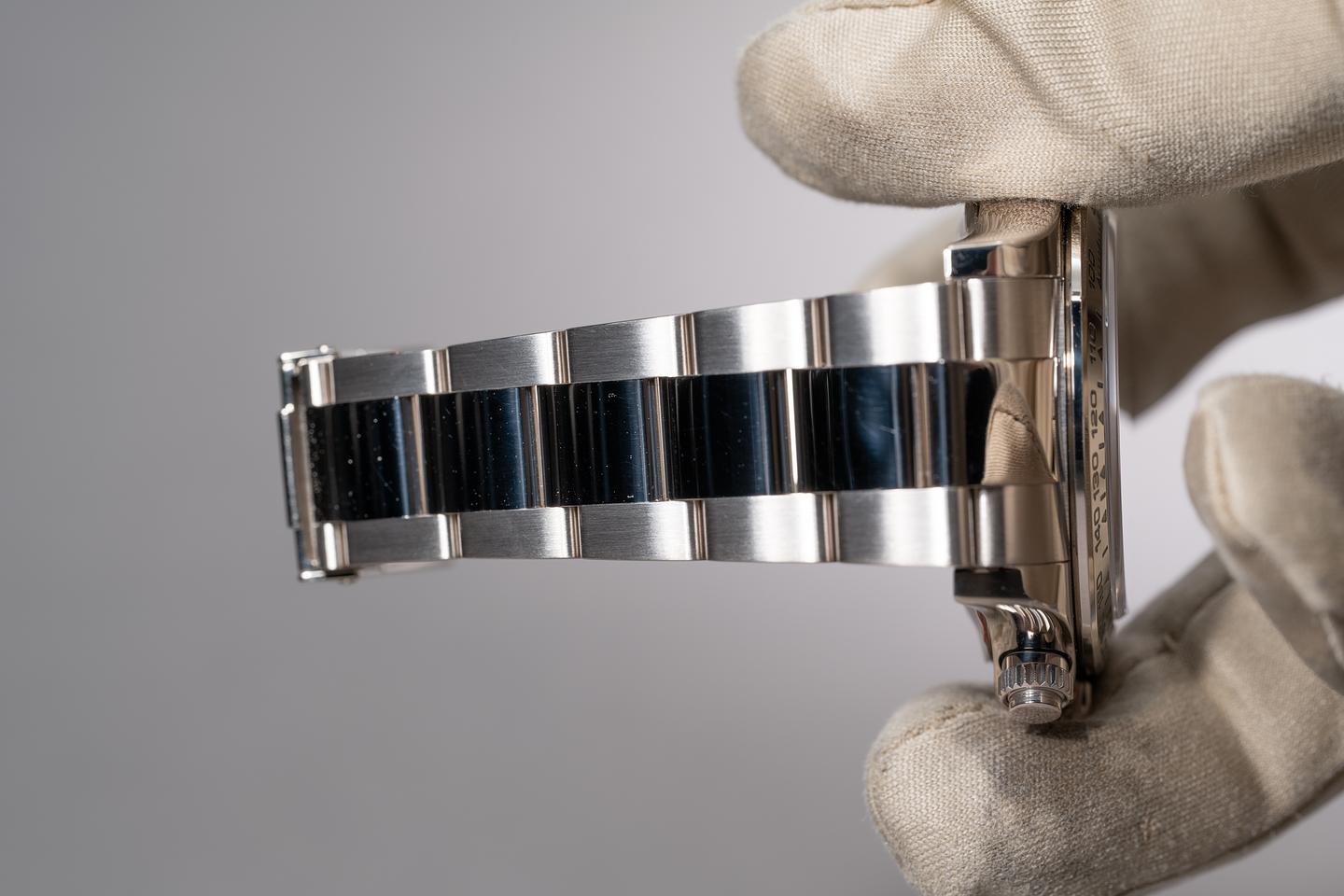 Bracelet: The 12 link 18K white gold oyster bracelet is excellent showing no perceivable stretch. The clasp is stamped with a matching 2005 date code.
