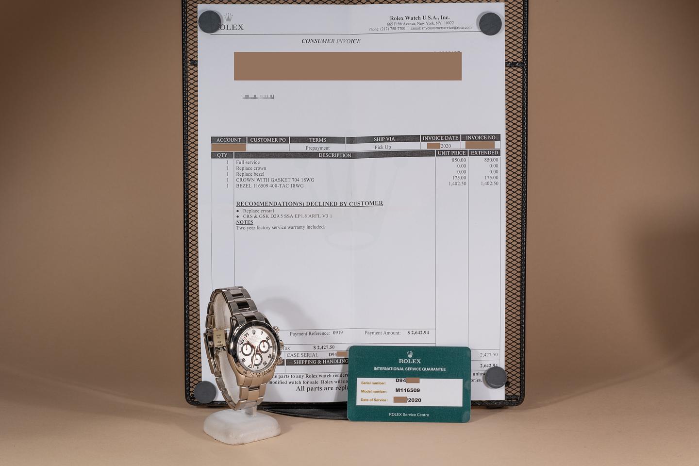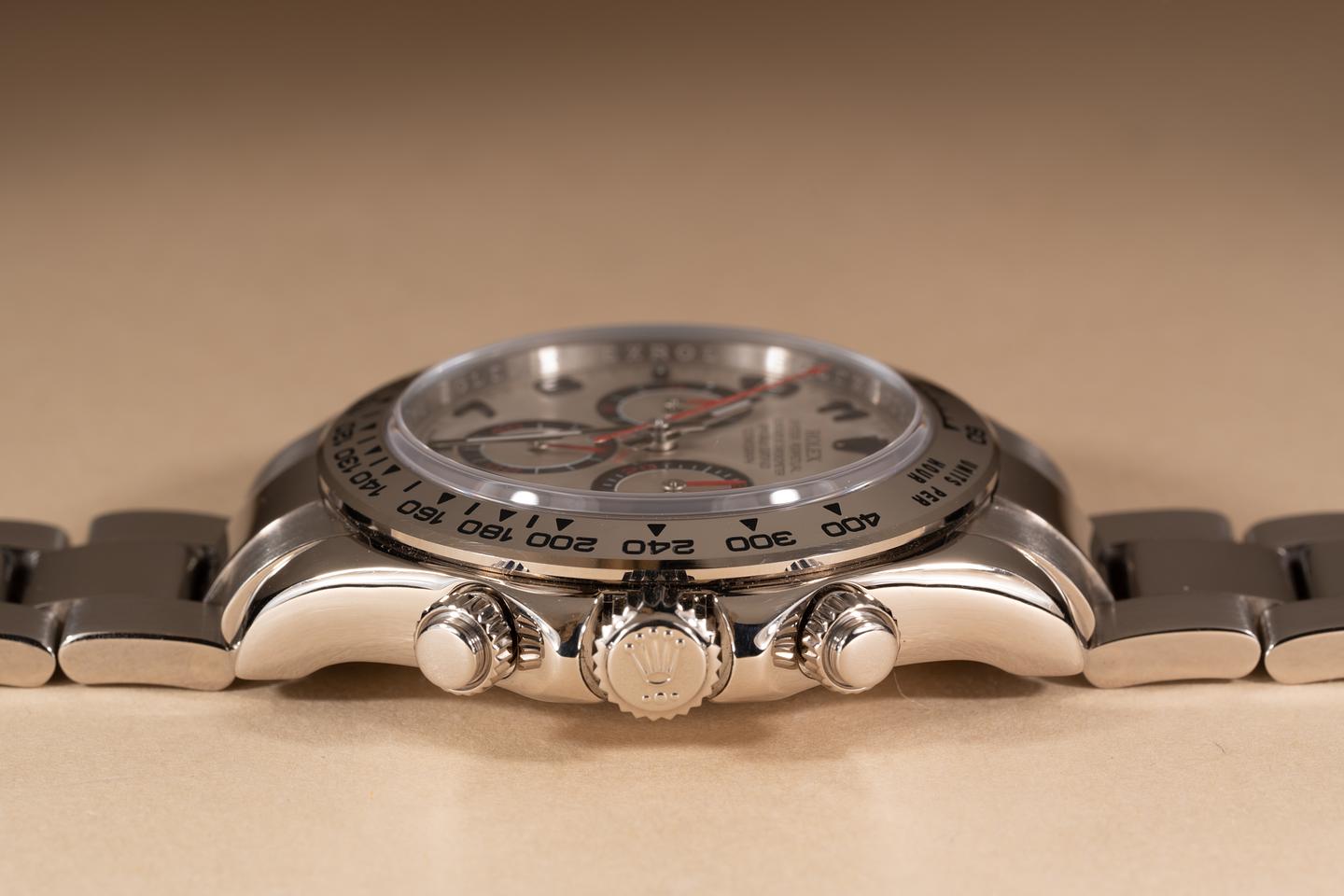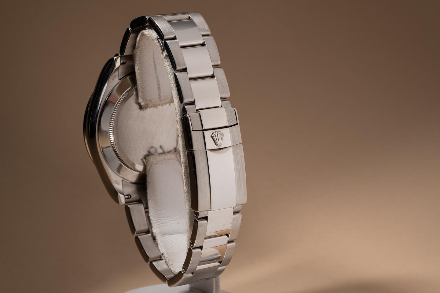 Bracelet: The 11.5 link 18k white gold Oyster bracelet is excellent showing only very light stretch for its age.