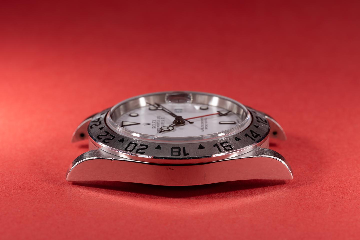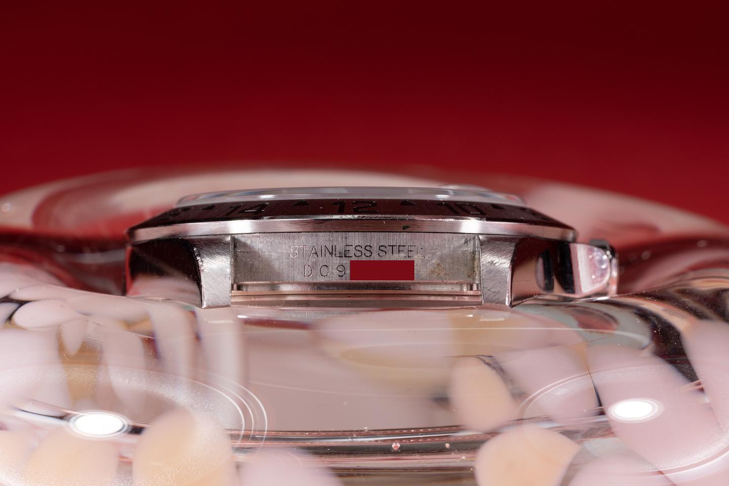 Case: The thick and even case appears to be unpolished showing prominent bevels and some light wear from use. The stainless bezel is also in excellent condition showing an intact factory sunburst finish and some light wear from use.