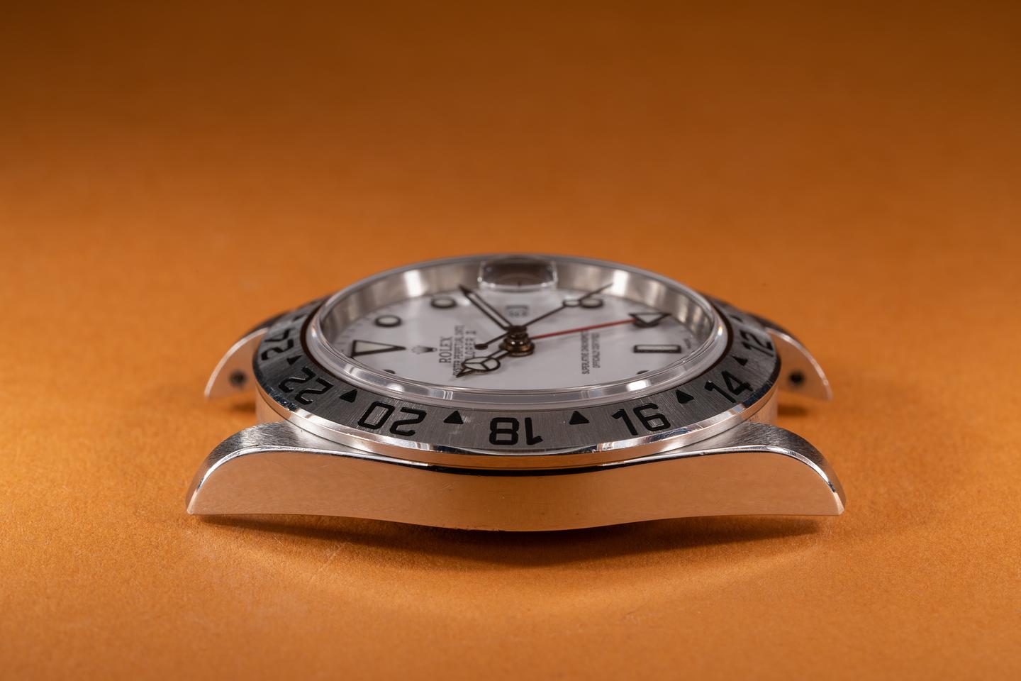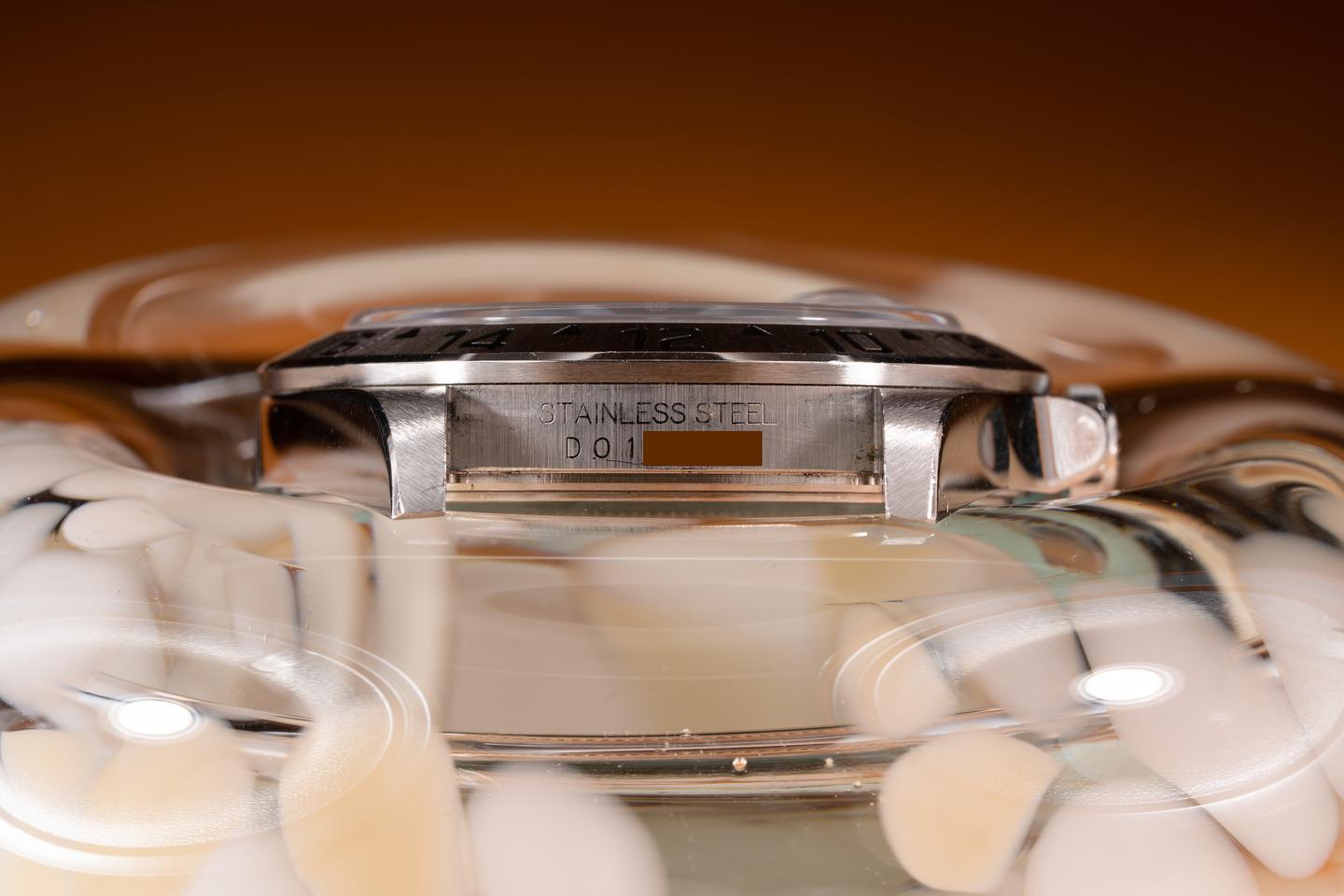 Case: The no holes case is unpolished showing sharp factory bevels and some light wear from use. The stainless bezel is also in excellent condition showing a sharp well defined factory sunburst finish and only light wear from use.