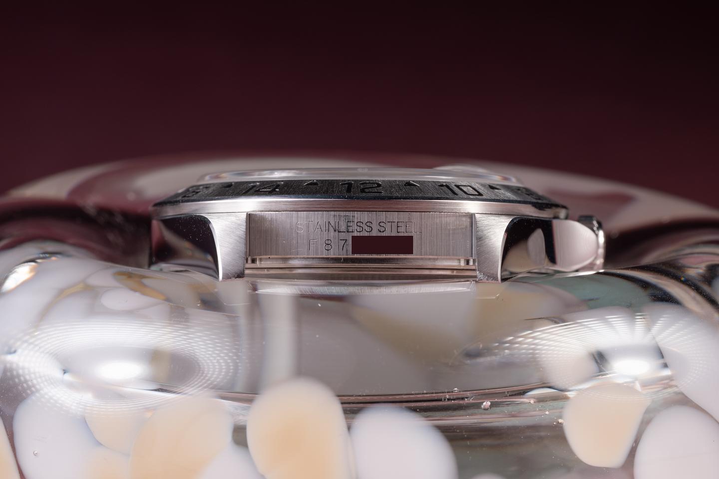 Case: The thick, sharp, and even case is excellent, showing only very light wear from use. The stainless bezel insert is also in excellent condition, showing only very light wear from use.