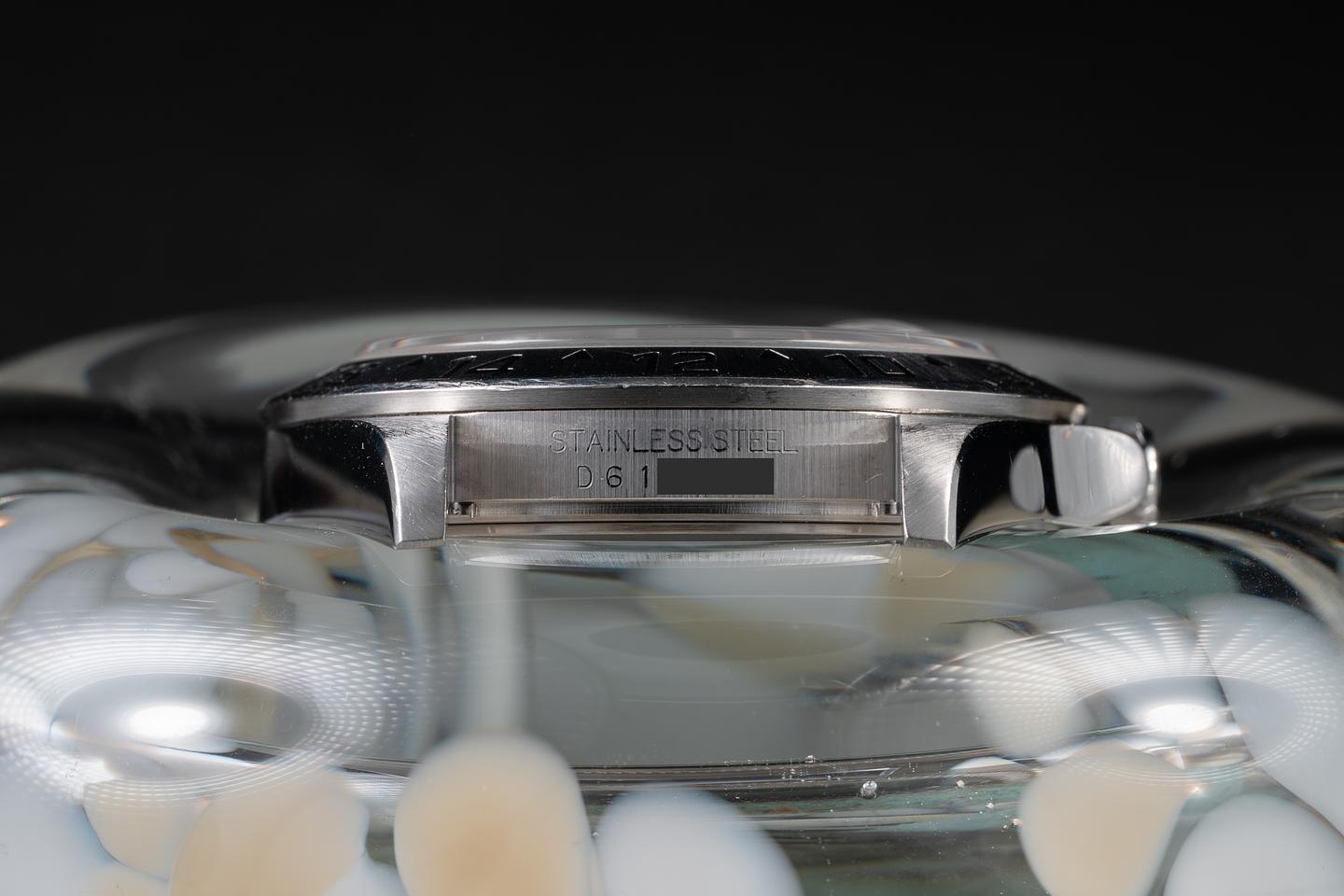 Case: The thick and even no-holes case is excellent, showing prominent bevels and some light wear from use. The stainless bezel is also in excellent condition, showing only light wear from use.