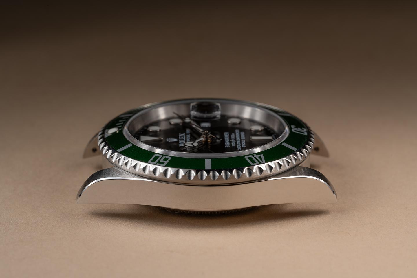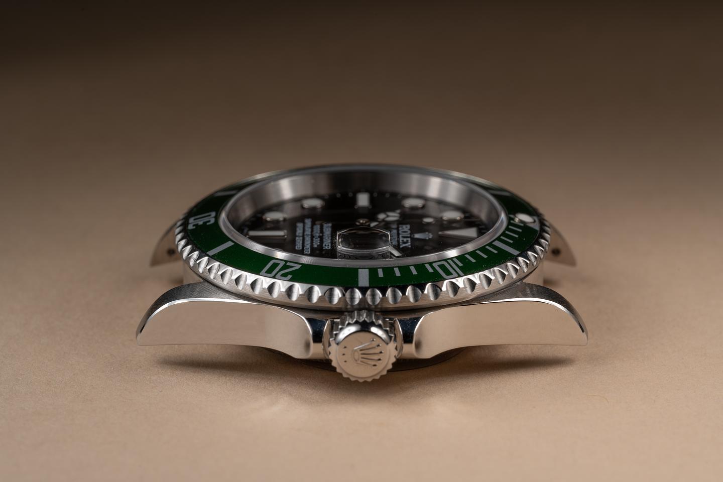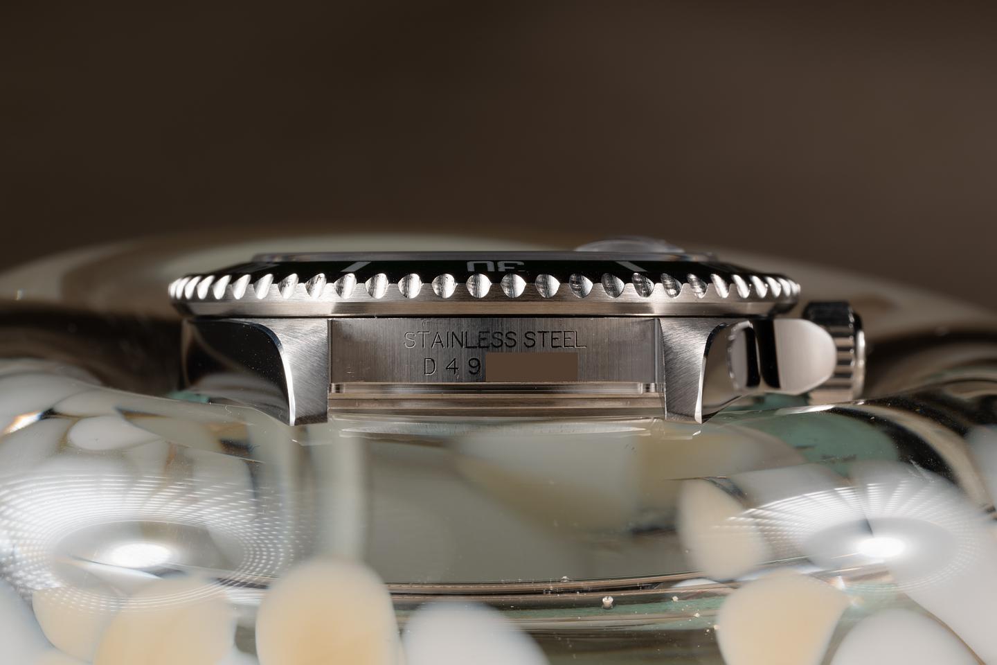 Case: The recently polished case is excellent showing sharp prominent bevels and only very light wear from use. The green bezel insert is also in excellent condition showing only very light wear.