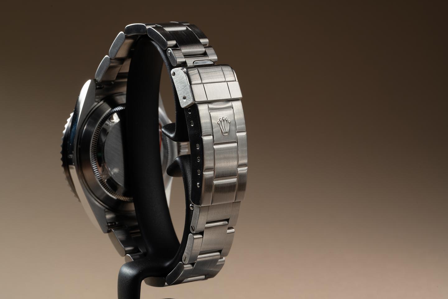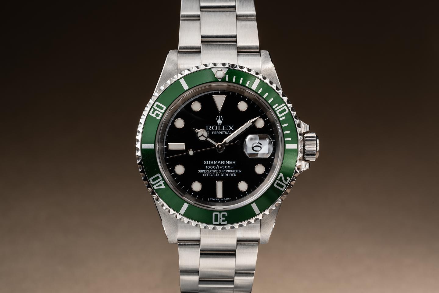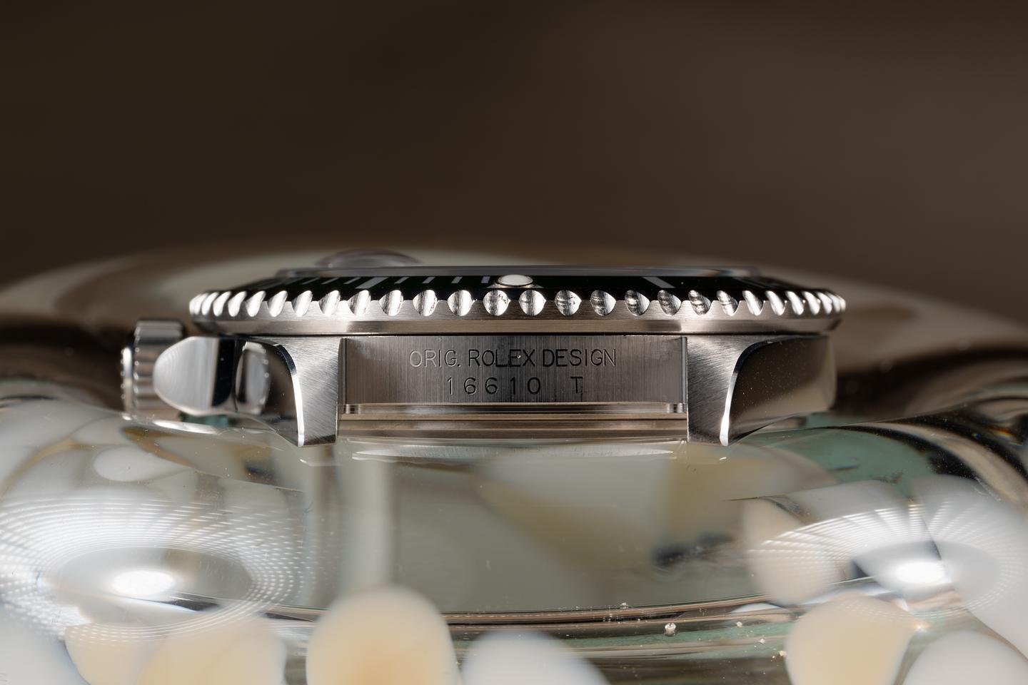 Case: The recently polished case is excellent showing sharp prominent bevels and only very light wear from use. The green bezel insert is also in excellent condition showing only very light wear.