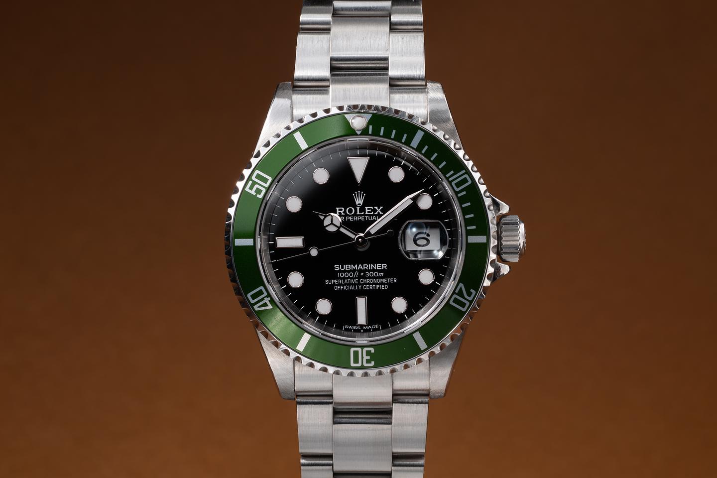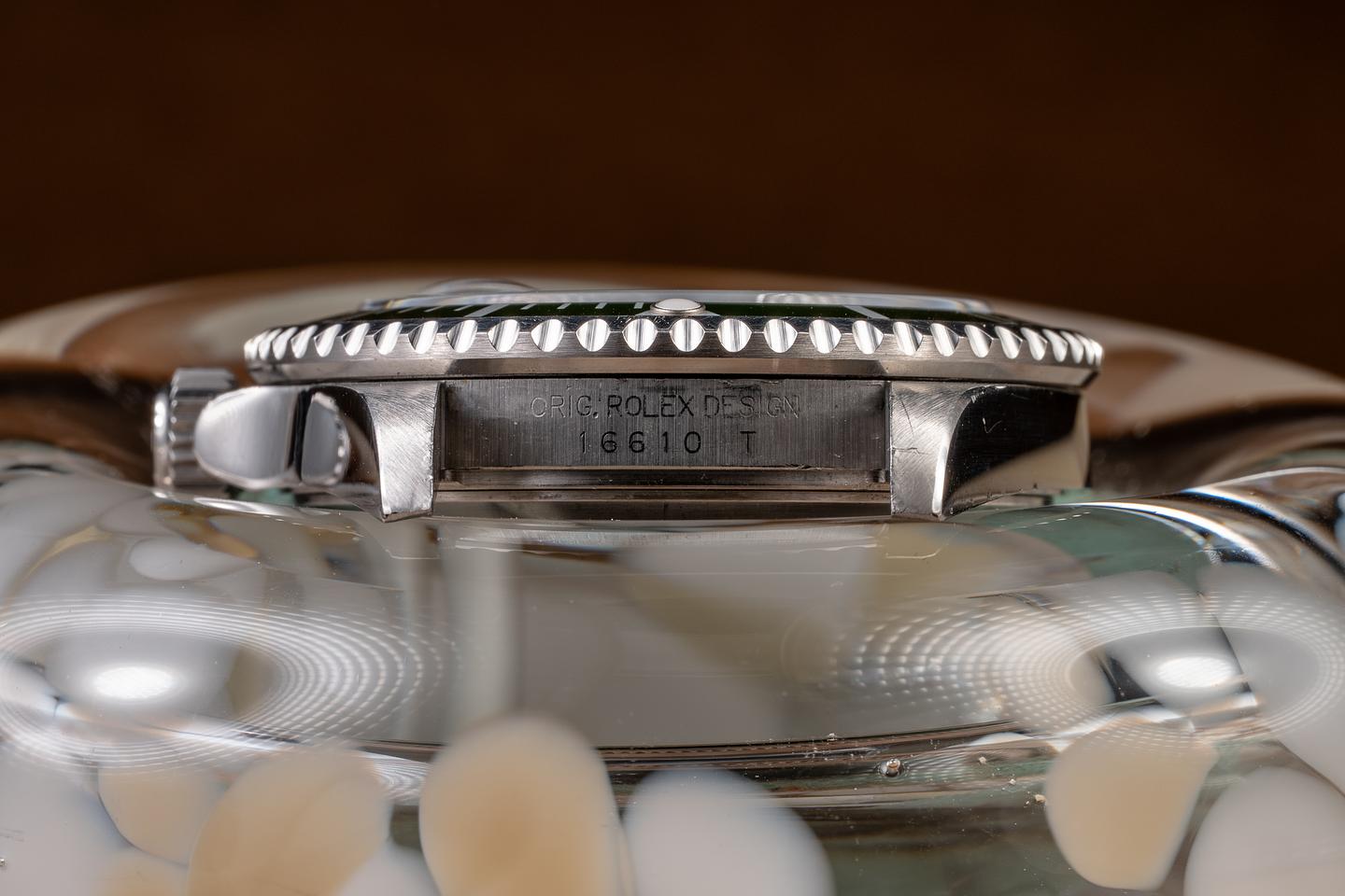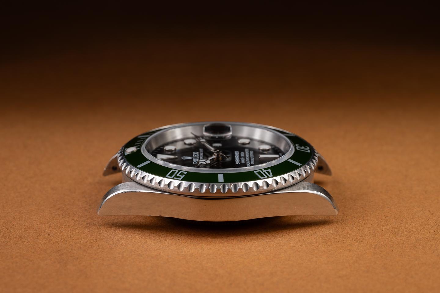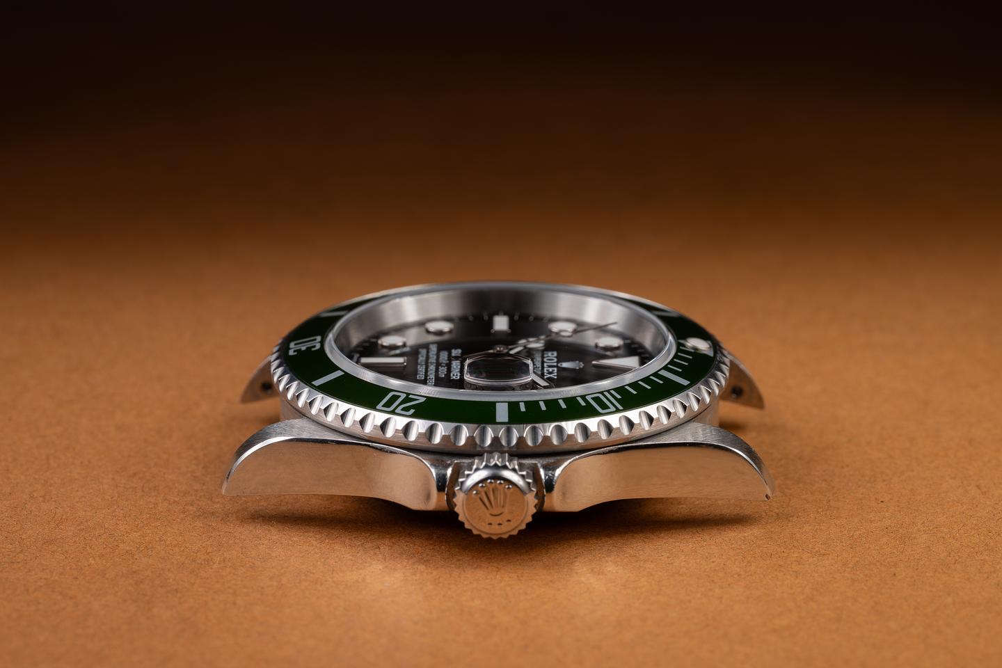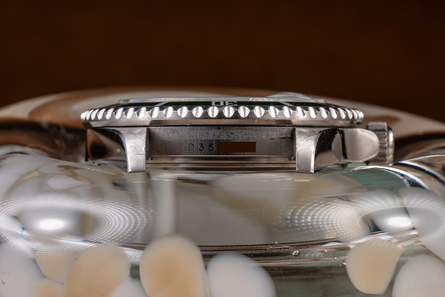Case: The thick, sharp, and even case is excellent, showing some light wear from use. The green bezel insert is also in excellent condition and has aged to a lime green hue.