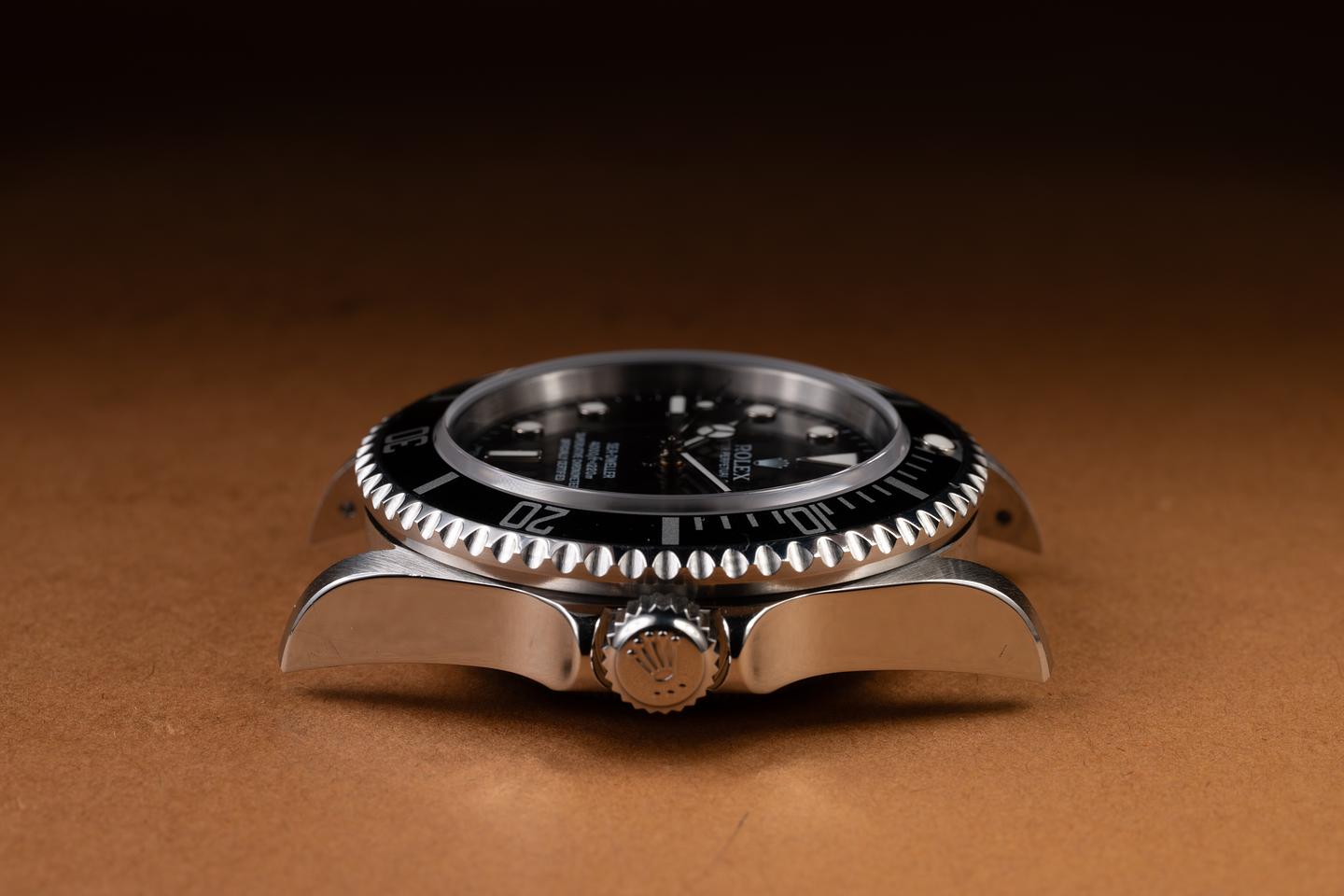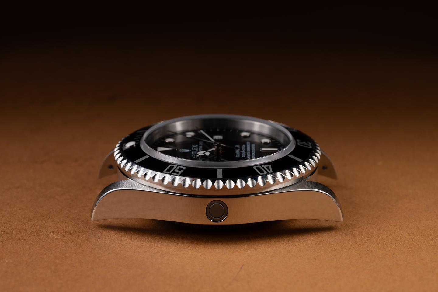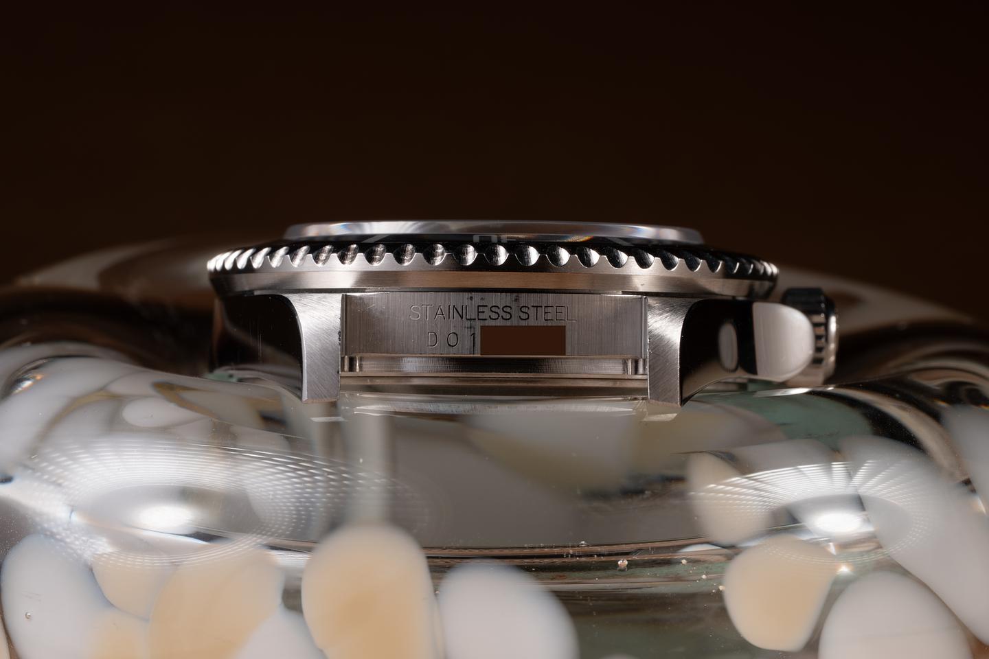 Case: The thick, and even case is excellent, showing sharp prominent bevels and only very light wear. The black bezel insert is also in excellent condition, showing only very light wear from use.