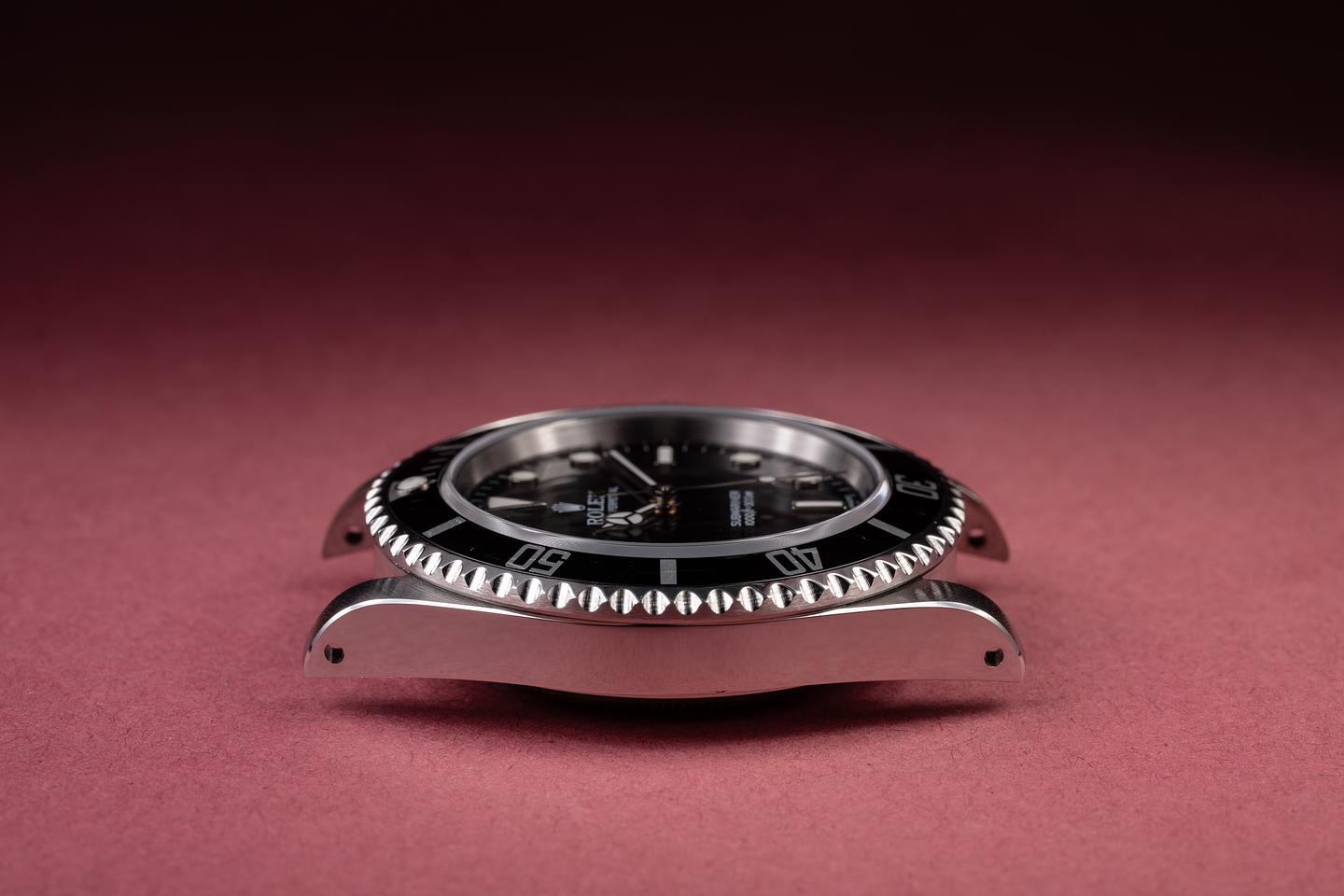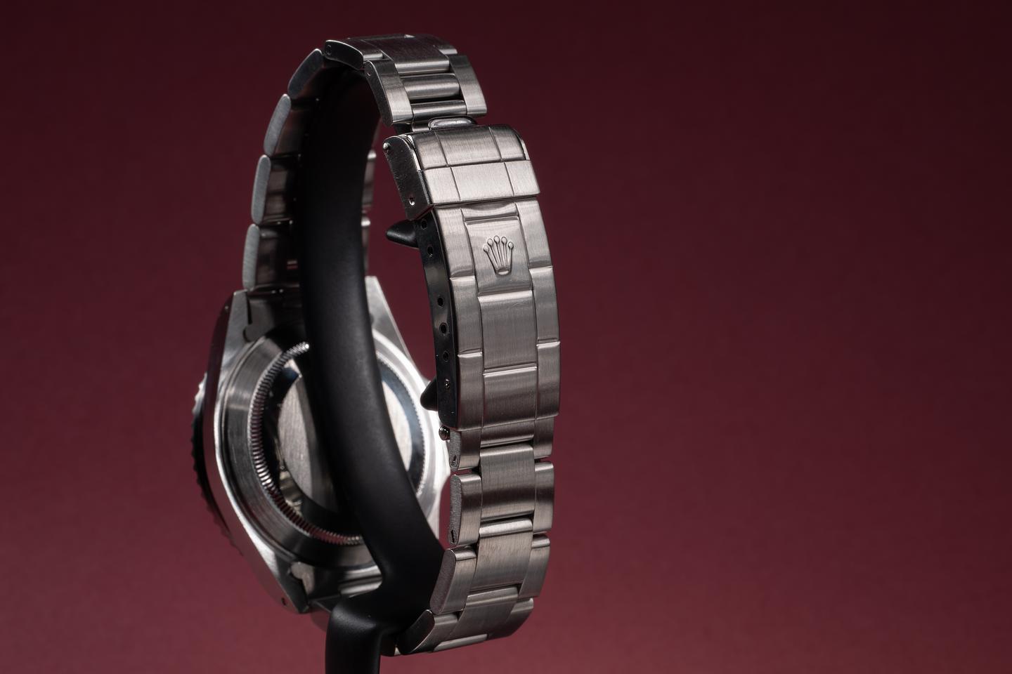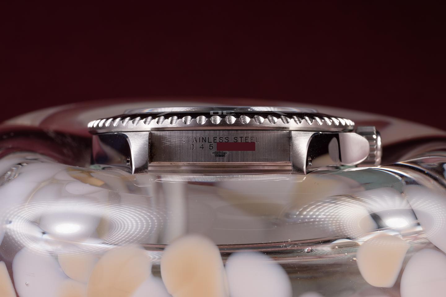 The recently polished case is excellent, showing sharp, prominent bevels. The black bezel insert is also in excellent condition, showing only very light wear from use.