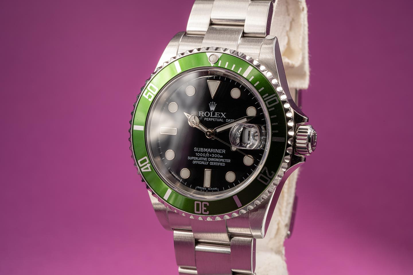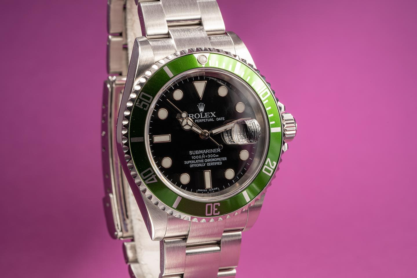 Case: The excellent case features sharp prominent bevels and shows light wear from use. The green anniversary insert is excellent and shows very light wear.