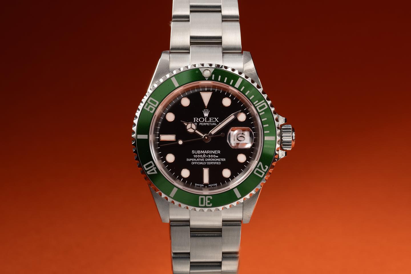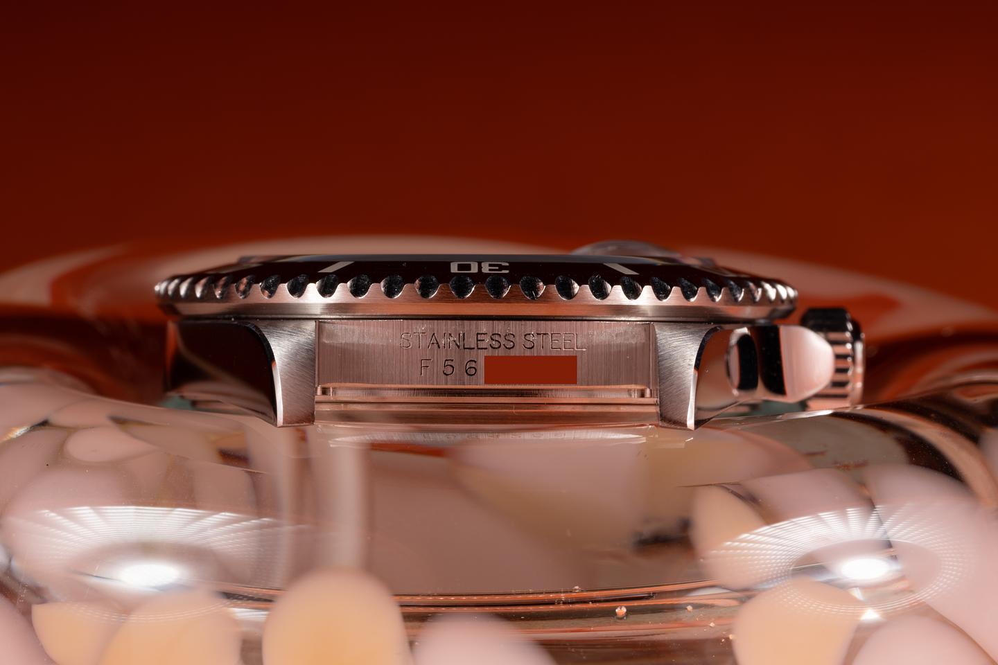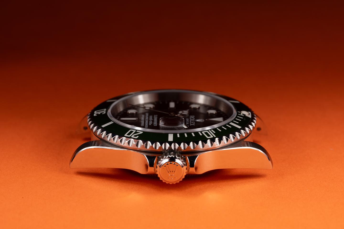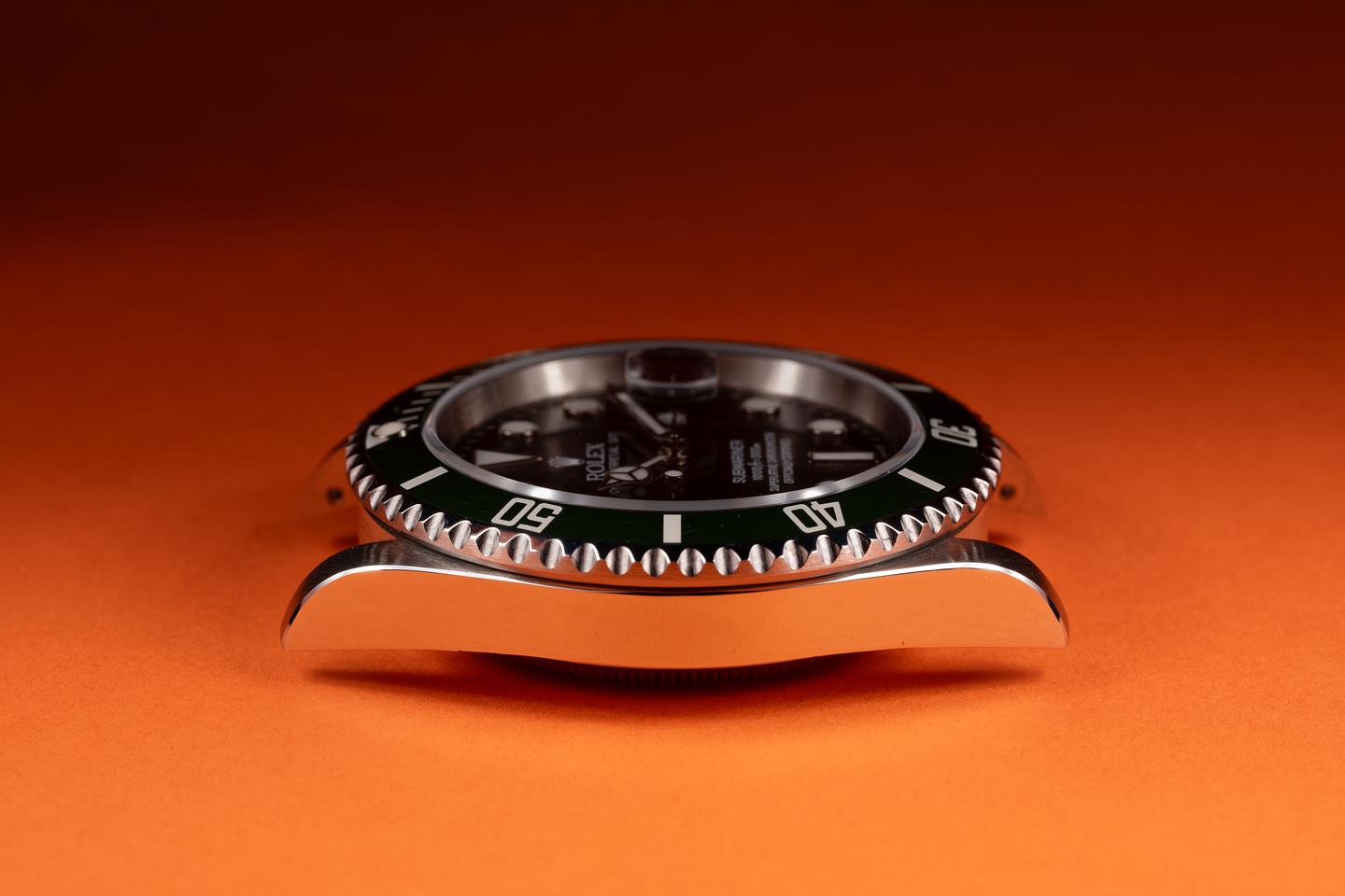 Case: The thick and even case is excellent showing sharp prominent bevels and only very light wear. The green bezel insert is also in excellent condition showing only light wear from use.