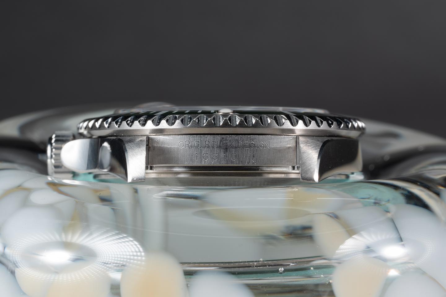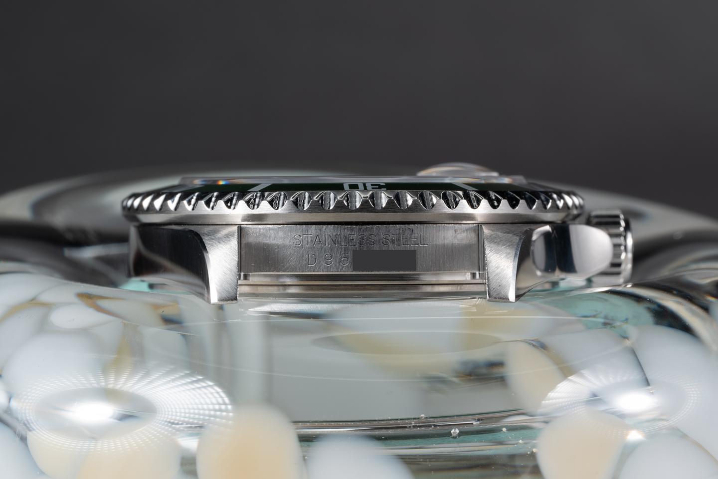 Case: The thick and even case has just returned from polishing showing sharp prominent bevels. The green bezel insert is also in excellent condition showing only very light wear from use.