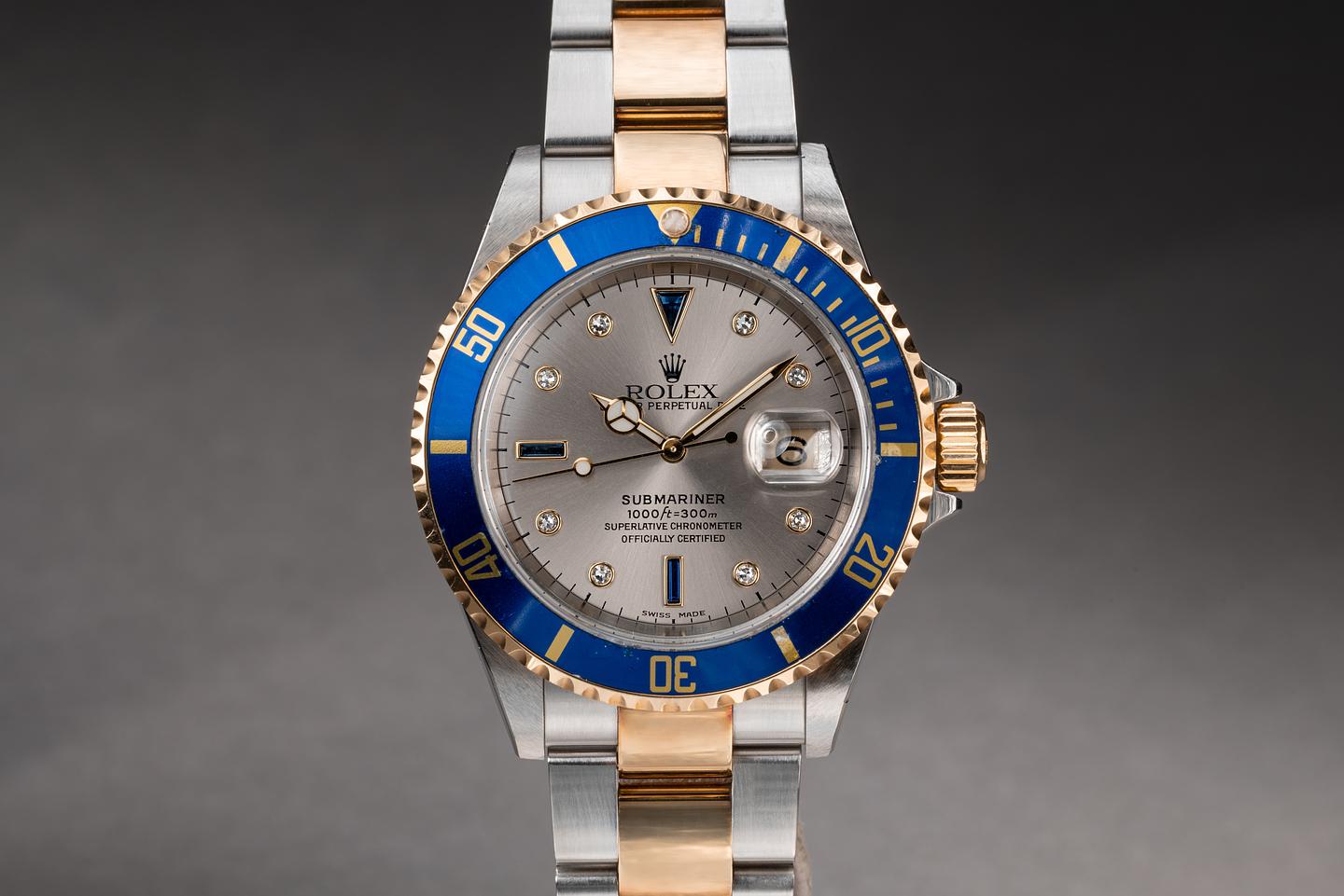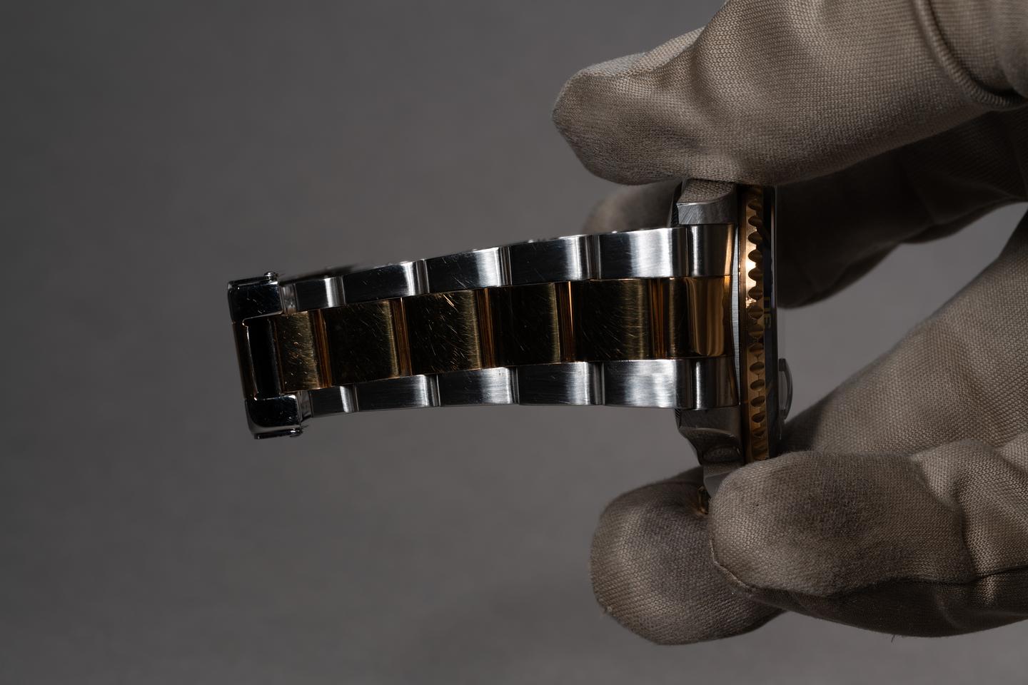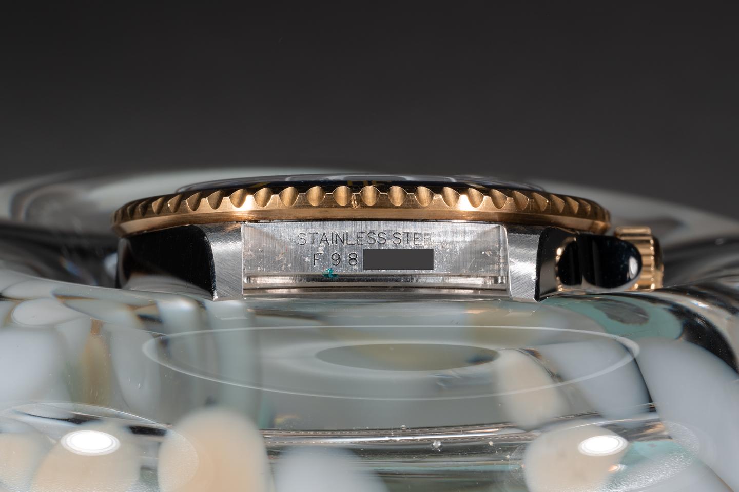 Bracelet: The 9.6 link bracelet has had a permanent link broken out of the 6 o'clock side so it will balance better on smaller wrists. The bracelet is in otherwise excellent condition showing only light stretch for its age. The clasp is stamped with a matching 2005 date code.