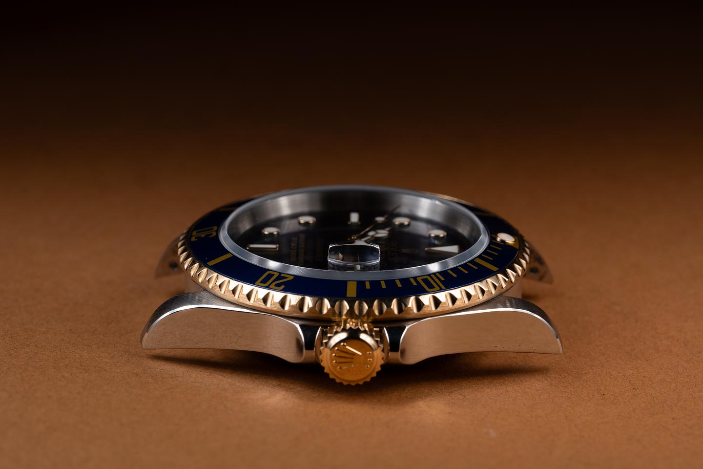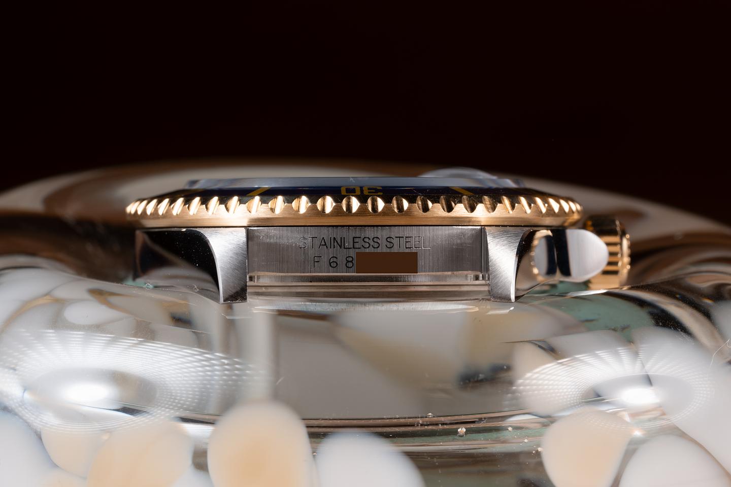 Case: The recently polished case is excellent showing sharp prominent bevels and only very light wear from use. The blue bezel is also in excellent condition showing only very light wear.