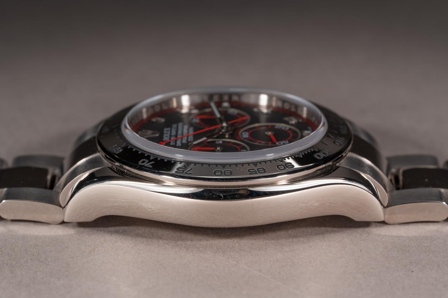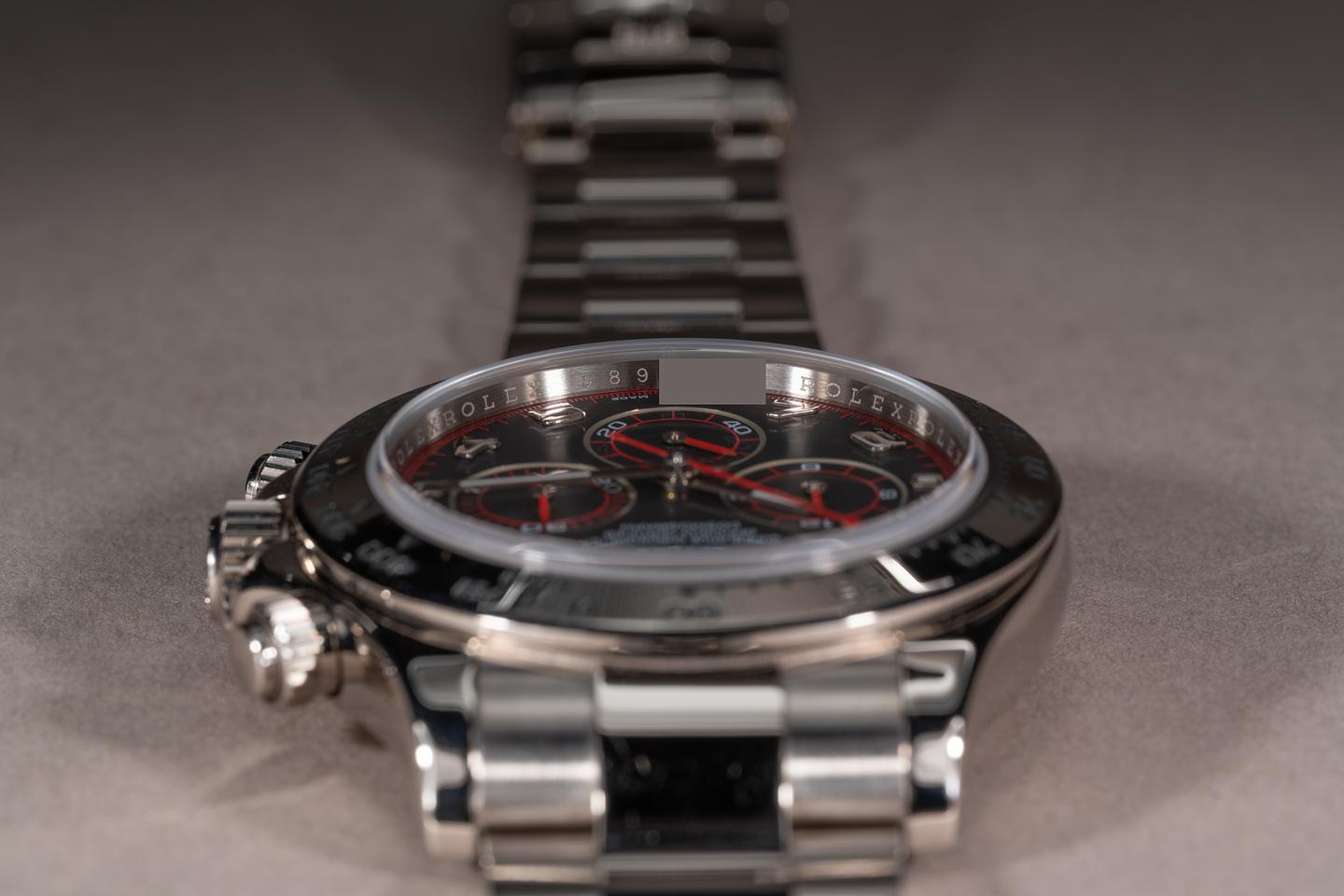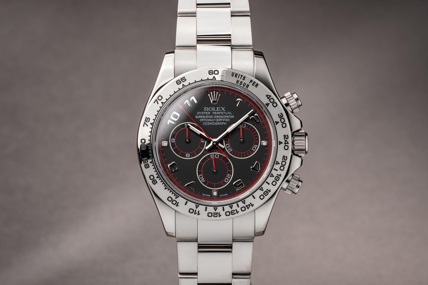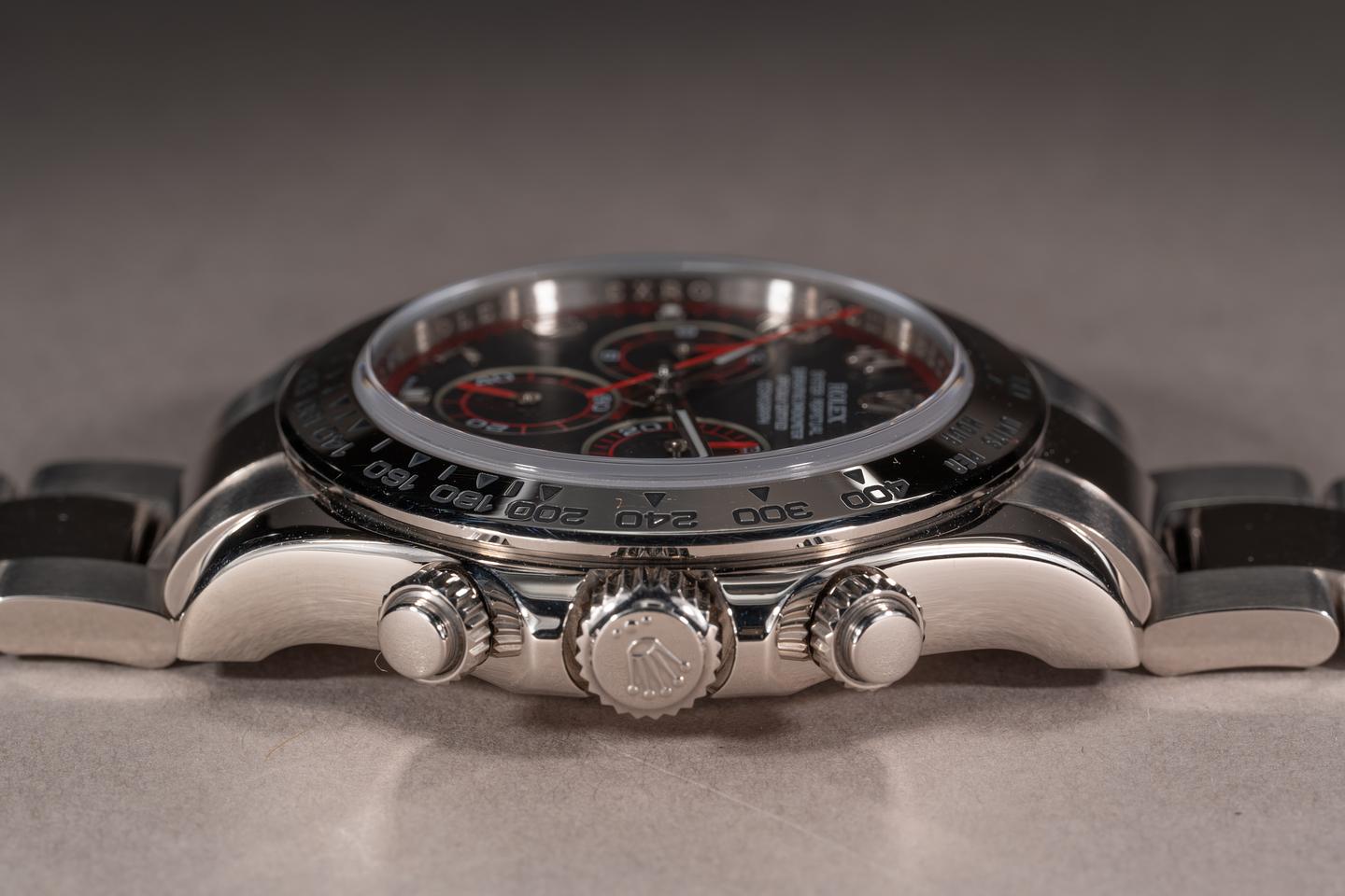 Case: The thick and even 18k white gold case is excellent showing only light wear from use. The 18k white gold bezel is also in excellent condition showing only very light wear from use.