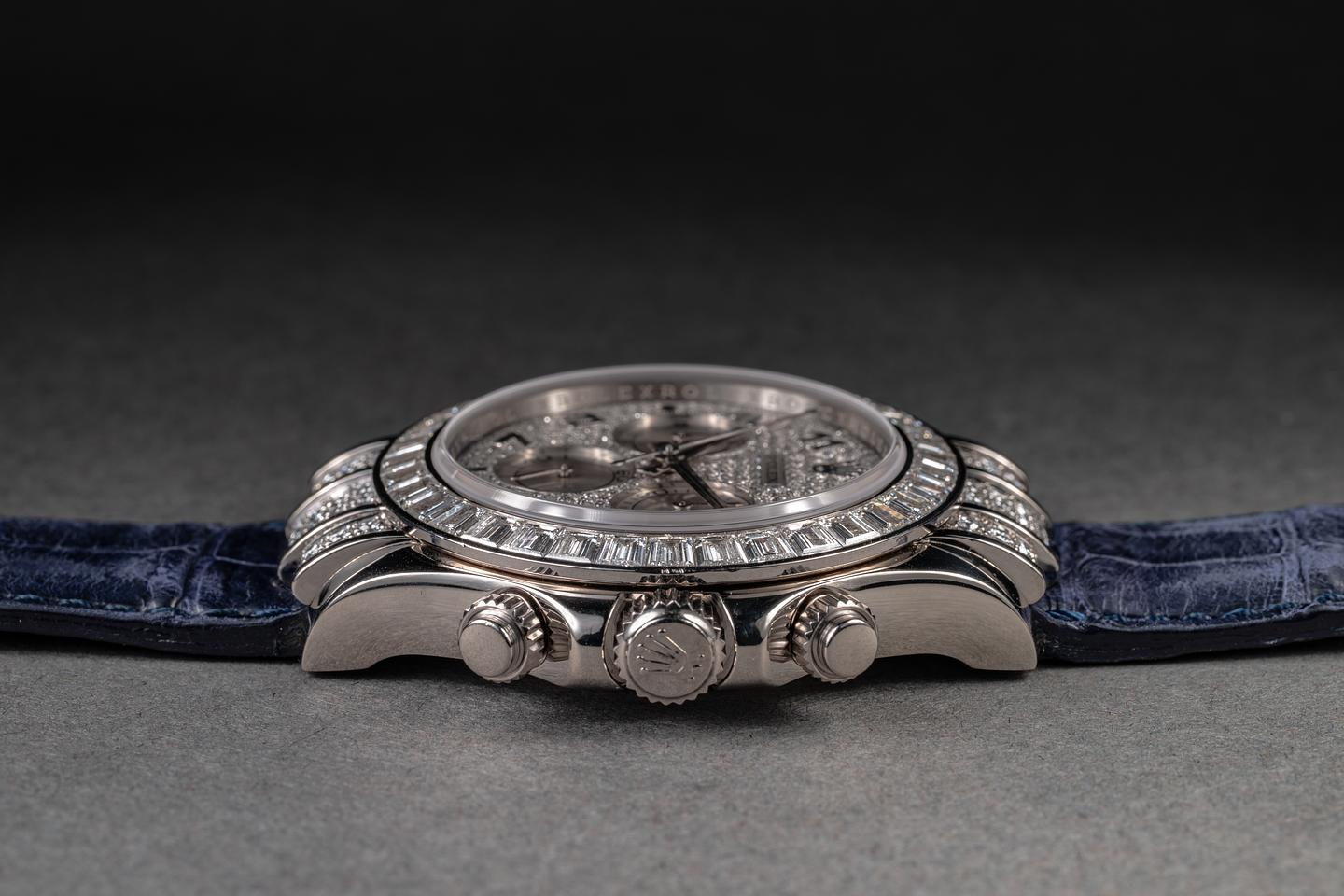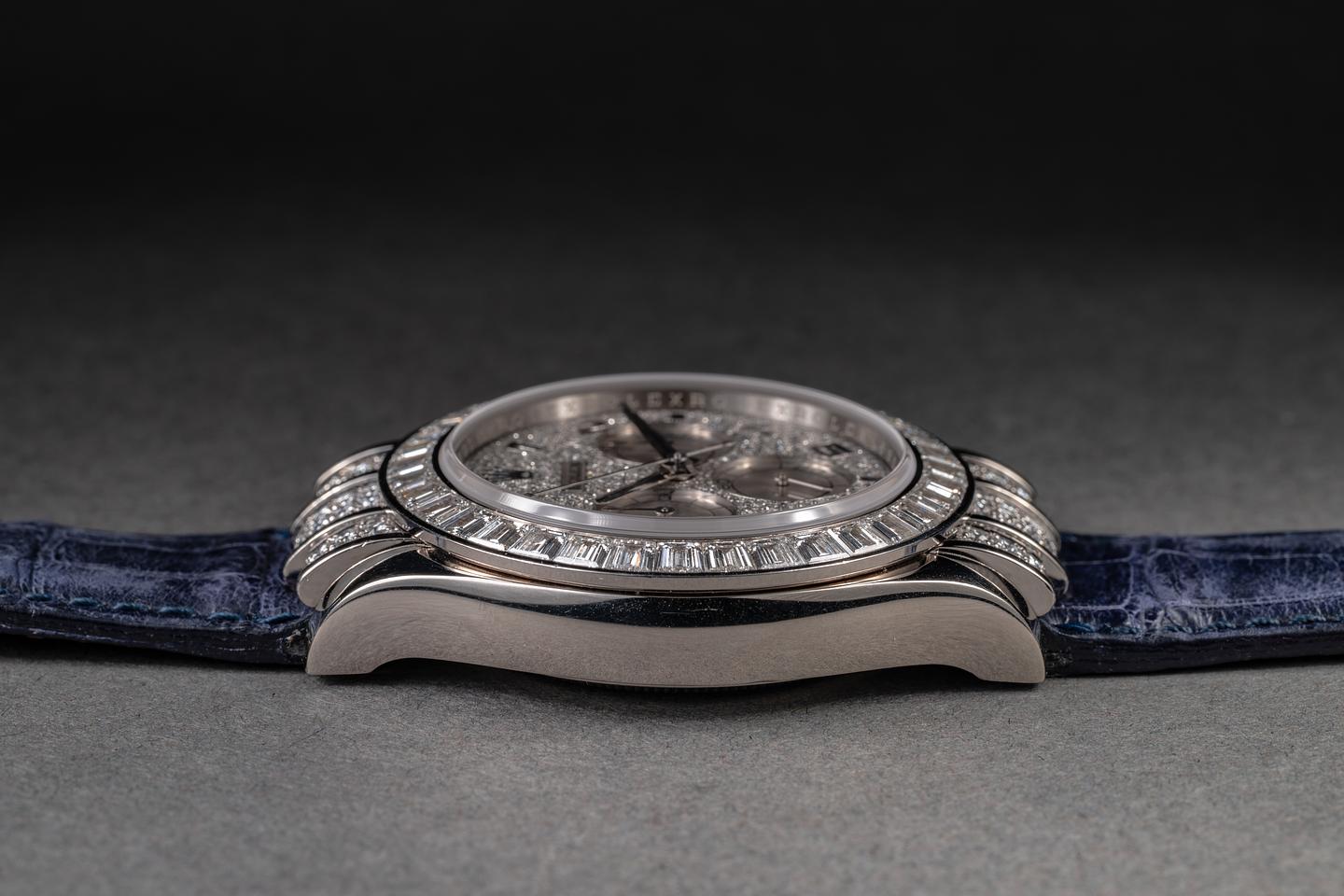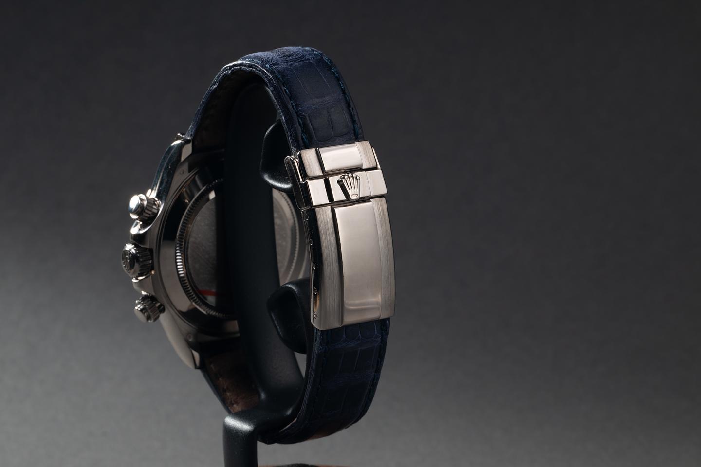Bracelet: The Rolex blue leather alligator strap is excellent, showing some light wear from use. The 18K white gold clasp is also in excellent condition, showing only light wear from use.