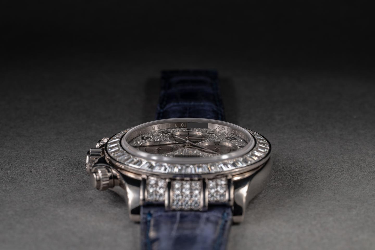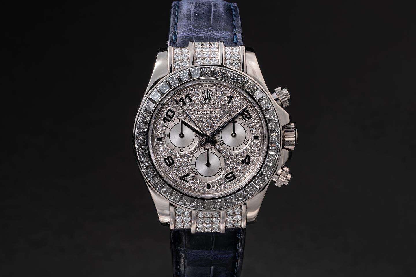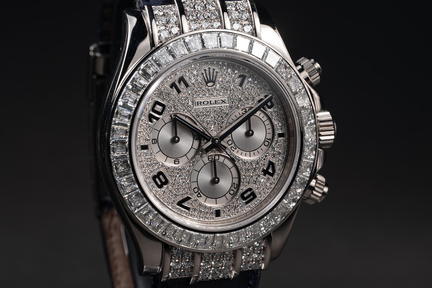 Dial: The diamond-paved Arabic dial is in excellent condition, showing no visible wear. The original factory hands are matching.