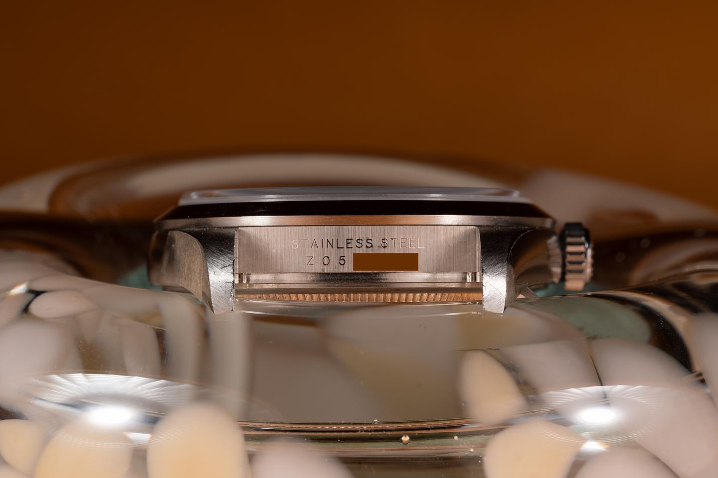 Case: The sharp 36mm case is excellent with the factory protective stickers still in place. There is some shop wear on the tip of the 7 o'clock lug. The smooth stainless bezel is also mint showing no visible wear.