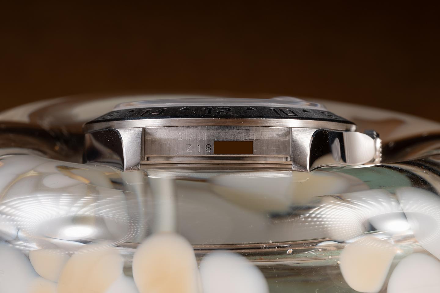 Case: The freshly polished no-holes case is excellent, showing little if any wear. The stainless bezel is also in excellent condition, showing a sharp, well-defined sinburst finish and little if any wear.