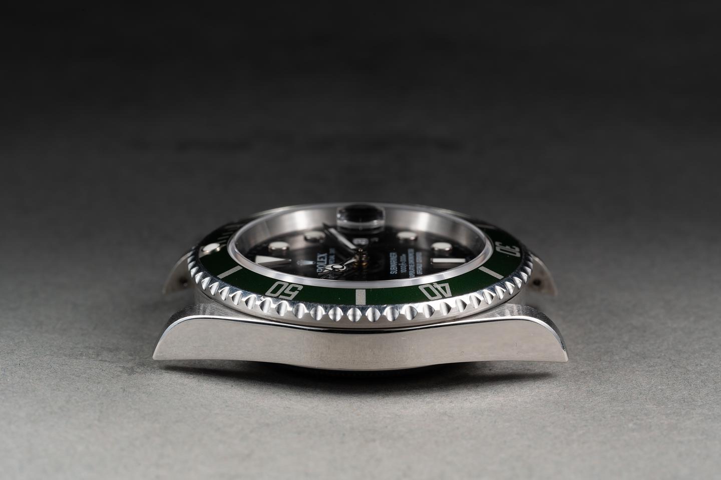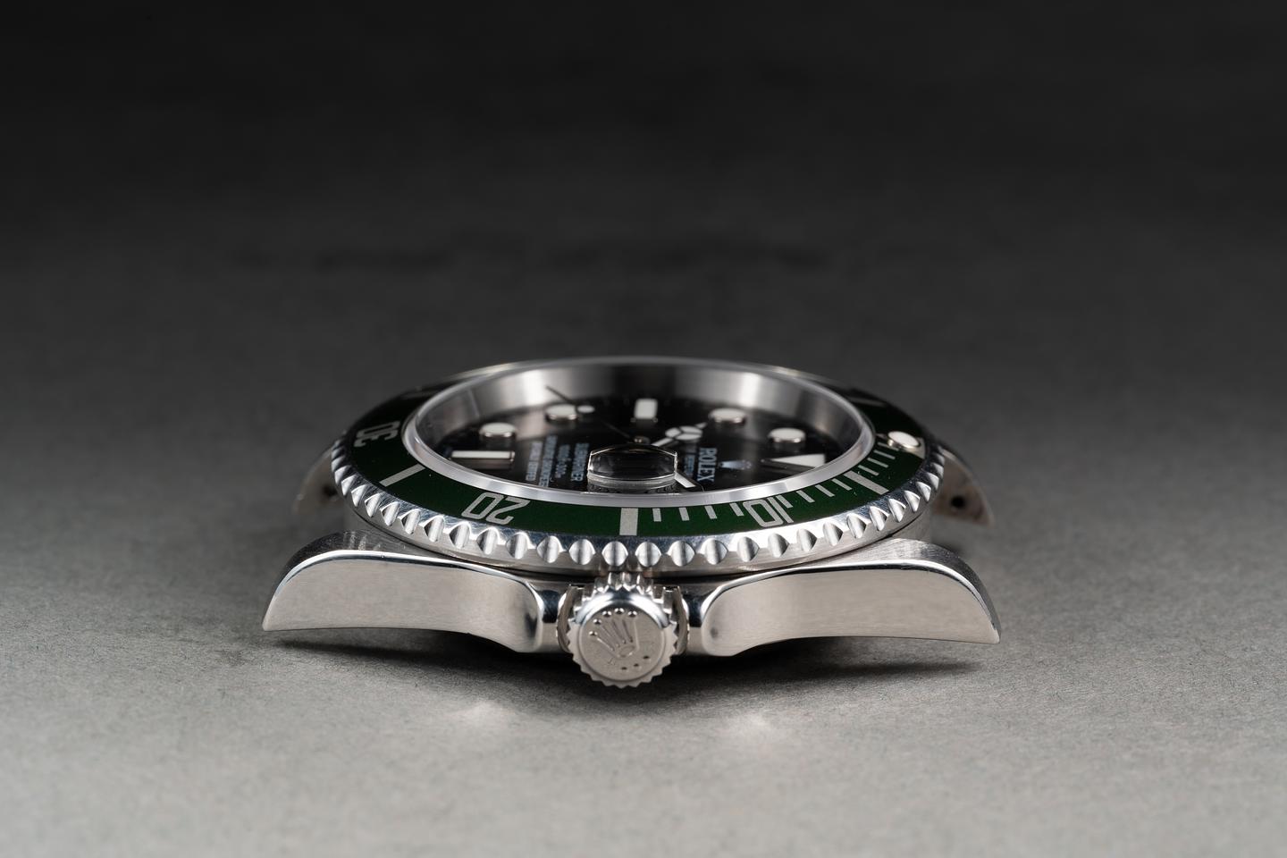 Case: Th thick and even case is excellent showing sharp bevels and only light wear form use. The green bezel is also in excellent condition showing only very light wear form use.