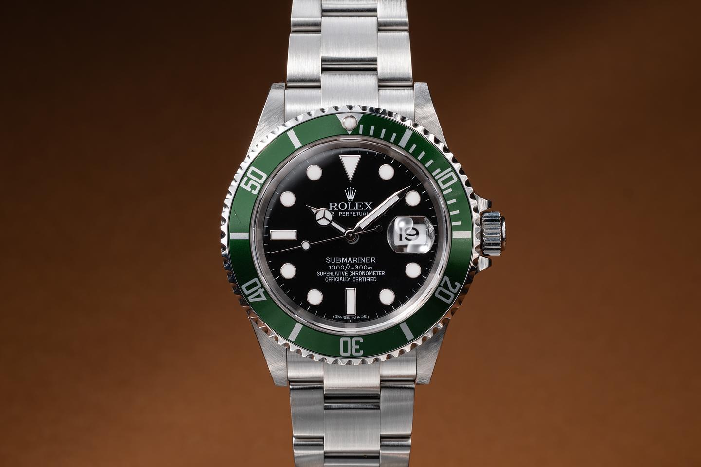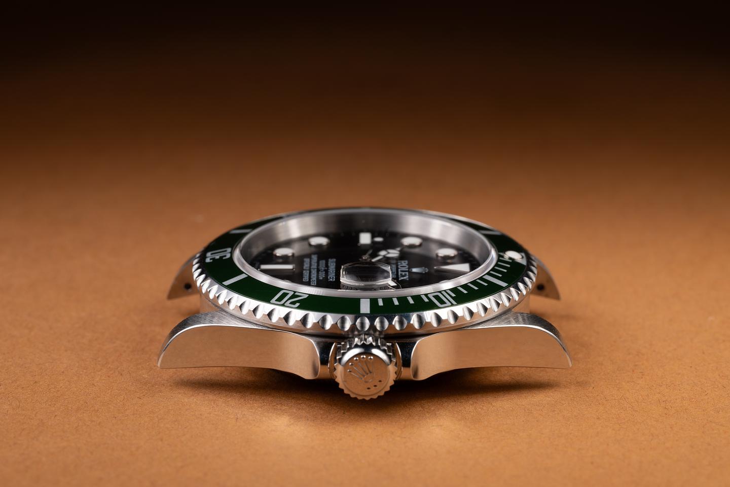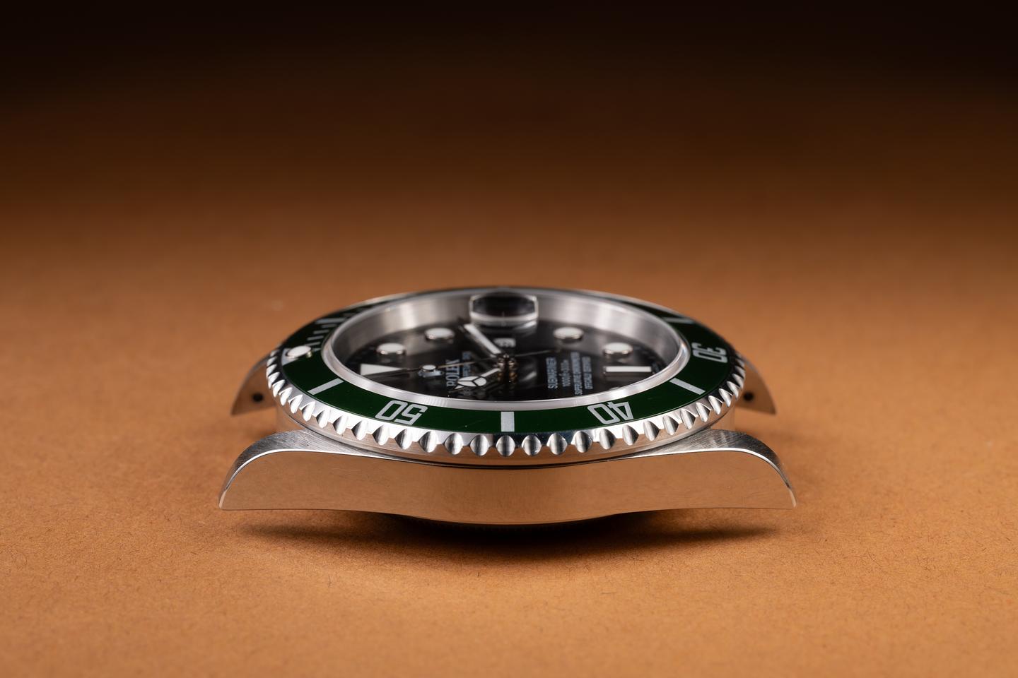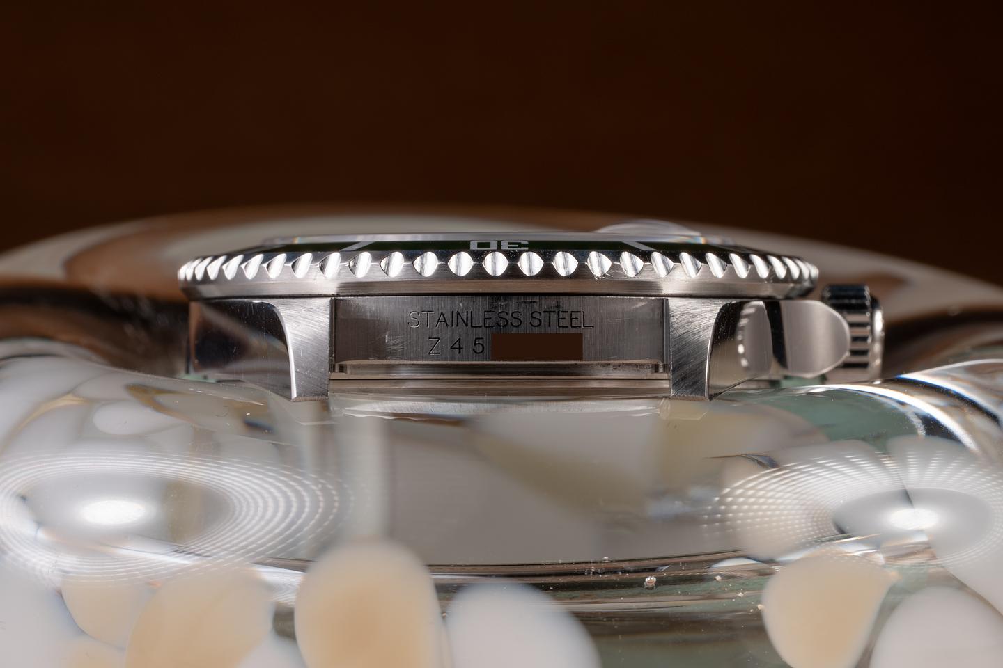 Case: The thick, sharp, and even case is excellent, showing only light wear from use. The green bezel insert is also in excellent condition, showing only light wear from use.