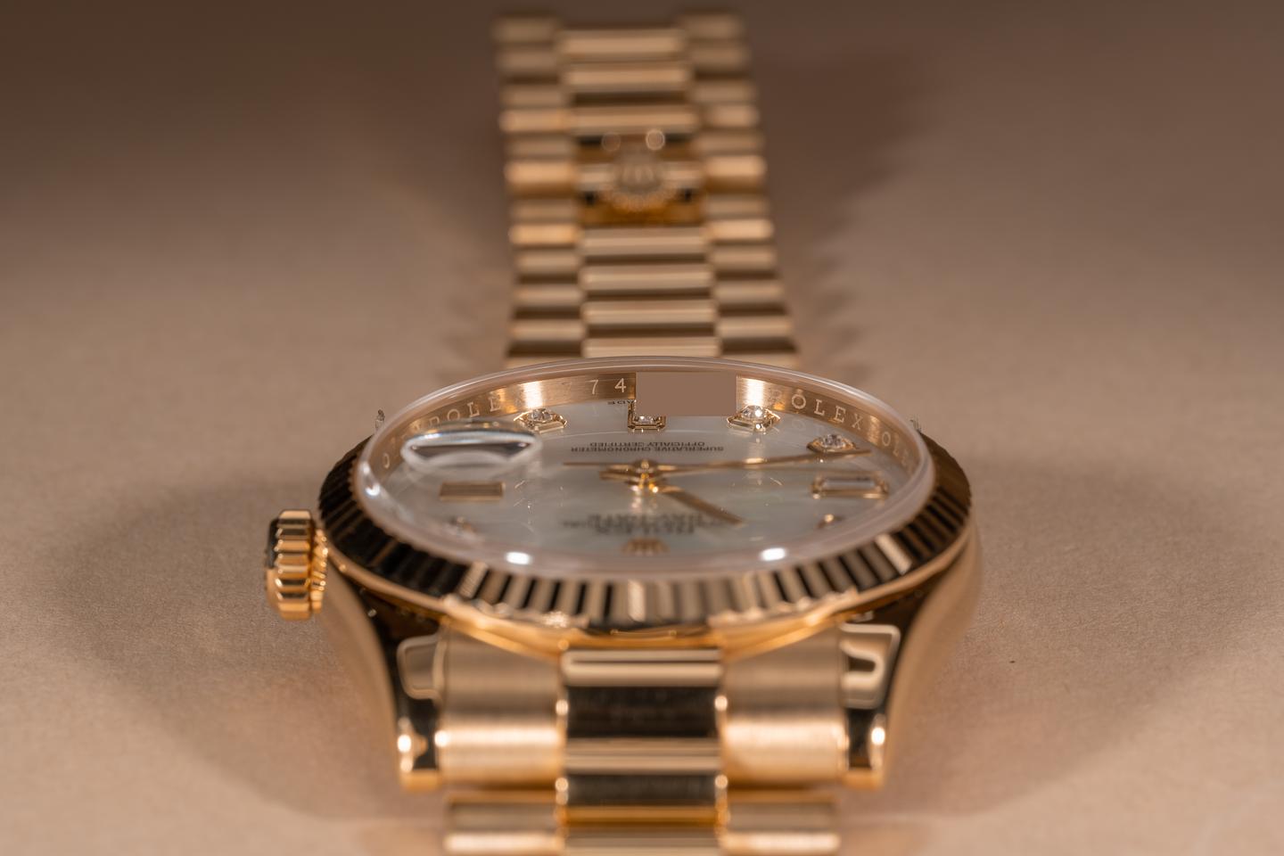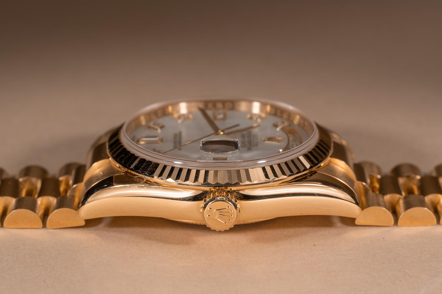 Case: The 18k yellow gold case is mint with most of the factory protective stickers still in place. The sharp 18k yellow gold fluted bezel is also mint showing only light wear from use.