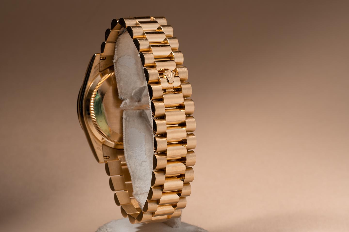 Bracelet: The 22 link 18k yellow gold president bracelet is mint.
