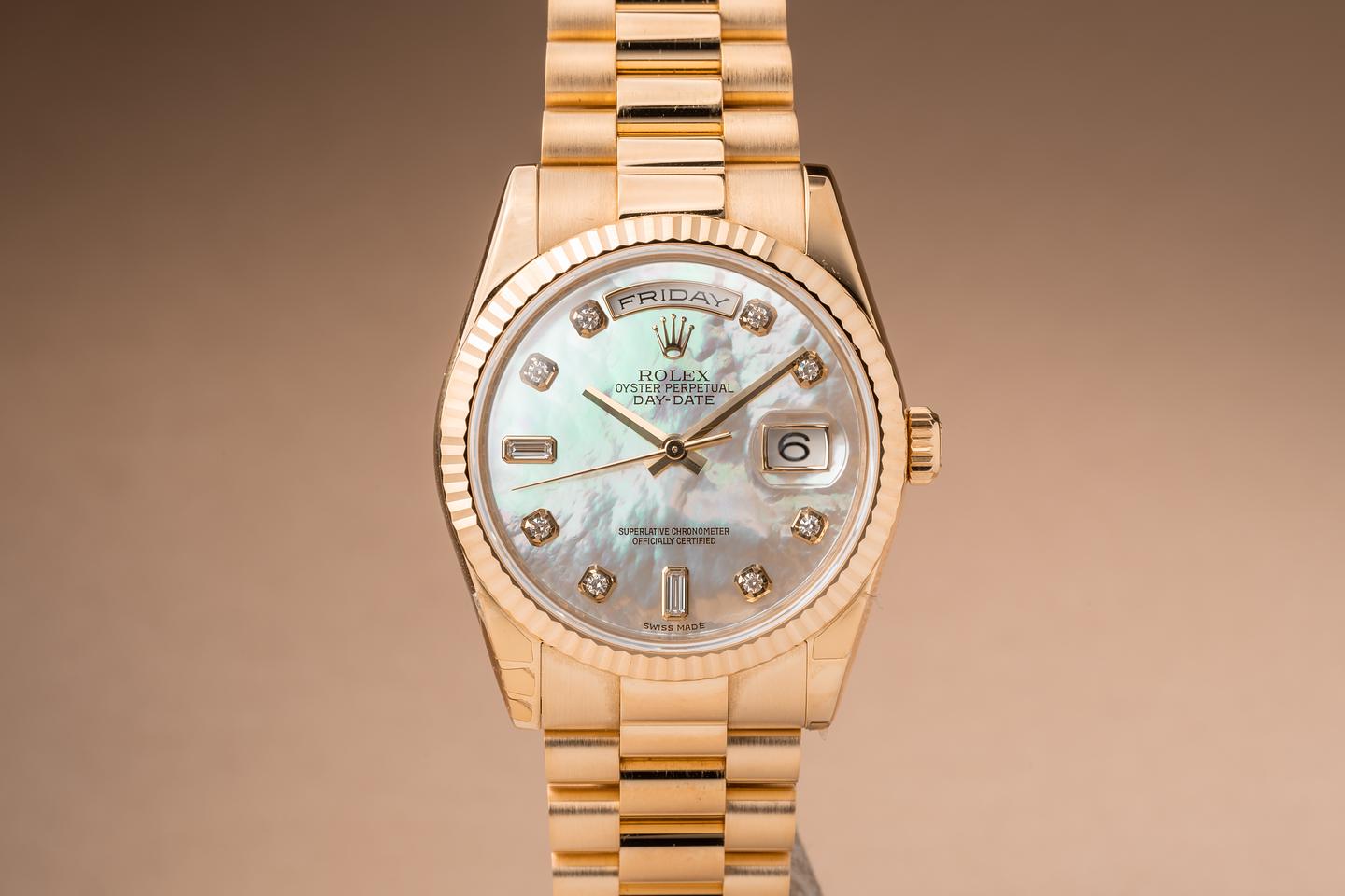 Dial: The pastel toned mother of pearl dial is mint and the original factory hands are matching