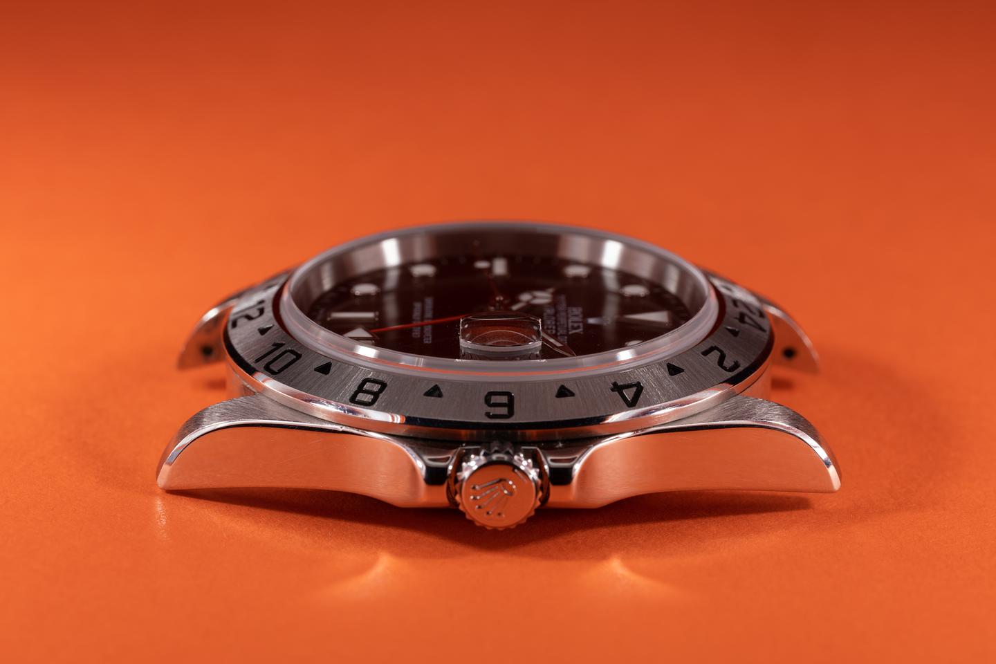 Case: The thick and even no holes case is excellent showing prominent bevels and some light wear from use. The stainless bezel is also in excellent condition showing a sharp well defined sunburst finish and only light wear from use.