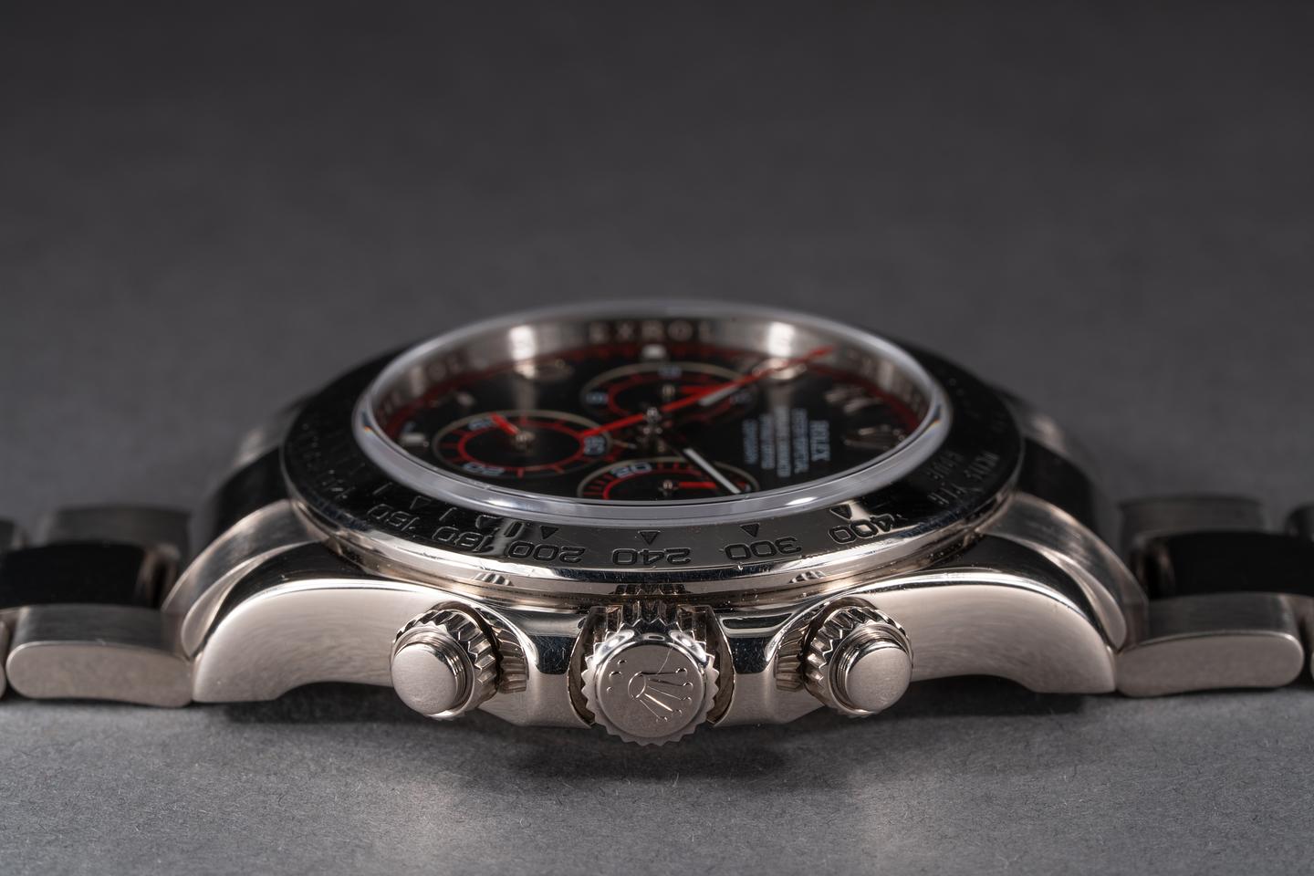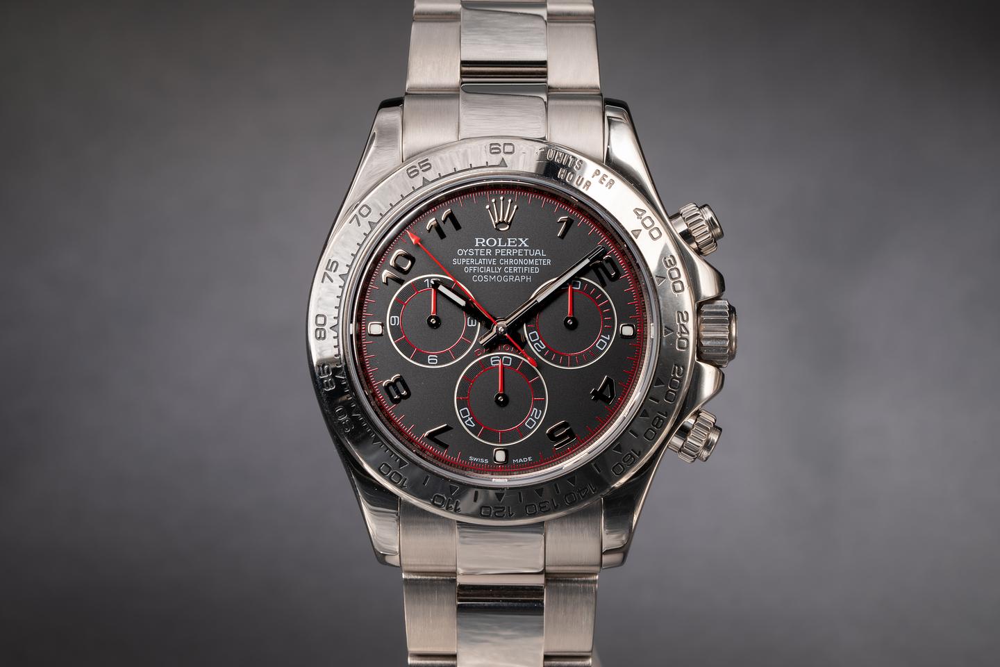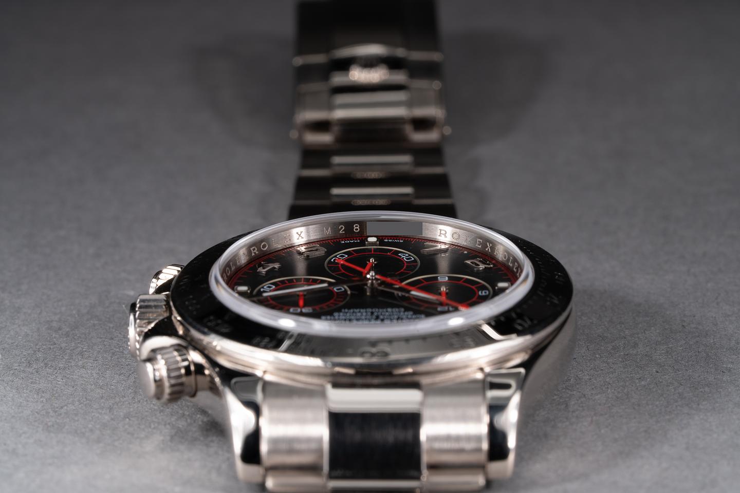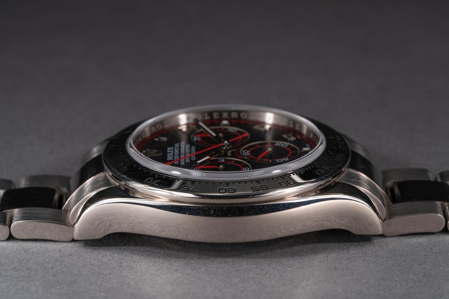 Dial: The black and red racing dial is excellent only very light wear overall. There is one slight imperfection just over the letter E in "chronometer". The original factory hands are matching.