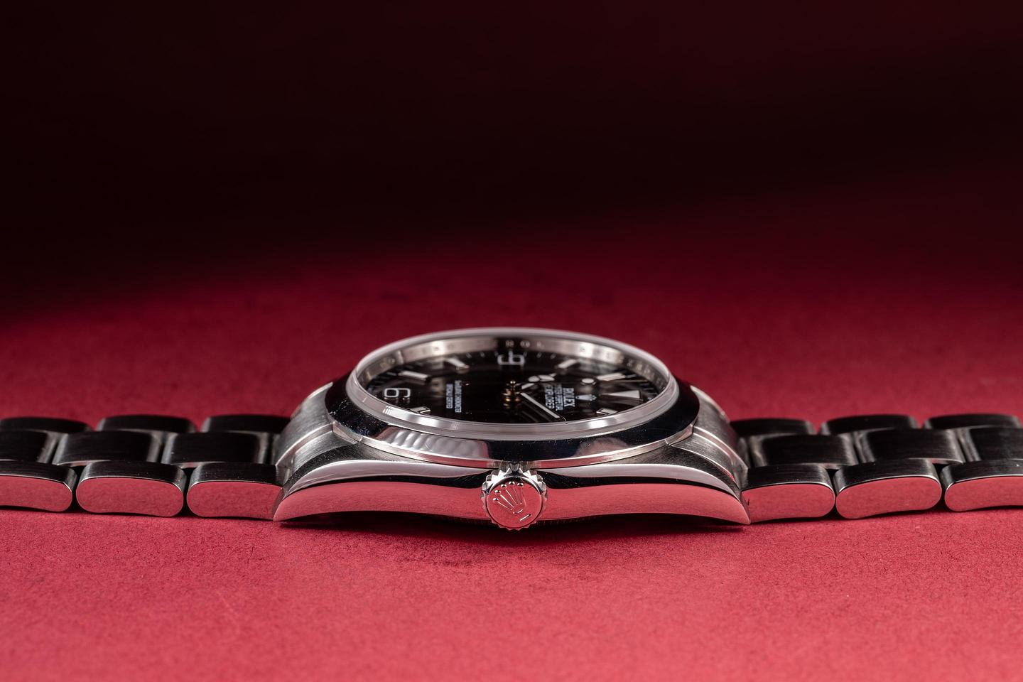 Case: The sharp 36mm case is excellent, showing only very light wear from use. The smooth stainless bezel is also in excellent condition, showing only light wear.
