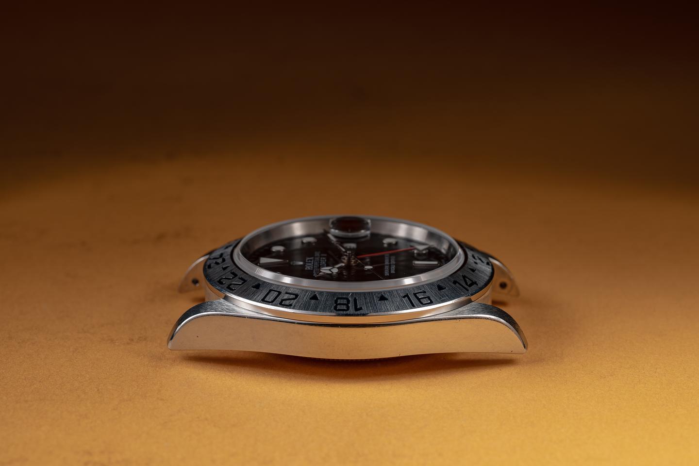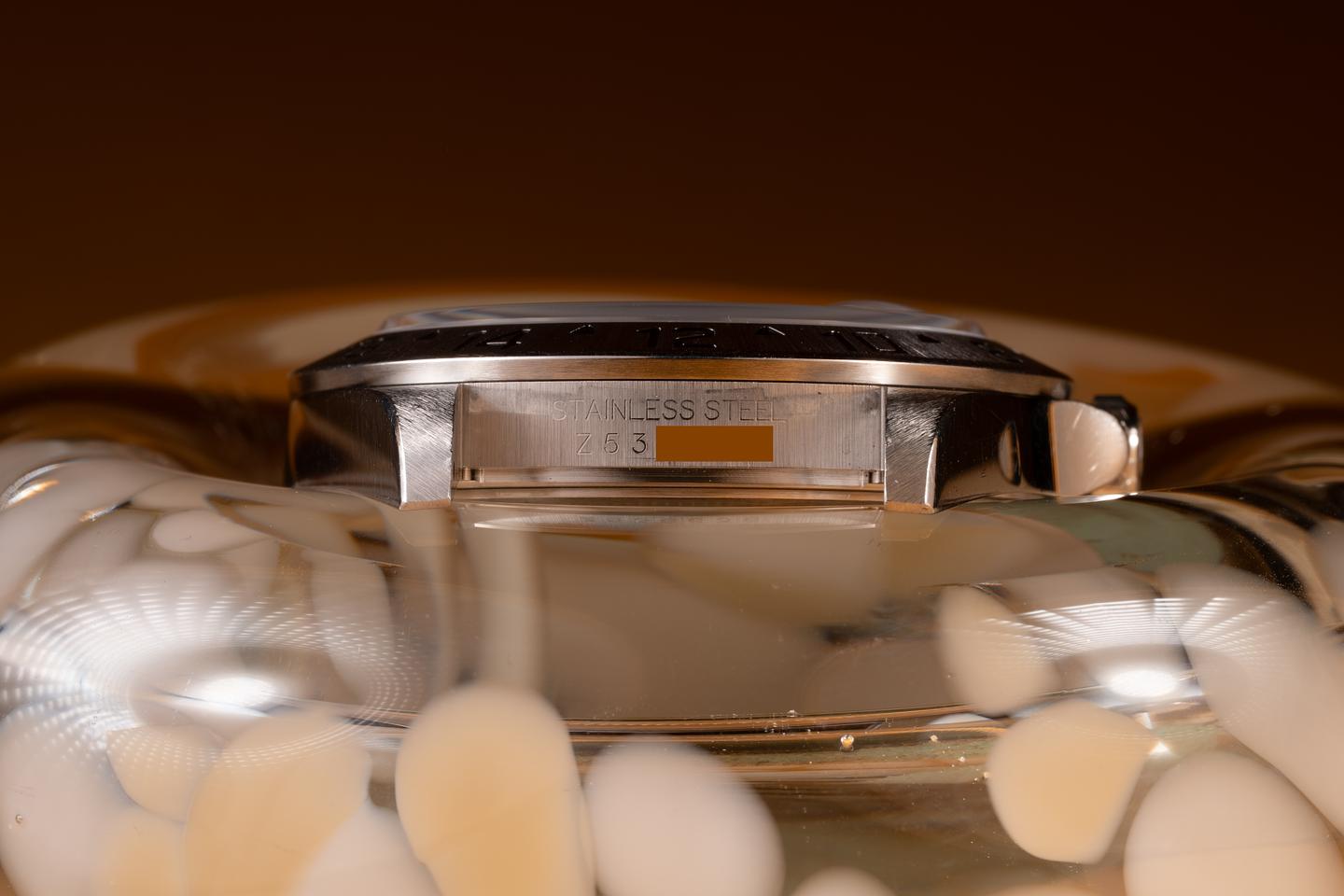 Case: The thick and even no-holes case is excellent, showing sharp, prominent bevels and only very light wear from use. The stainless bezel is also in excellent condition, showing only very light wear from use.