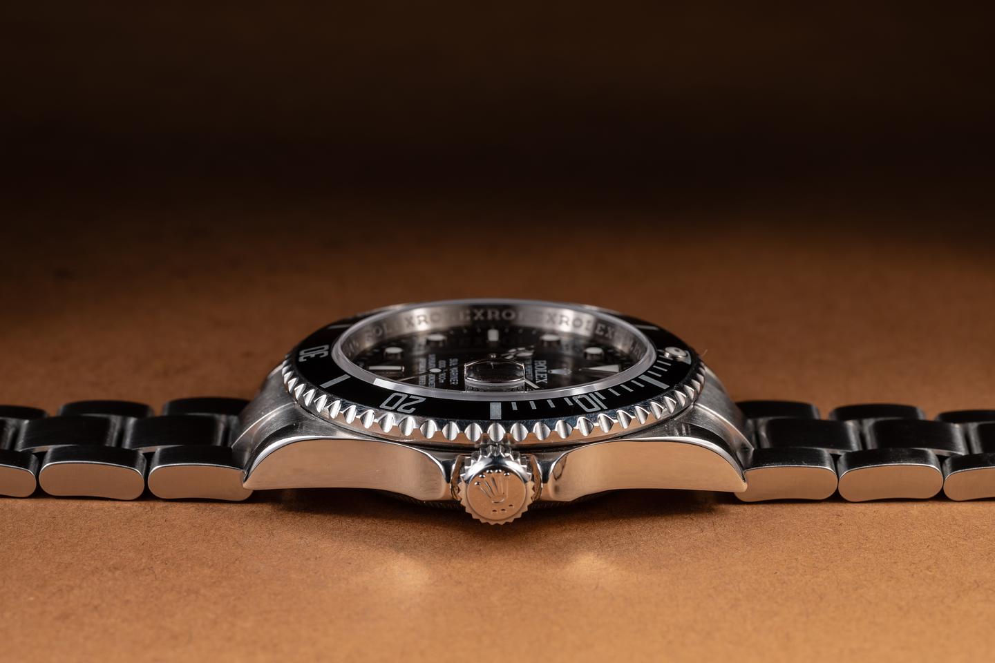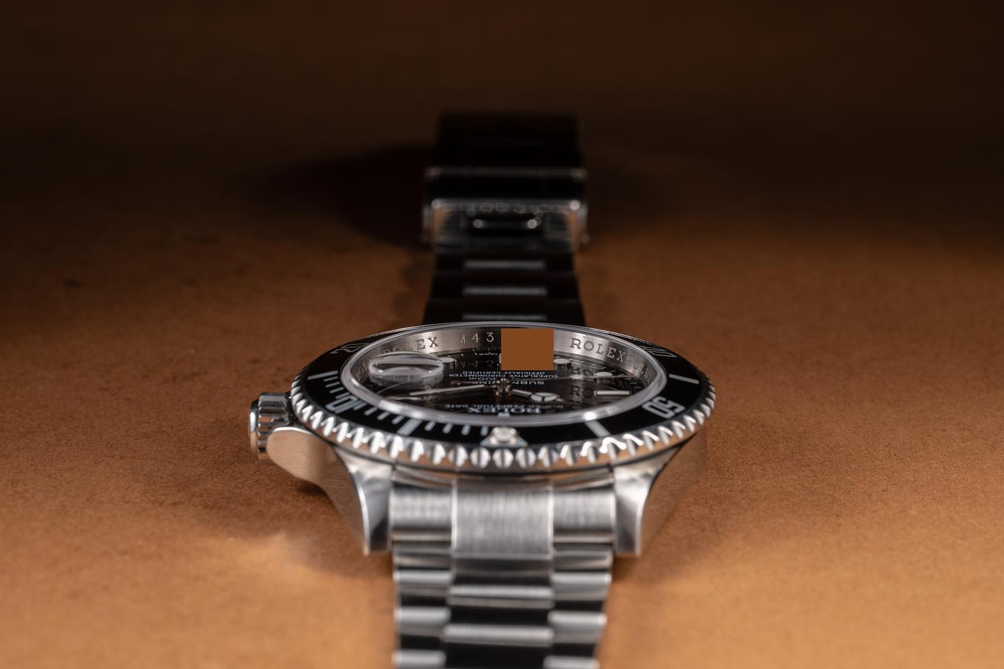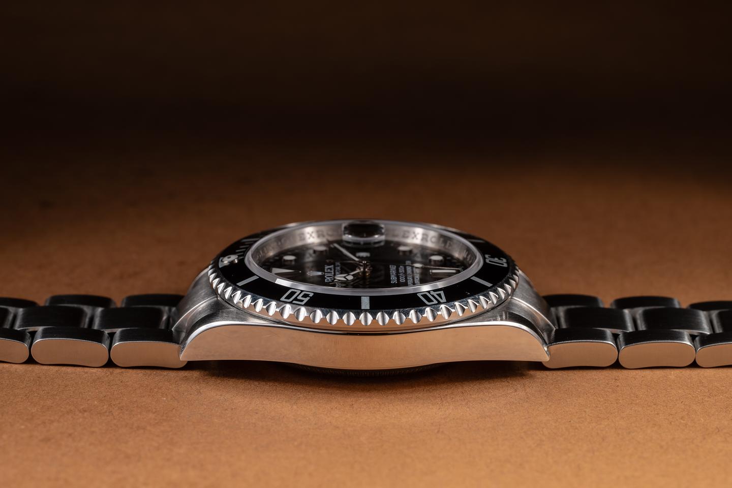 Case: The previously polished case is excellent, showing prominent bevels and some light wear from use. The black bezel insert is also in excellent condition, showing only very light wear from use.