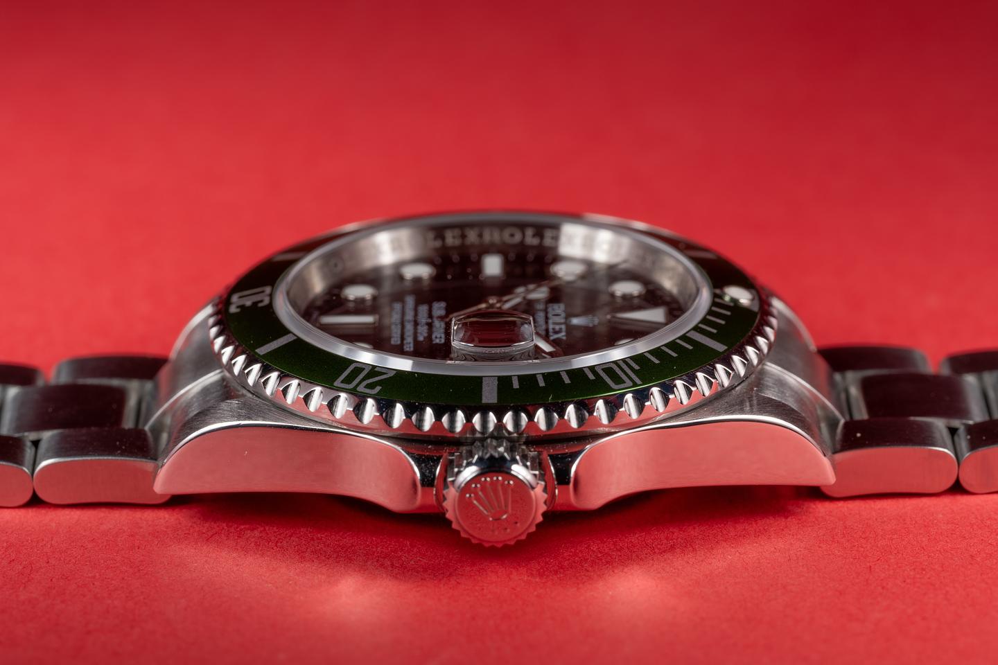 Case: The previously polished case is excellent showing prominent bevels and only light wear from use. The green bezel insert is also in excellent condition showing only very light wear.