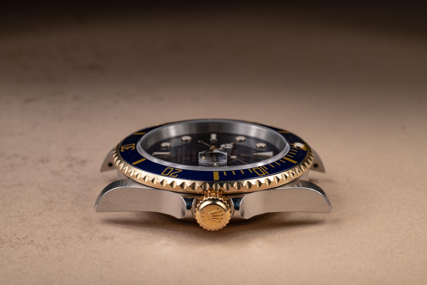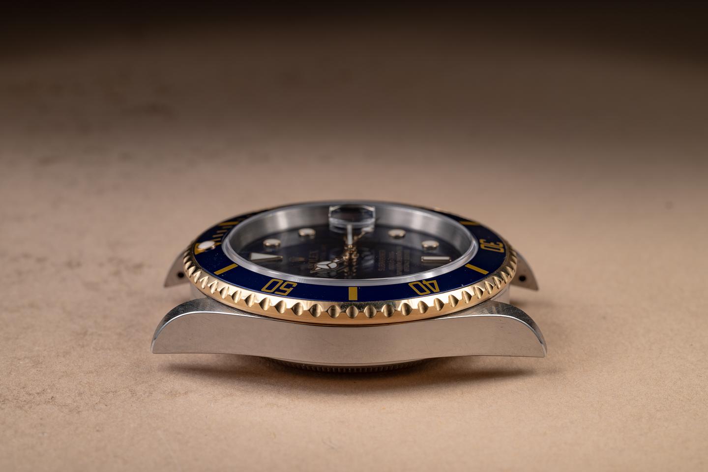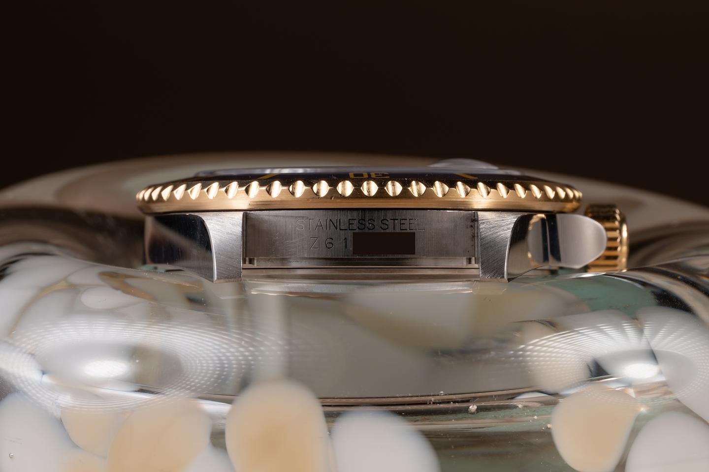 Case: The thick, sharp, and even case is excellent showing only very light wear from use. The 18K yellow gold bezel is also in excellent condition showing only light wear from use. The blue bezel insert is also in excellent condition showing only light wear from use.