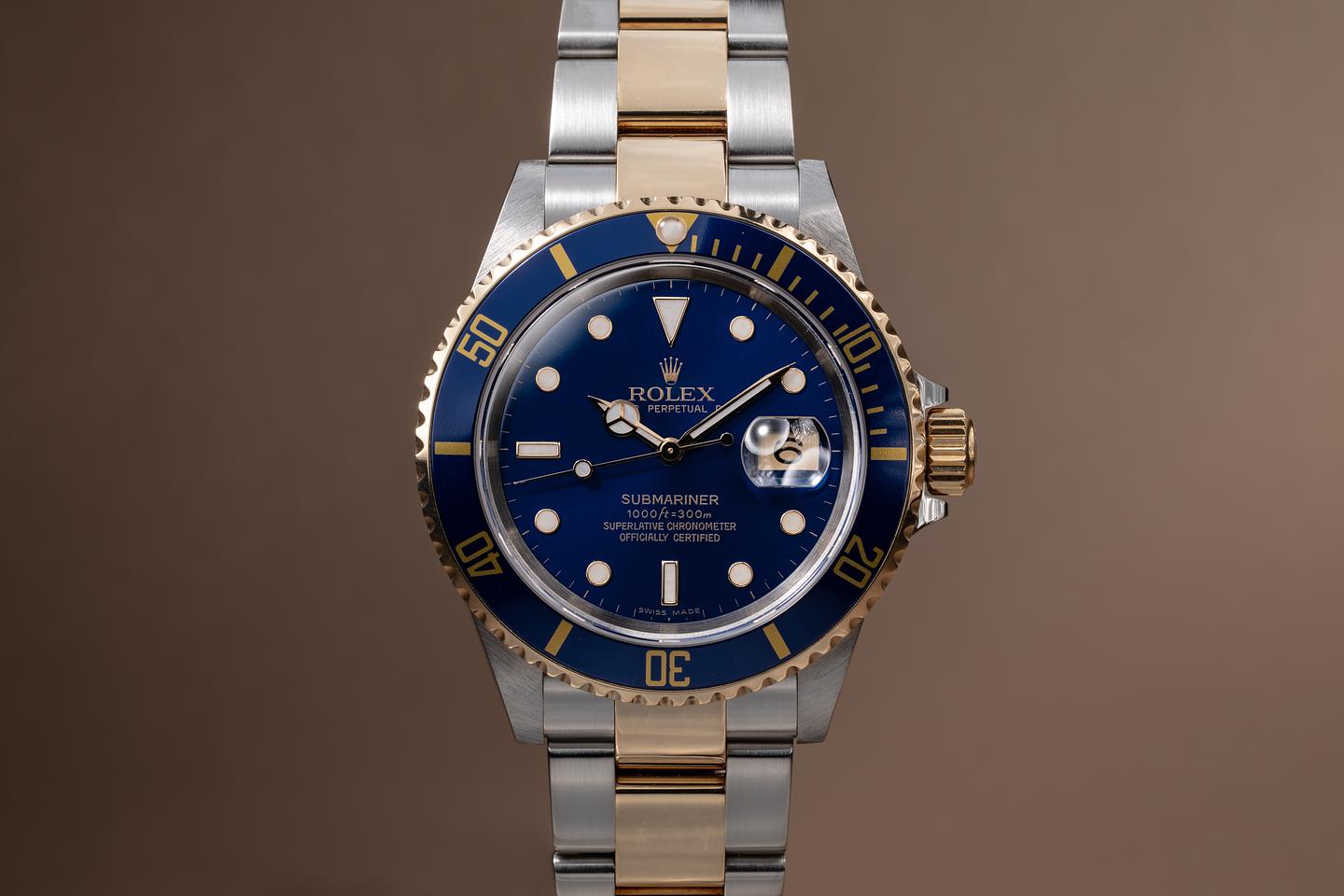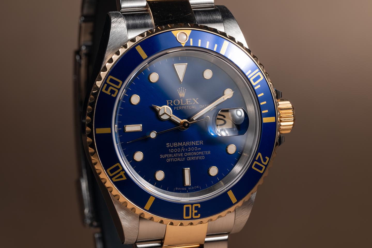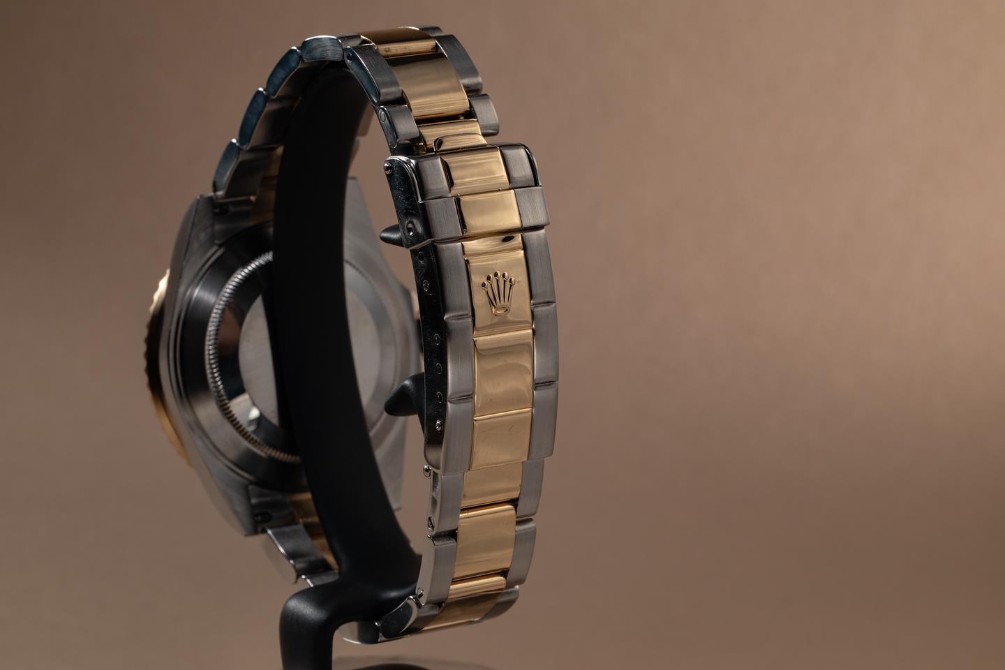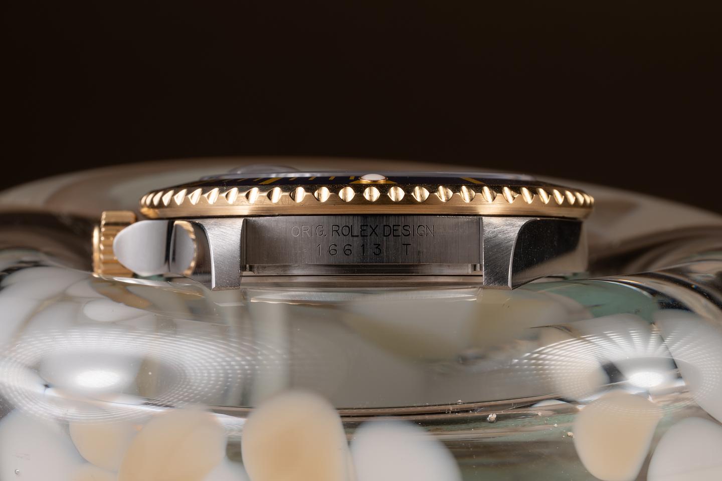 Case: The thick, sharp, and even case is excellent showing only very light wear from use. The 18K yellow gold bezel is also in excellent condition showing only light wear from use. The blue bezel insert is also in excellent condition showing only light wear from use.