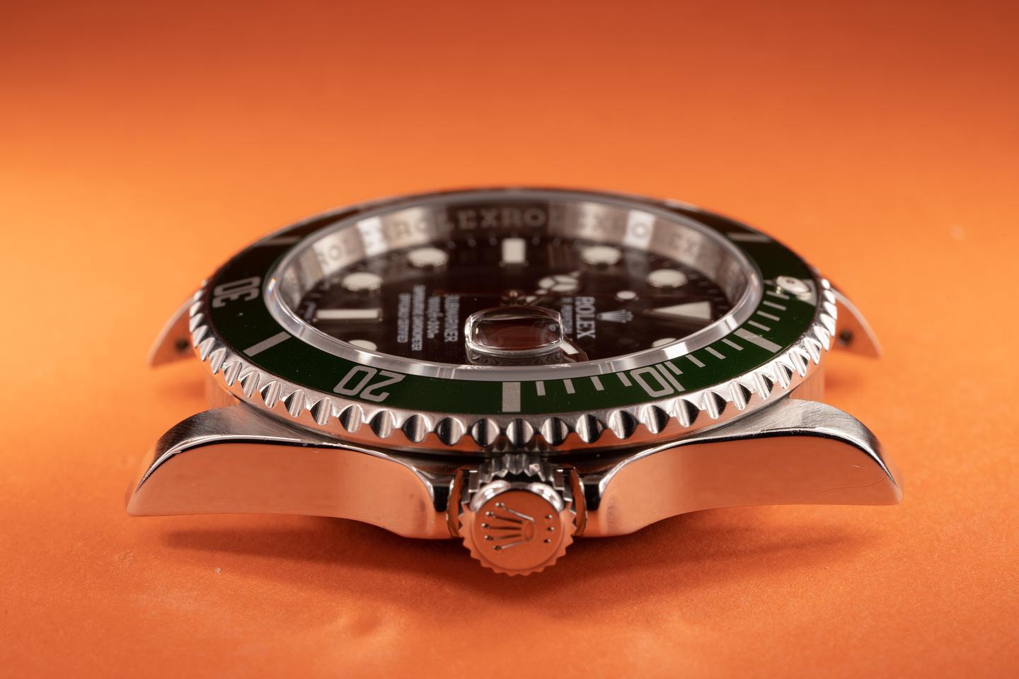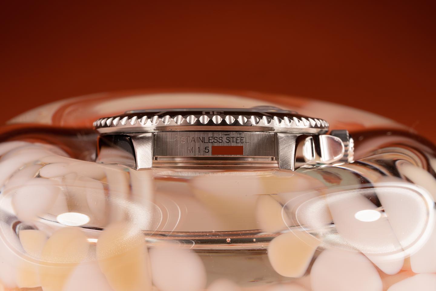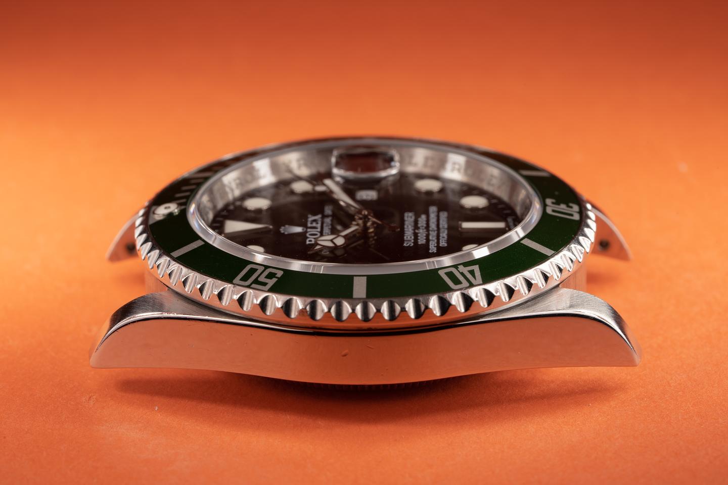Case: The thick and even case is excellent showing only light wear from use. The green MK 4 bezel insert is also excellent showing some light wear from use.