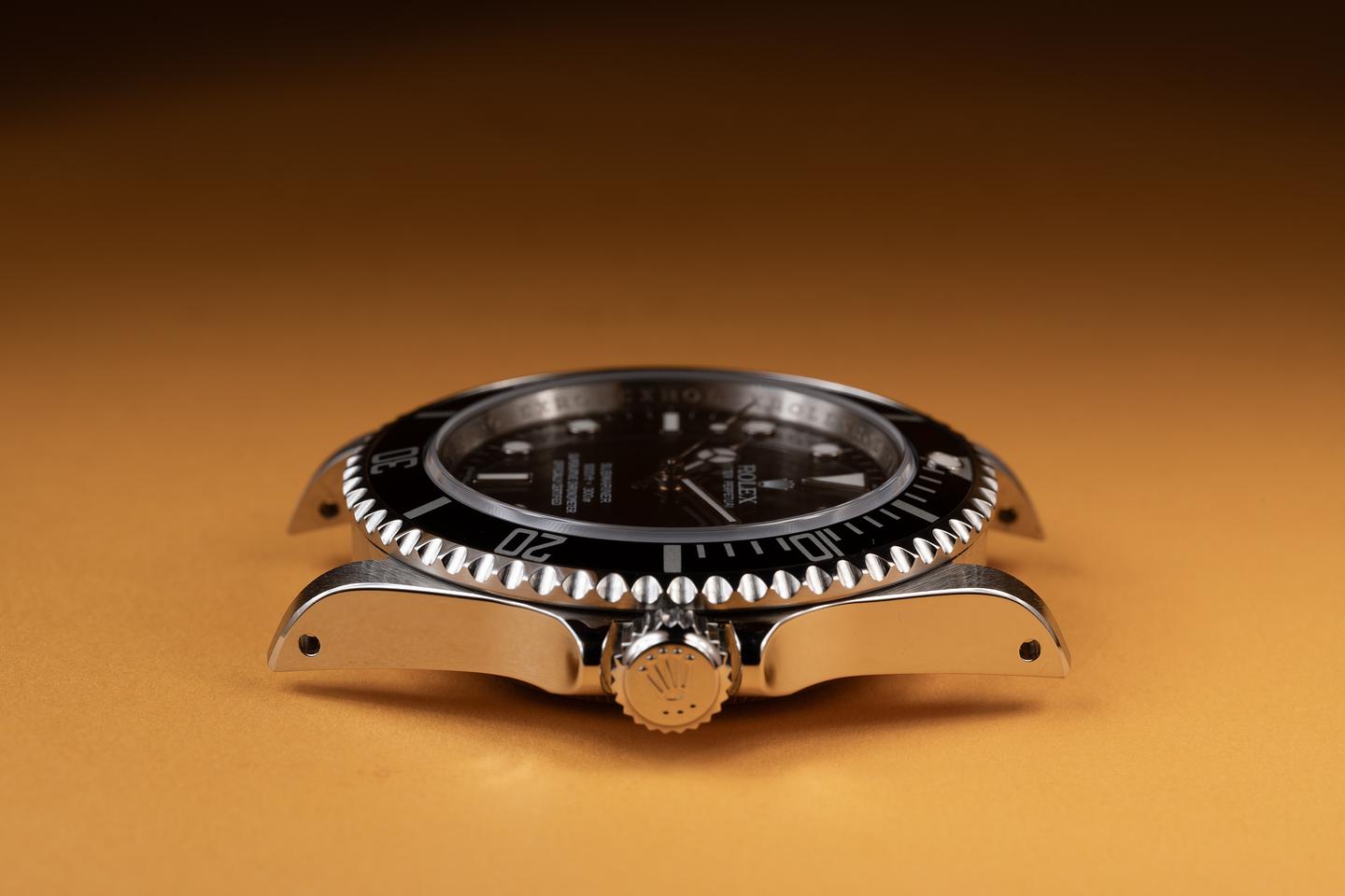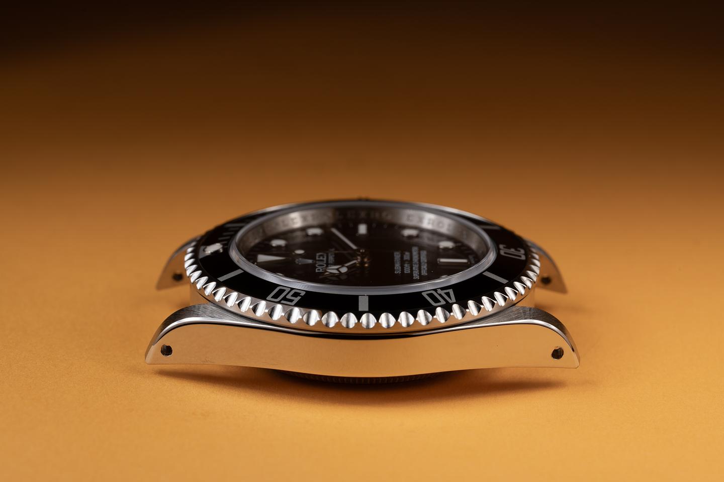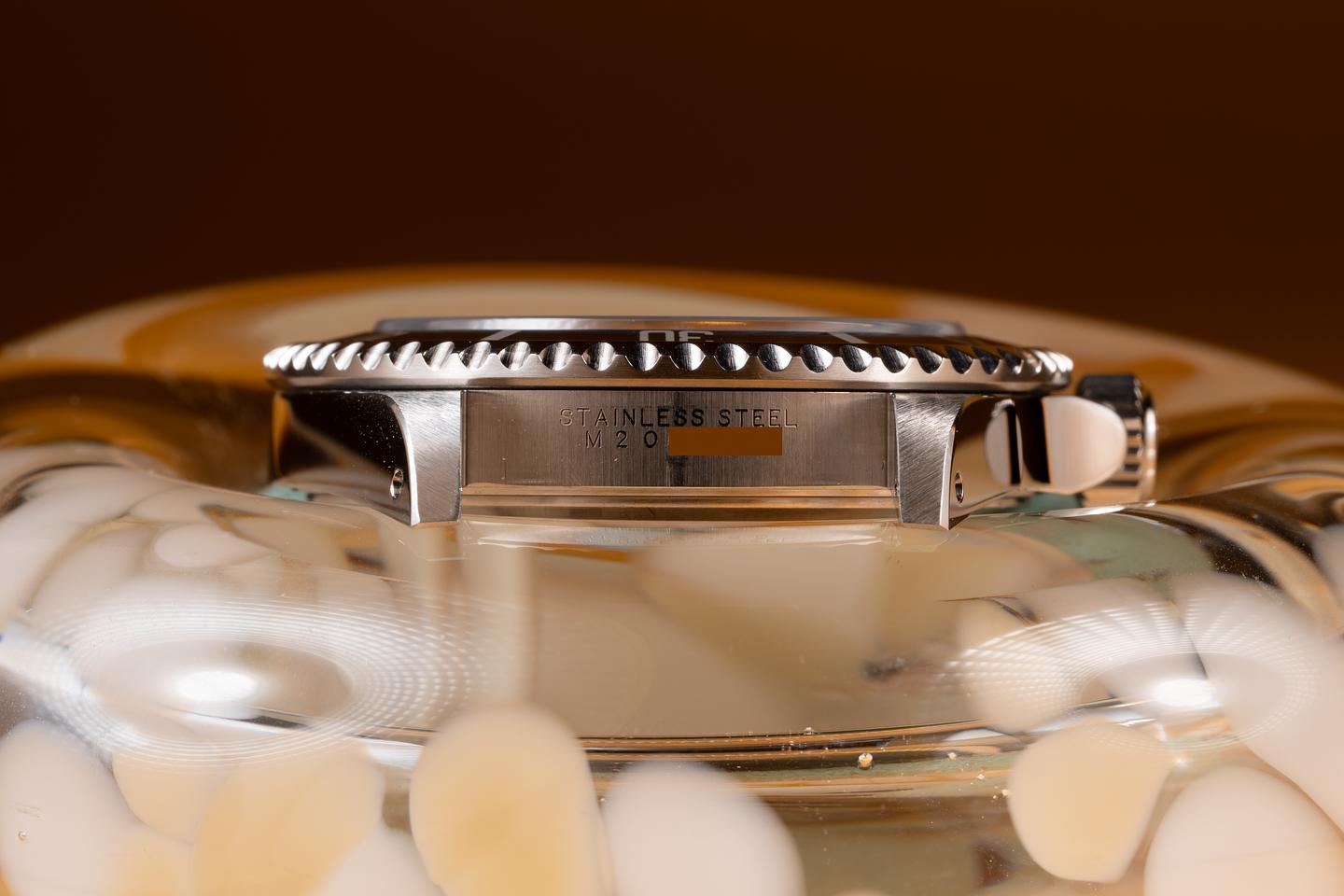 Case: The thick and even case is excellent showing sharp prominent bevels and only very light wear. The black bezel insert is also in excellent condition showing only light wear from use.