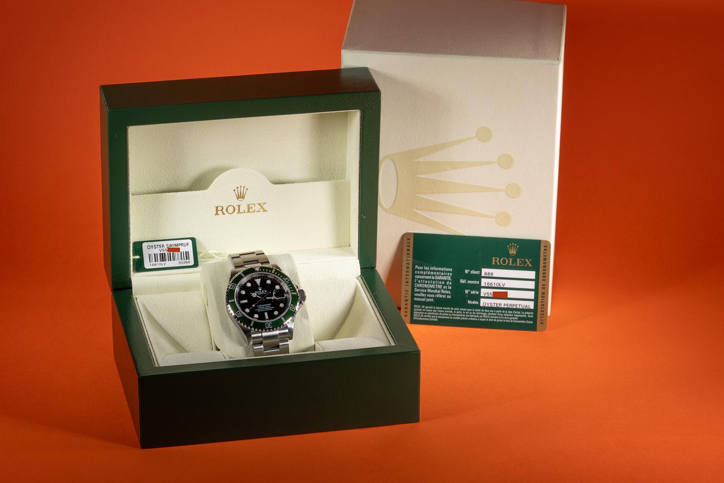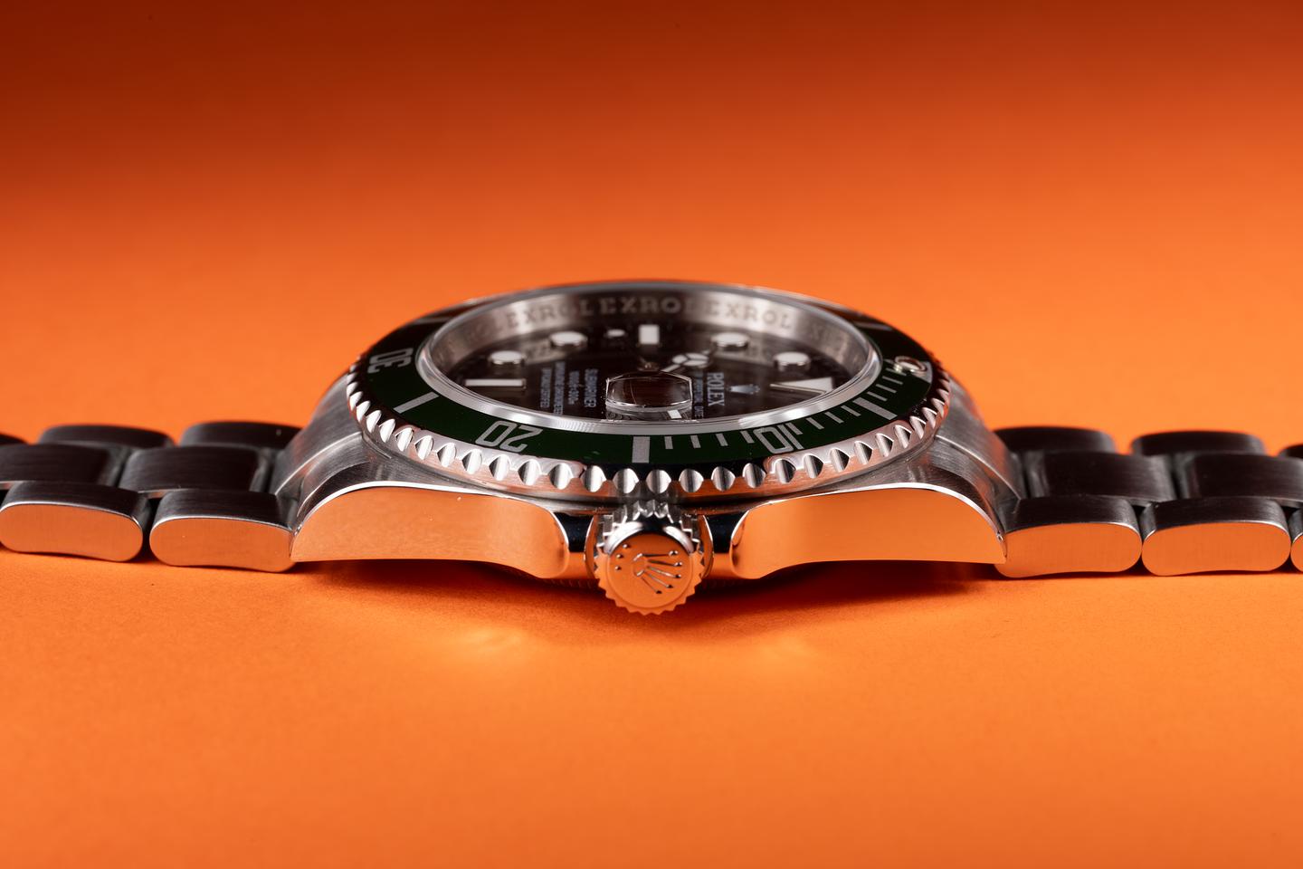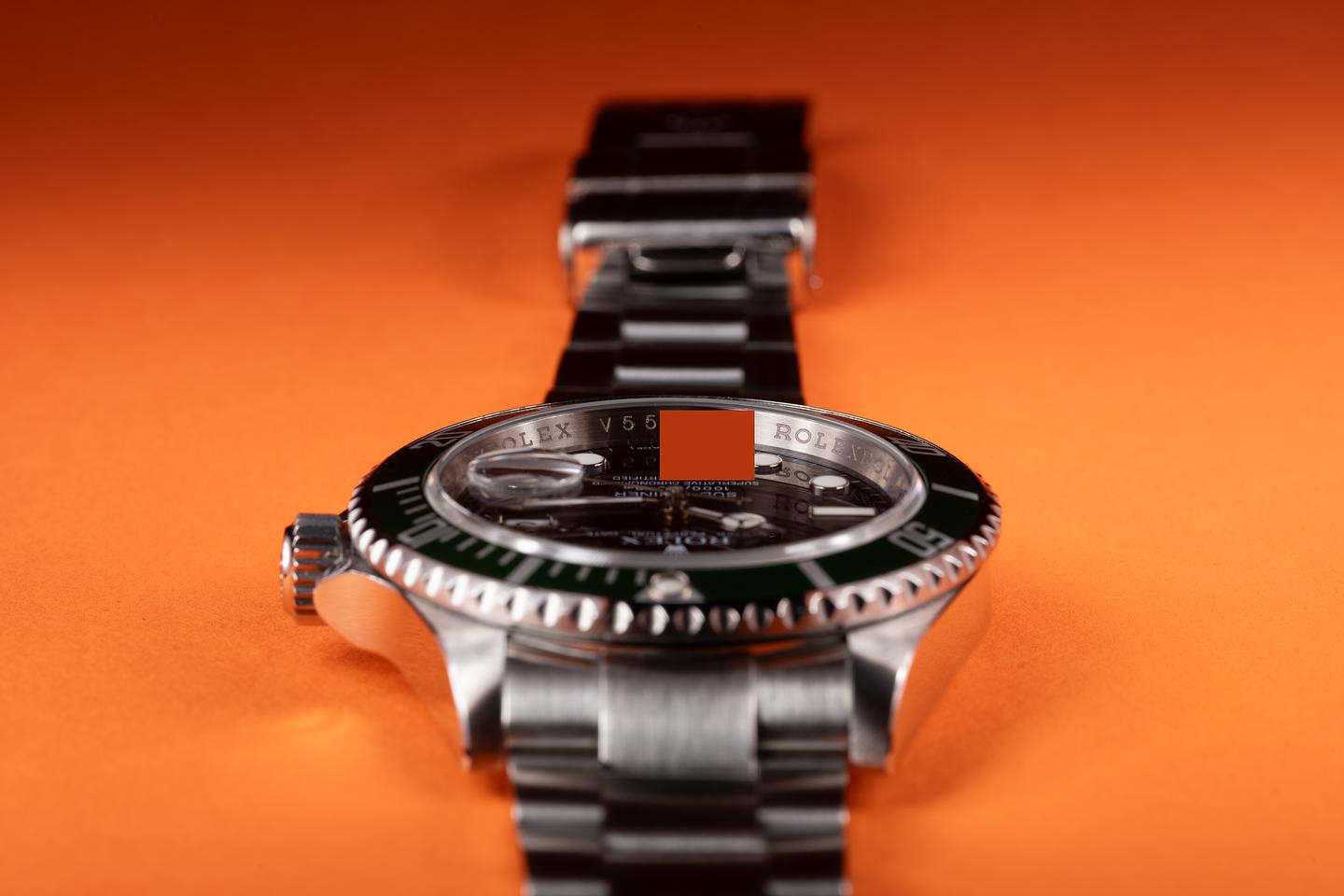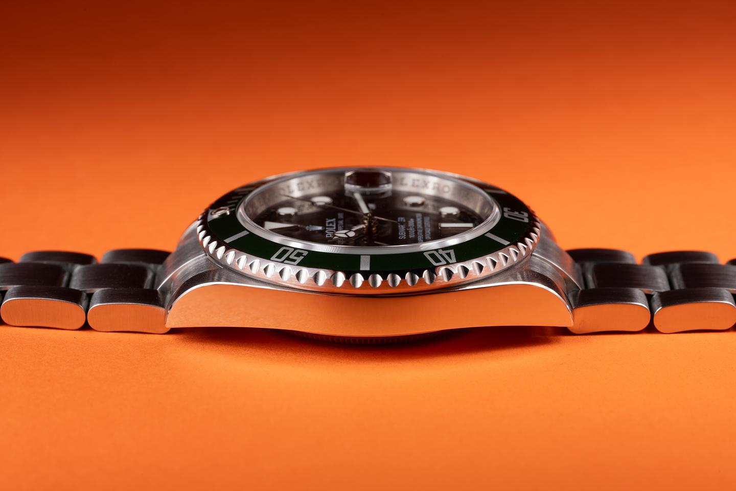 Case: The recently polished case is excellent showing sharp prominent bevels and only very light wear from use. The green bezel insert is also in excellent condition showing only light wear from use.